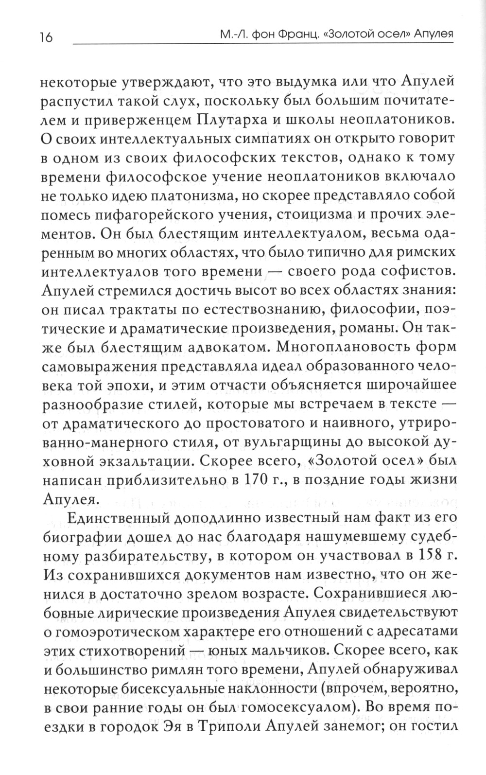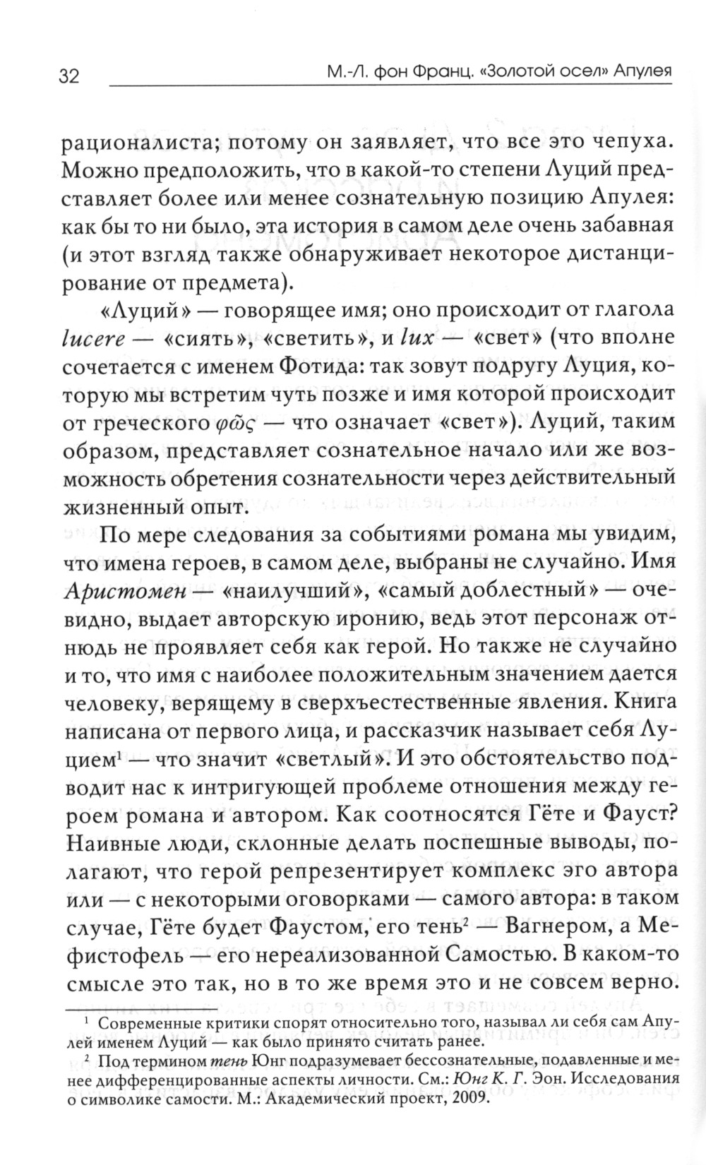 Мария-Луиза фон Франц, пожалуй, самая известная из учеников Карла Густава Юнга. Преданная последовательница юнгианской психологии, фон Франц, опираясь на идеи своего учителя, сумела сформировать свой индивидуальный и узнаваемый почерк, получив широкую известность в качестве главного пионера в методе психологического толкования фольклорных и мифологических сюжетов. Основополагающая идея юнгианства, которая состоит в различении коллективного и индивидуального бессознательного, а также установлении параллели между ними, становится подспорьем для исследовательского метода фон Франц, обращающейся к фольклорному материалу как продукту коллективного бессознательного и проводящей аналогию между аллегорическими образами и сюжетами, с одной стороны, и проблемами, знакомыми нам из действительного опыта, - с другой. Пожалуй, одна из ключевых проблем, находившихся в фокусе ее научных интересов, была связана с процессом личностного становления (так называемым «процессом инициации»), а также ролью любви в этом процессе. Именно этот вопрос становится центральным в лекционном курсе, посвященном произведению позднеантичного писателя Апулея из Мадавры «Золотой осел», который был прочитан М.-Л. фон Франц в цюрихском Институте им. К.Г. Юнга в 1966 г. и на материале которого основывается текст настоящей книги. Написанный ярким, красочным языком, этот текст, несомненно, будет интересен не только специалистам и учащимся, но также и широкому кругу читателей.| Издательство | Академический проект |