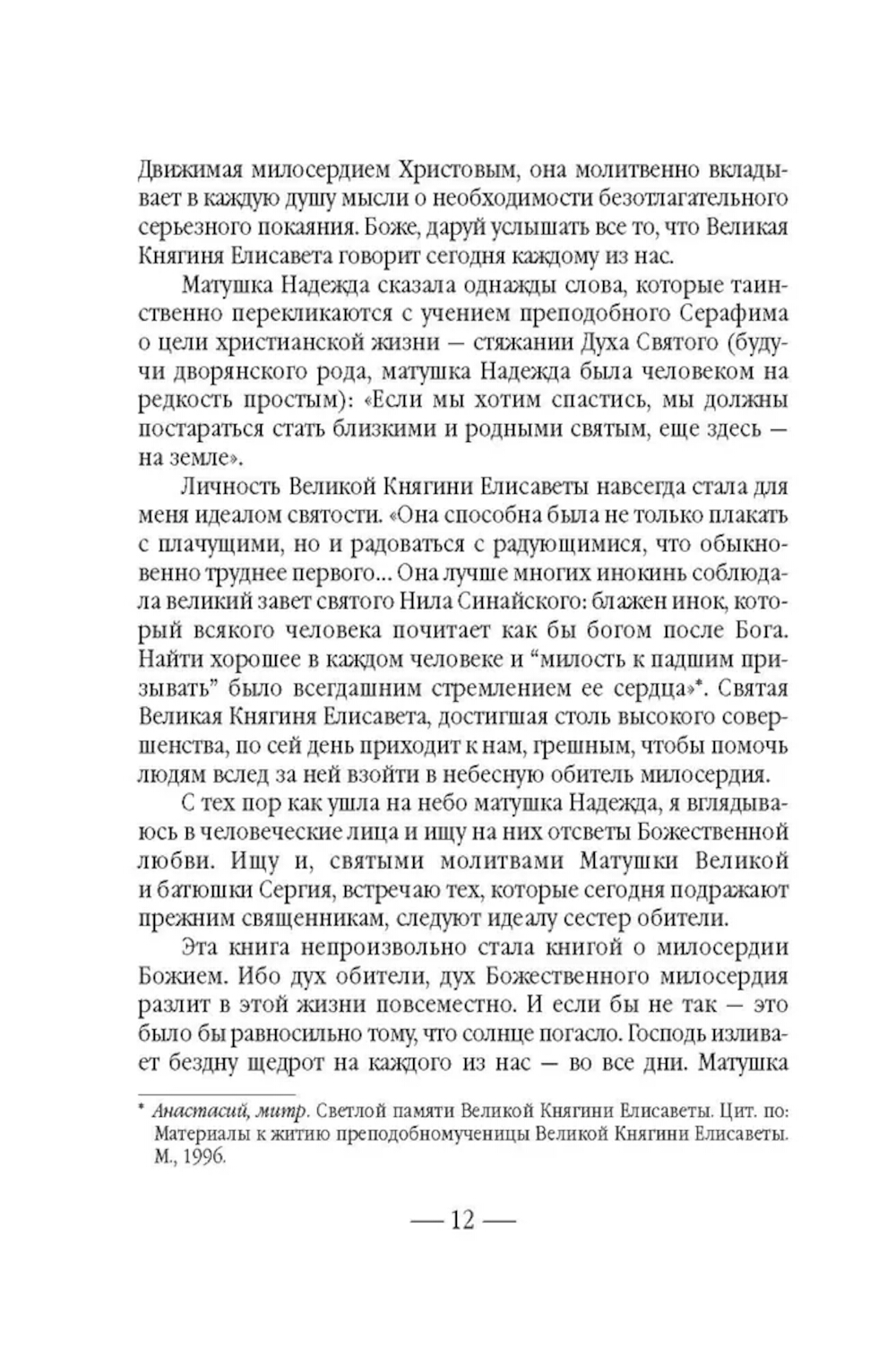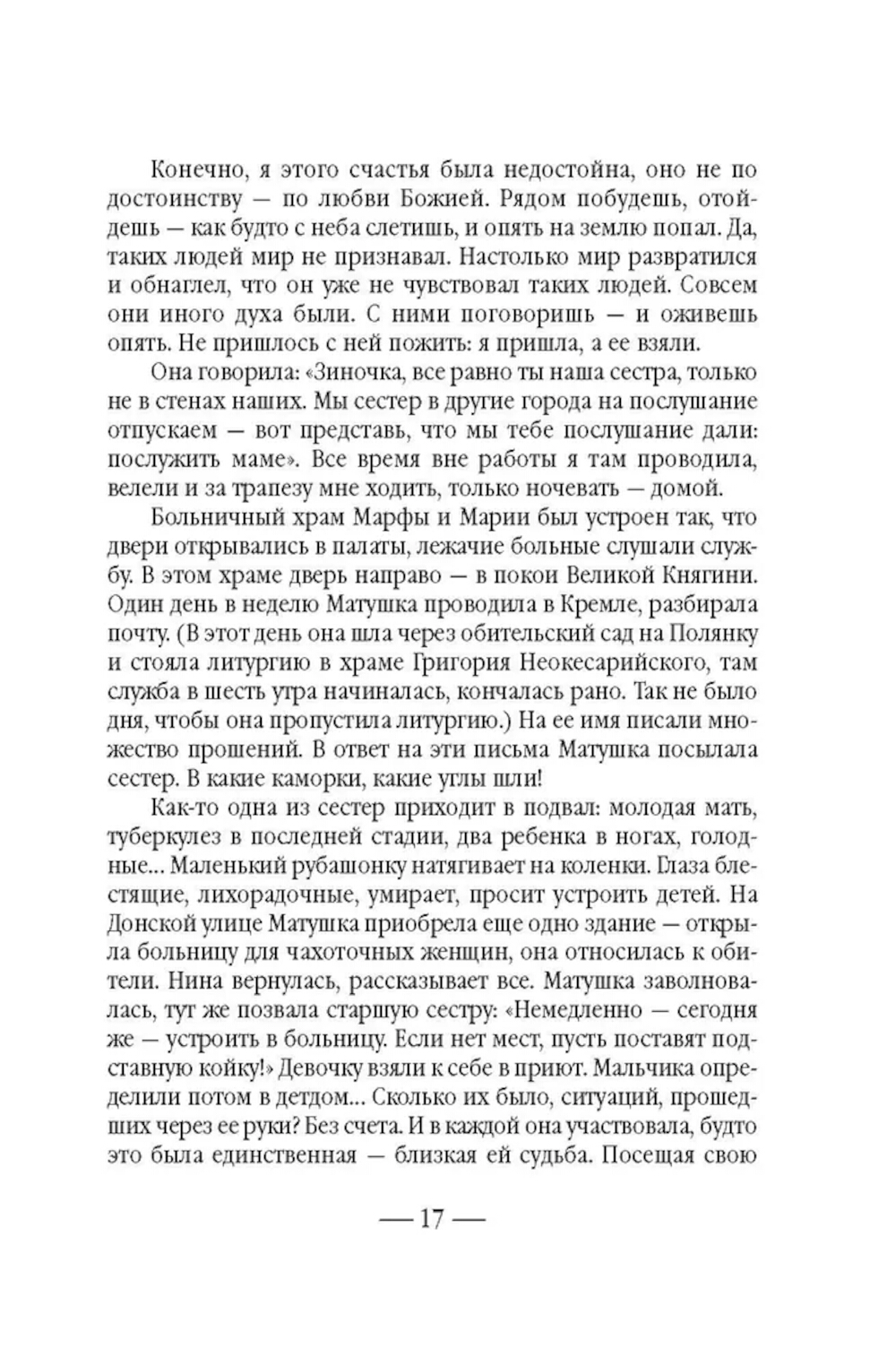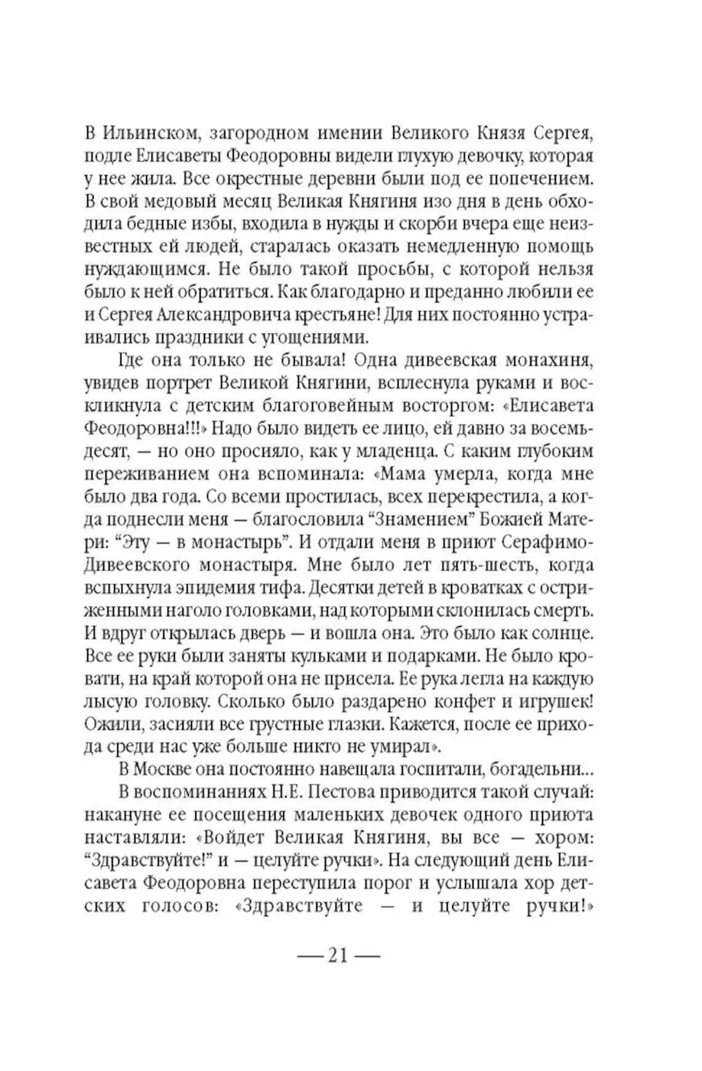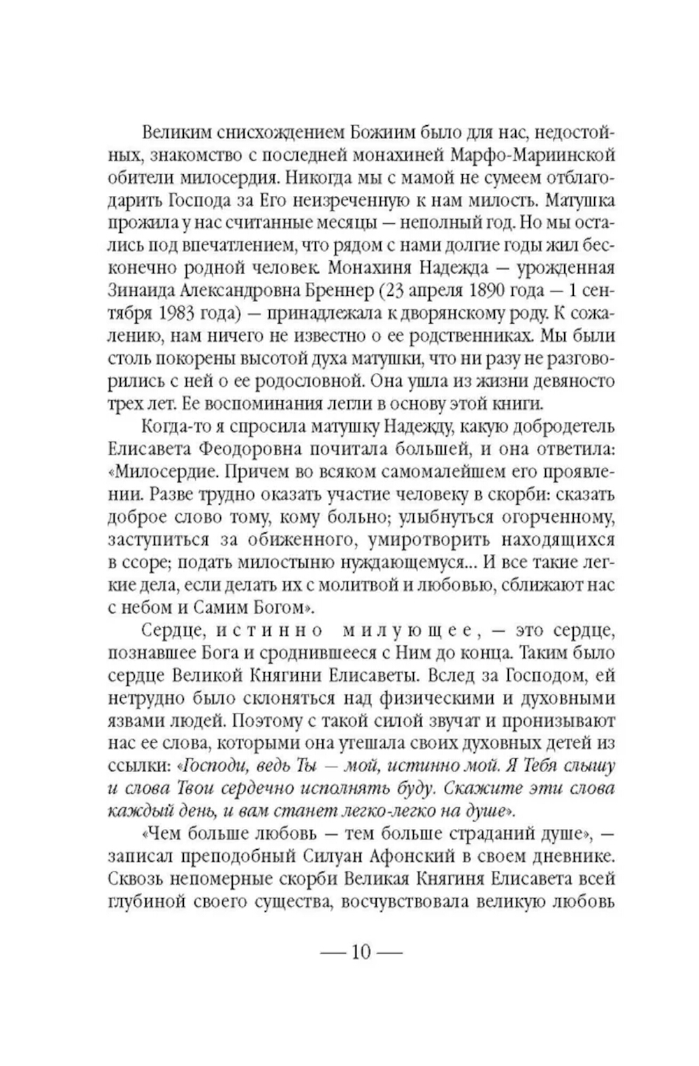 Не всякому поколению суждено встретить на своем пути такой благословенный дар неба, каким явилась Великая Княгиня Елисавета Феодоровна... После смерти супруга - Великого Князя Сергея Александровича Романова, убитого в 1905 году террористом Каляевым, - она основала в Замоскворечье, на Большой Ордынке, первую в России обитель милосердия. В ней разместились бесплатные больница, амбулатория, аптека и столовая для бедных, приют для девочек-сирот, общежитие для сестер, два храма, воскресная школа и обширная библиотека. После революции Великая Княгиня отказалась покинуть Россию, была арестована и 18 июля 1918 года живьем сброшена в шахту близ города Алапаевска. Созданная ею Марфо-Мариинская обитель милосердия просуществовала до 1926 года. Возрождение обители началось в 1992 году, когда постановлением столичного правительства архитектурный комплекс был передан Московской Патриархии. Судя по воспоминаниям, которые оставила нам последняя настоятельница Марфо-Мариинской обители и которые вошли в эту книгу, матушке Надежде повезло, - она близко знала Елисавету Феодоровну. Когда монахиню спросили о том, какую добродетель Елисавета Феодоровна считала важной, та ответила: «Милосердие». Эта книга посвящена главному делу жизни святой преподобномученицы, Великой Княгини Елисаветы - обители, которая и сегодня зовет служить милосердию каждого из нас - каждого живущего на земле человека.| Издательство | Сибирская благозвонница** |