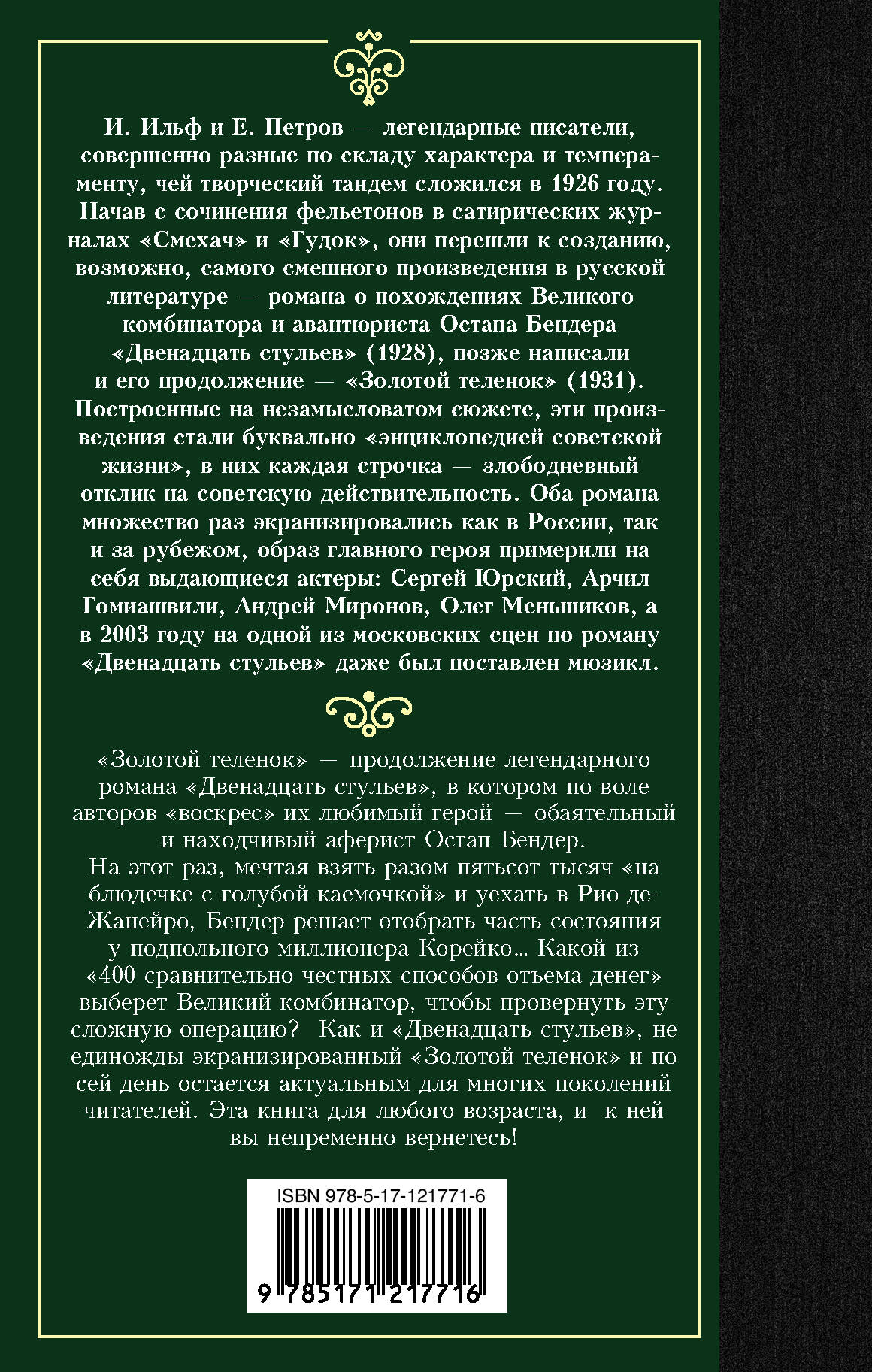 "Золотой телёнок" - продолжение легендарного романа "Двенадцать стульев", в котором по воле авторов "воскрес" их любимый герой - обаятельный и находчивый аферист Остап Бендер. На этот раз, мечтая взять разом пятьсот тысяч "на блюдечке с голубой каемочкой" и уехать в Рио-де-Жанейро, Бендер решает отобрать часть состояния у подпольного миллионера Корейко… Какой из "400 сравнительно честных способов отъема денег" выберет великий комбинатор, чтобы провернуть эту сложную операцию? Как и "Двенадцать стульев", не единожды экранизированный, "Золотой телёнок" и по сей день остается актуальным для многих поколений читателей. Это книга для любого возраста, и к ней вы непременно вернетесь!| Издательство | Издательство "АСТ" |