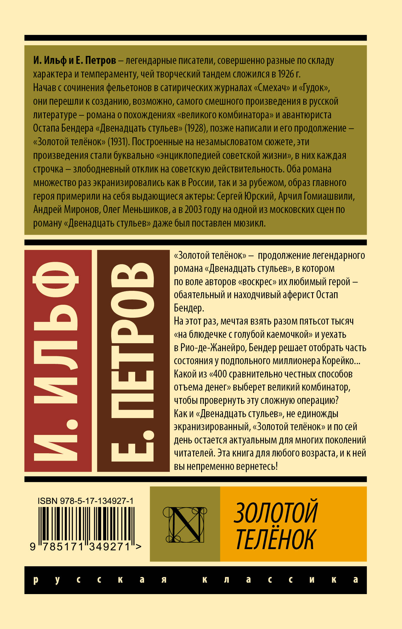 "Золотой телёнок" - продолжение легендарного романа "Двенадцать стульев", в котором по воле авторов "воскрес" их любимый герой - обаятельный и находчивый аферист Остап Бендер. На этот раз, мечтая взять разом пятьсот тысяч "на блюдечке с голубой каемочкой" и уехать в Рио-де-Жанейро, Бендер решает отобрать часть состояния у подпольного миллионера Корейко… Какой из "400 сравнительно честных способов отъема денег" выберет великий комбинатор, чтобы провернуть эту сложную операцию? Как и "Двенадцать стульев", не единожды экранизированный, "Золотой телёнок" и по сей день остается актуальным для многих поколений читателей. Это книга для любого возраста, и к ней вы непременно вернетесь!| Издательство | ИЗДАТЕЛЬСТВО "АСТ" |