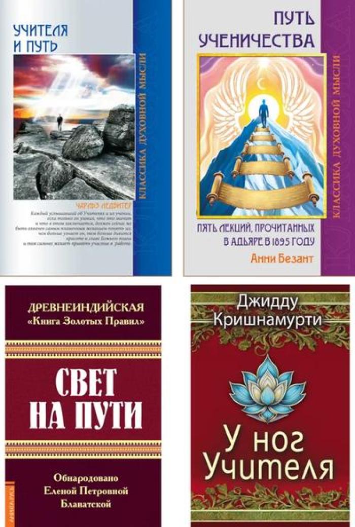 Этот комплект - целая библиотека пути ученичества: «Путь ученичества»; «Свет на пути»; «У ног учителя»; «Учителя и путь». Анни Безант объясняет, как современный человек может идти дорогой Карма-йоги и медитации. Е. П. Блаватская в «Книге золотых правил» передаёт древние буддийские наставления освобождения. Юный Кришнамурти доносит слова Учителя о различении, бесстрастии и любви. А Чарльз Ледбитер раскрывает облик самих Учителей и этапы, ведущие к их признанию. Вместе эти книги образуют единое целое - путеводитель по духовному пути, на котором встречаются Учитель и ученик.| Издательство | Амрита-Русь |