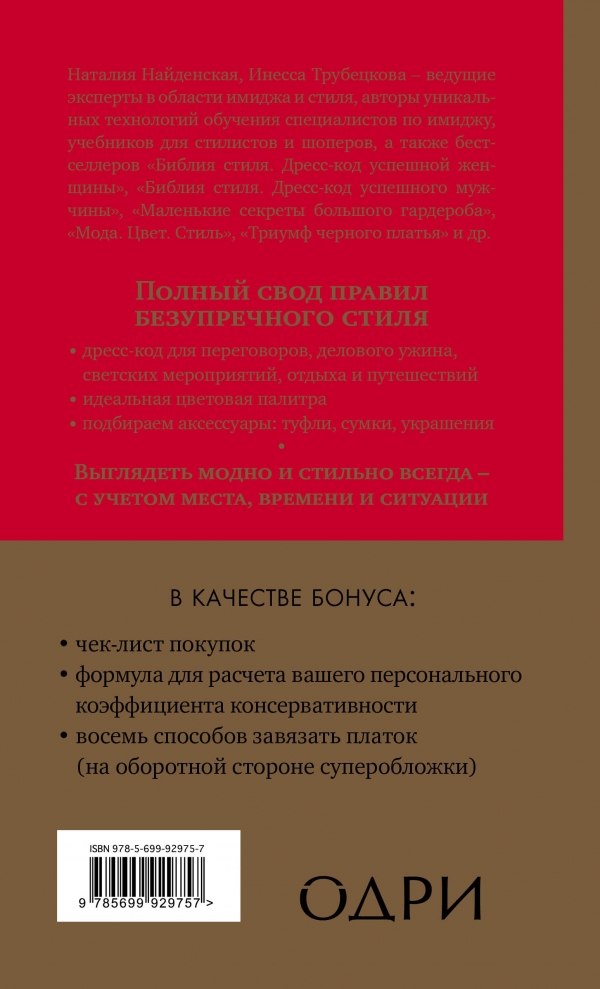 Эта книга - полный свод правил безупречного стиля для деловой женщины. Вы узнаете, какой костюм надеть для переговоров, встреч с клиентами, презентаций, деловых ужинов, светских мероприятий, отдыха и путешествий - в зависимости от страны вашего пребывания. Как правильно подобрать аксессуары - сумку, туфли, украшения - в зависимости от ситуации и статуса. В качестве бонуса - чек-лист покупок, формула для расчета вашего персонального коэффициента консервативности и восемь способов завязывания платка со схемами (на оборотной стороне суперобложки).