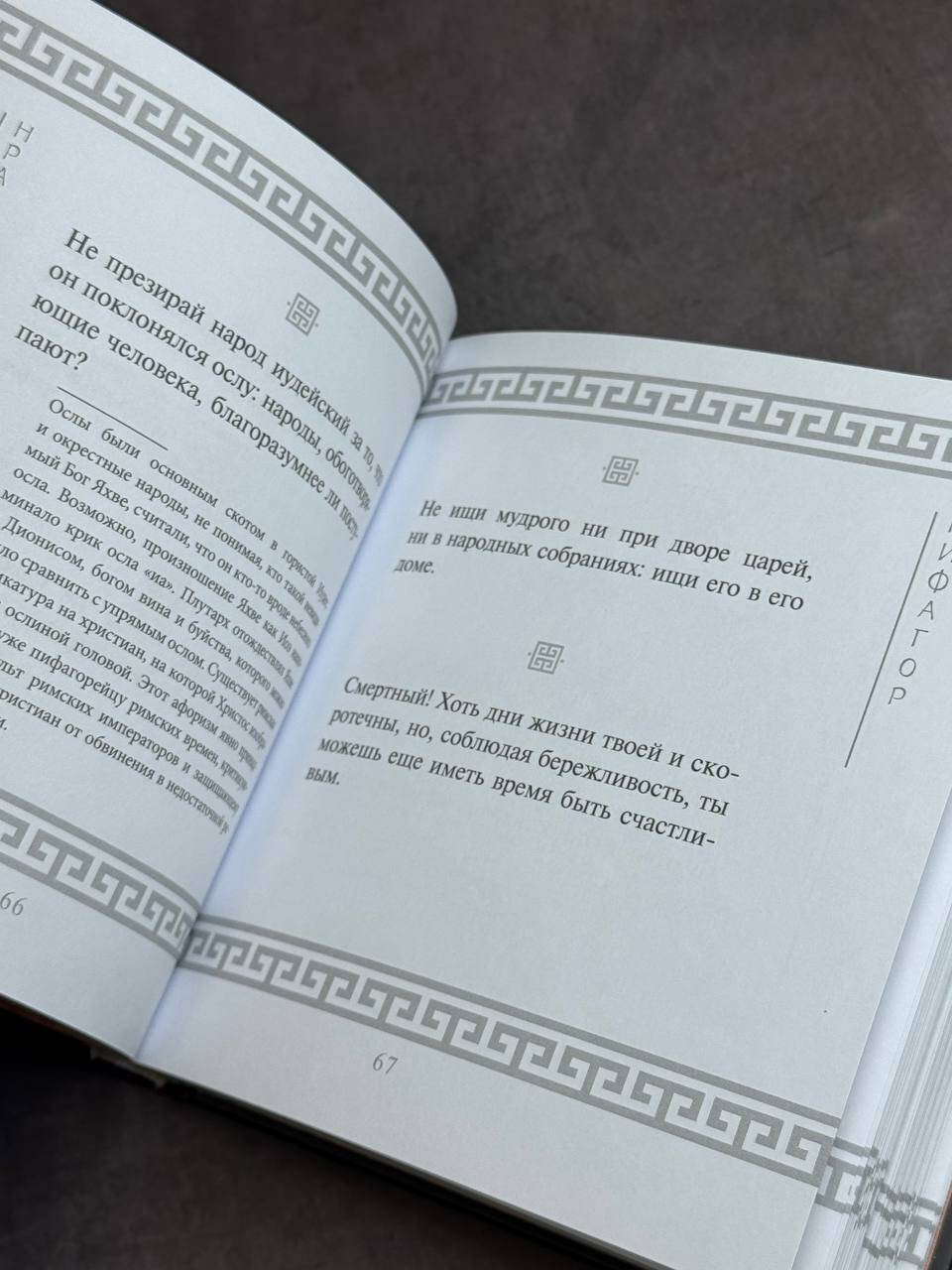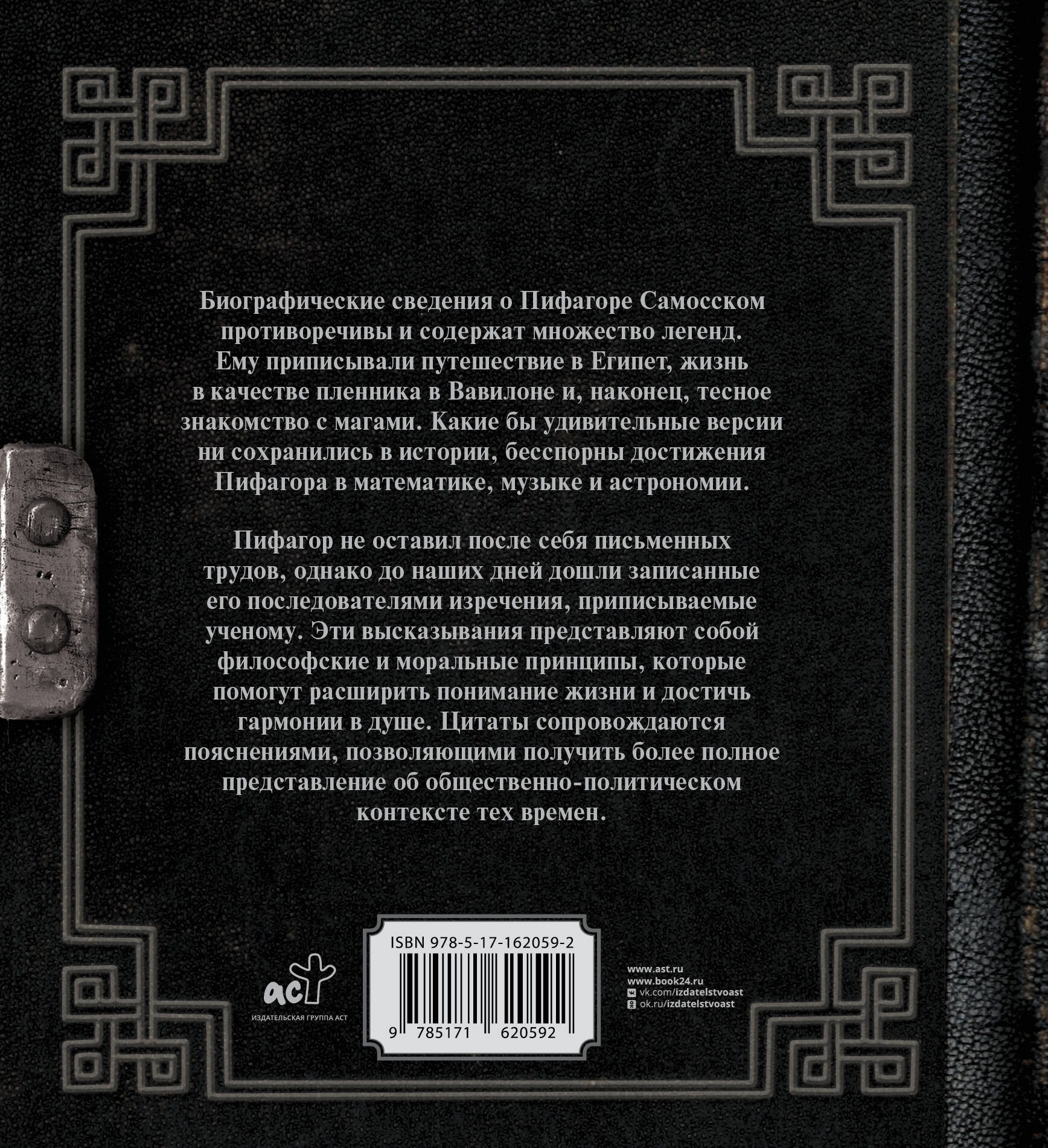 Биографические сведения о Пифагоре Самосском противоречивы и содержат множество легенд. Ему приписывали путешествие в Египет, жизнь в качестве пленника в Вавилоне и, наконец, тесное знакомство с магами. Какие бы удивительные версии ни сохранились в истории, бесспорны достижения Пифагора в математике, музыке и астрономии. Пифагор не оставил после себя письменных трудов, однако до наших дней дошли записанные его последователями изречения, приписываемые ученому. Эти высказывания представляют собой философские и моральные принципы, которые помогут расширить понимание жизни и достичь гармонии в душе. Цитаты сопровождаются пояснениями, позволяющими получить более полное представление об общественно-политическом контексте тех времен.| Издательство | Издательство "АСТ" |
