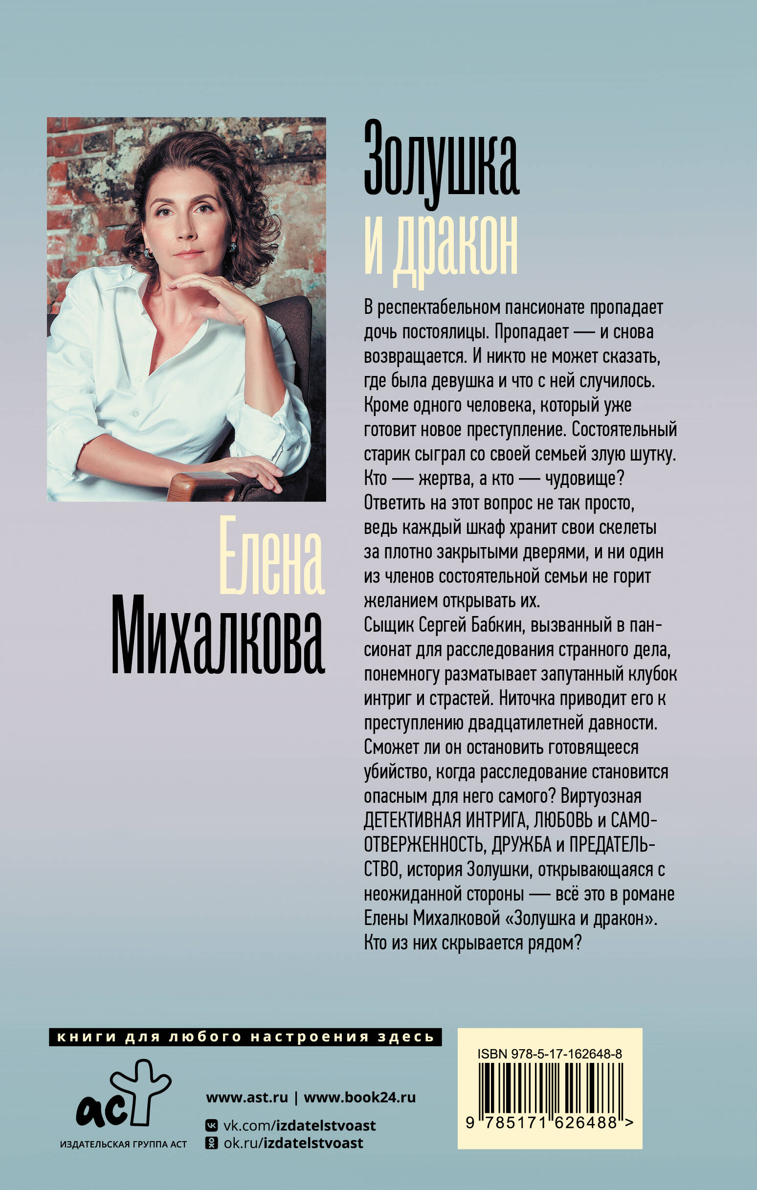 В респектабельном пансионате пропадает дочь постоялицы. Пропадает - и снова возвращается. И никто не может сказать, где была девушка и что с ней случилось. Кроме одного человека, который уже готовит новое преступление. Состоятельный старик сыграл со своей семьей злую шутку. Кто - жертва, а кто - чудовище? Ответить на этот вопрос не так просто, ведь каждый шкаф хранит свои скелеты за плотно закрытыми дверями, и ни один из членов состоятельной семьи не горит желанием открывать их. Сыщик Сергей Бабкин, вызванный в пансионат для расследования странного дела, понемногу разматывает запутанный клубок интриг и страстей. Ниточка приводит его к преступлению двадцатилетней давности. Сможет ли он остановить готовящееся убийство, когда расследование становится опасным для него самого? Виртуозная ДЕТЕКТИВНАЯ ИНТРИГА, ЛЮБОВЬ и САМООТВЕРЖЕННОСТЬ, ДРУЖБА и ПРЕДАТЕЛЬСТВО, история Золушки, открывающаяся с неожиданной стороны - все это в романе Елены Михалковой "Золушка и Дракон". Кто из них скрывается рядом?