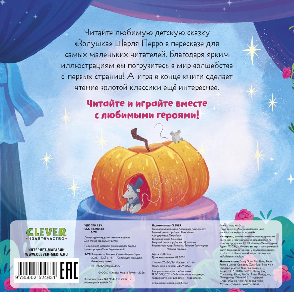 «Золушка» - книжка-картонка по любимой сказке с динамичными иллюстрациями и интерактивным разворотом с игрой. Благодаря плотным картонным страничкам и закругленным уголкам она удобна и безопасна для малыша. Читайте любимую детскую сказку «Золушка» Шарля Перро в пересказе для самых маленьких читателей. Яркие картинки с первых страниц погрузят вас в мир волшебства! А игра в конце книги сделает чтение золотой классики еще интереснее. У этой книги для детей компактный формат, идеально подходящий для детских ручек. А еще благодаря маленькому размеру книги ее удобно брать с собой и читать в поездке или на прогулке. Если вы ищете новогодние подарки для детей, книжки для малышей от года, подарок ребенку 2 года и сказки для детей 3 лет, книжка для малышей «Золушка» для вас. Она понравится тем, кого интересуют добрые сказки для малышей, увлекательные детские книги и качественные книги для малышей.| Издательство | Клевер-Медиа-Групп |