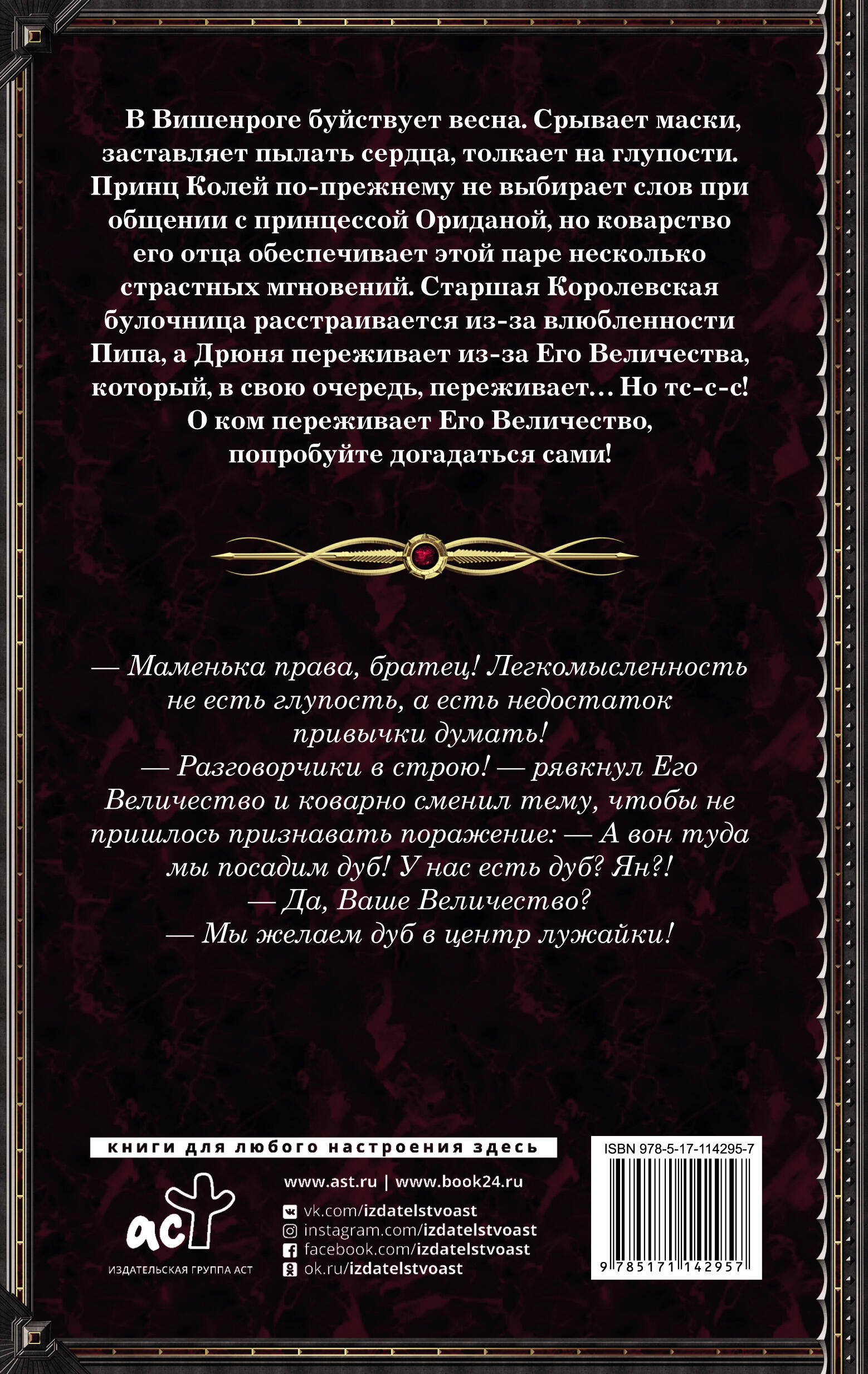 В Вишенроге буйствует весна. Срывает маски, заставляет пылать сердца, толкает на глупости. Принц Колей по-прежнему не выбирает слов при общении с принцессой Ориданой, но коварство его отца обеспечивает этой паре несколько страстных мгновений. Старшая Королевская булочница расстраивается из-за влюбленности Пипа, а Дрюня переживает из-за Его Величества, который, в свою очередь, переживает… Но тс-с-с! О ком переживает Его Величество, попробуйте догадаться сами!| Издательство | ИЗДАТЕЛЬСТВО "АСТ" |
