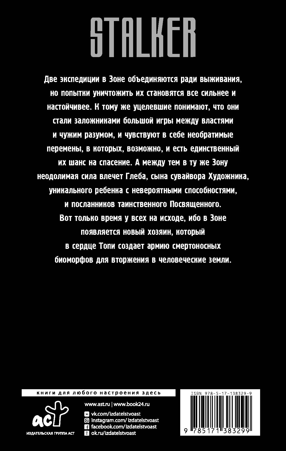 Две экспедиции в Зоне объединяются ради выживания, но попытки уничтожить их становятся все сильнее и настойчивее. К тому же уцелевшие понимают, что они стали заложниками большой игры между властями и чужим разумом, и чувствуют в себе необратимые перемены, в которых, возможно, и есть единственный их шанс на спасение. А между тем в ту же Зону неодолимая сила влечет Глеба, сына сувайвора Художника, уникального ребенка с невероятными способностями, и посланников таинственного Посвященного. Вот только время у всех на исходе, ибо в Зоне появляется новый хозяин, который в сердце Топи создает армию смертоносных биоморфов для вторжения в человеческие земли.