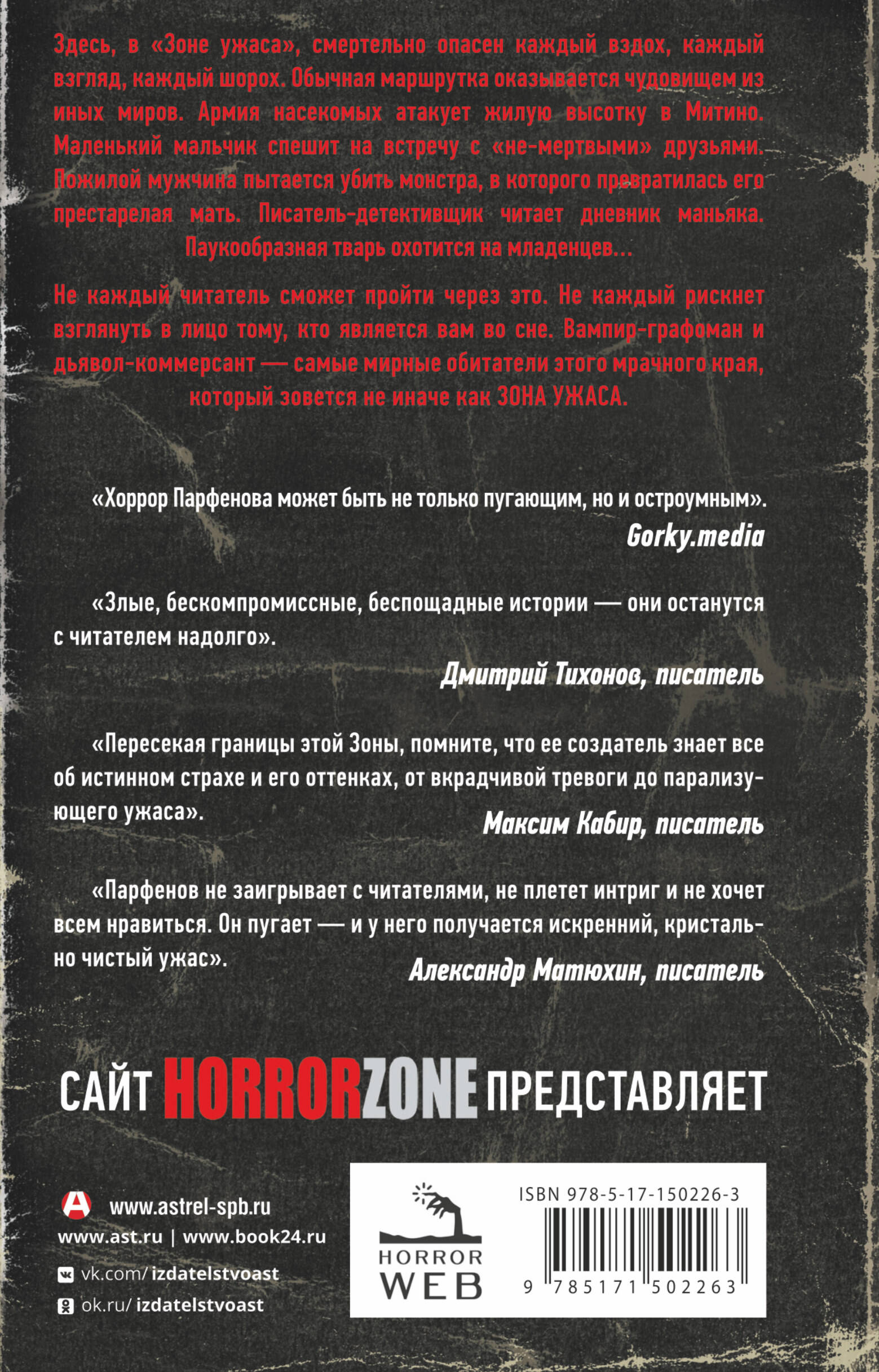 Здесь, в "Зоне ужаса", смертельно опасен каждый вздох, каждый взгляд, каждый шорох. Обычная маршрутка оказывается чудовищем из иных миров. Армия насекомых атакует жилую высотку в Митино. Маленький мальчик спешит на встречу с "не-мертвыми" друзьями. Пожилой мужчина пытается убить монстра, в которого превратилась его престарелая мать. Писатель-детективщик читает дневник маньяка. Паукообразная тварь охотится на младенцев… Не каждый читатель сможет пройти через это. Не каждый рискнет взглянуть в лицо тому, кто является вам во сне. Вампир-графоман и дьявол-коммерсант - самые мирные обитатели этого мрачного края, который зовется не иначе как ЗОНА УЖАСА.| Издательство | АСТ |