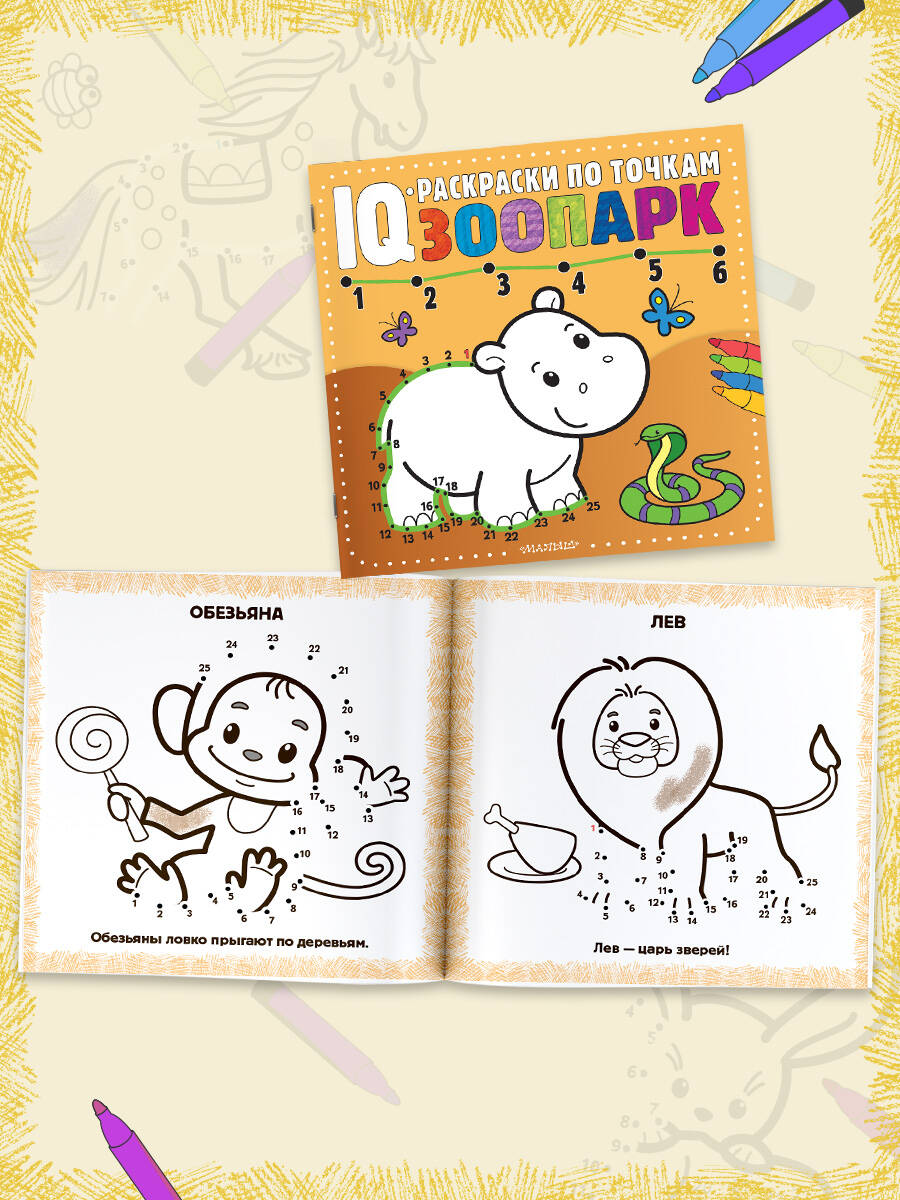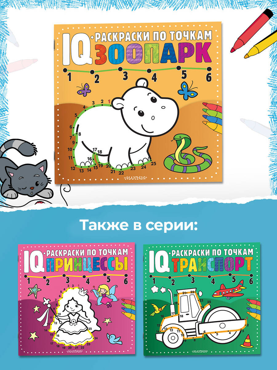 Эта весёлая обучающая раскраска покажет, сколько удивительных животных можно встретить в зоопарке. Ребёнок сможет не только раскрасить картинки, но и дорисовать их, соединив точки по порядку, выучит цифры и узнает первые полезные факты об окружающем мире. Наши IQ- раскраски помогут в игровой форме развить интеллект и творческие способности ребёнка.| Издательство | АСТ |