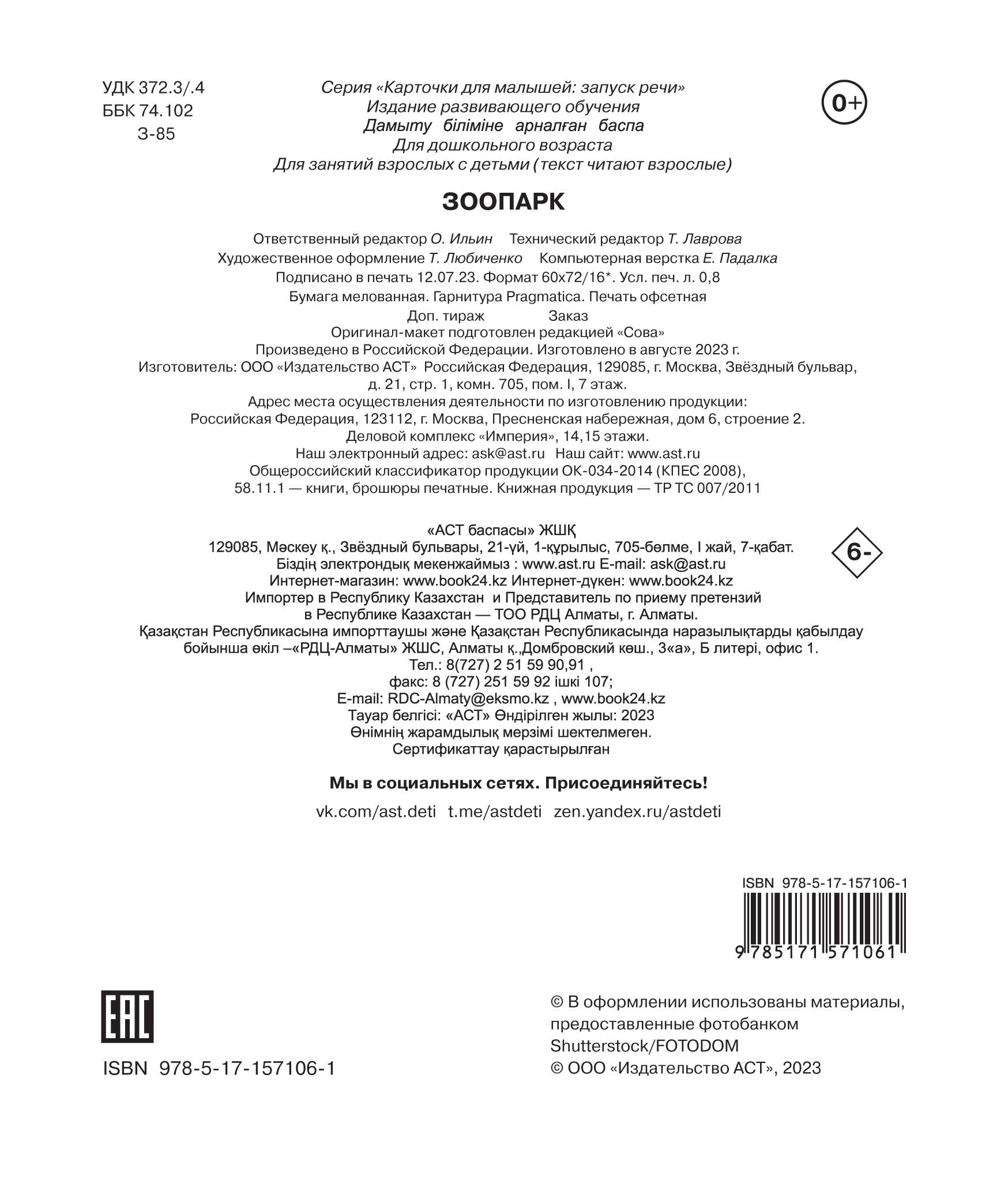 «Зоопарк» - это книжка с отрезными карточками, предназначенная для раннего развития ребёнка по методике Гленна Домана. Каждая страничка книжки - это карточка с красочным фотоизображением животного и легко читаемой подписью с его названием. Регулярные занятия с карточками позволят малышу получить первые представления об окружающем мире, потренировать мышление, развить память.