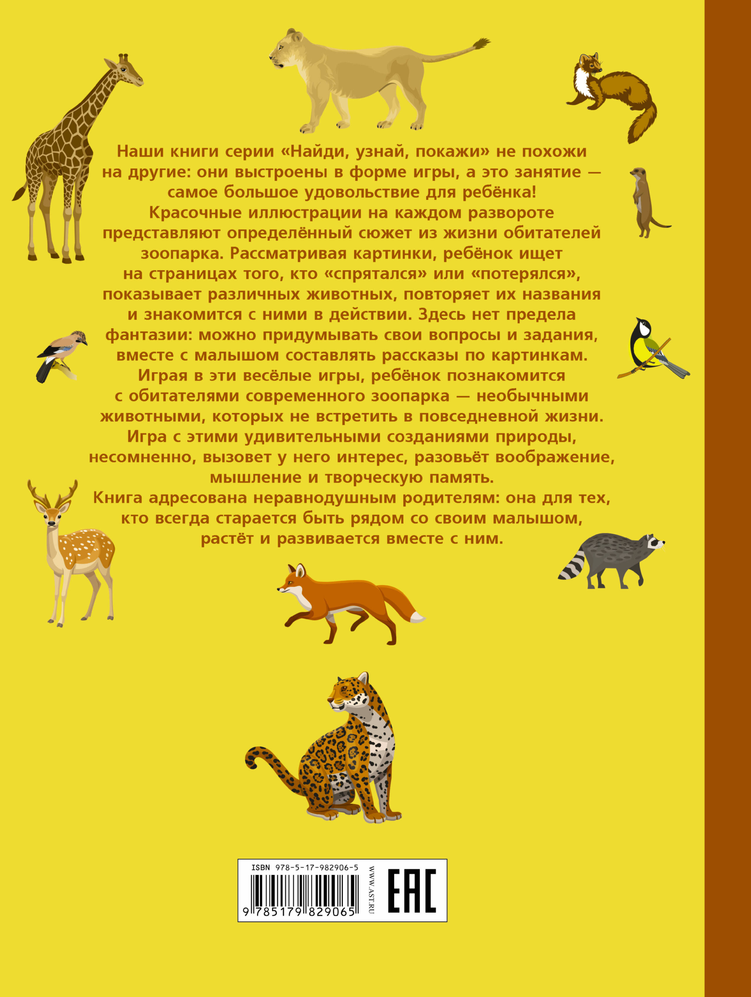 Наши книги серии «Найди, узнай, покажи» не похожи на другие: они выстроены в форме игры, а играть со зверюшками - самое большое удовольствие для ребёнка! Красочные иллюстрации на каждом развороте раскрывают секреты одного из обитателей зоопарка. Рассматривая картинки, ребёнок ищет на страницах того, кто «спрятался» или «потерялся», показывает животных, повторяет их названия и знакомится с ними в действии. Здесь нет предела фантазии: можно придумывать свои вопросы и задания, вместе с малышом составлять рассказы по картинкам. Играя в эти весёлые игры, ребёнок познакомится с обитателями современного зоопарка - необычными животными, которых не встретить в повседневной жизни. Игра с этими удивительными созданиями природы, несомненно, вызовет у него интерес, разовьёт воображение, мышление и творческую память. Книга адресована неравнодушным родителям: она для тех, кто всегда старается быть рядом со своим малышом, растёт и развивается вместе с ним.| Издательство | ИЗДАТЕЛЬСТВО "АСТ" |