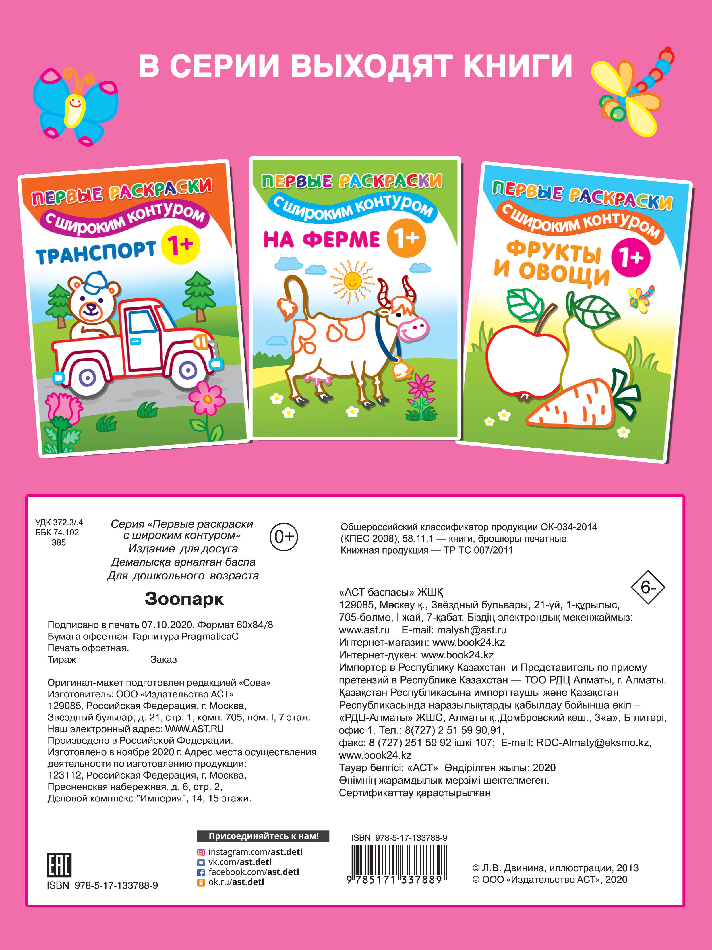 О чем эта книга Красочная развивающая раскраска - это забавные картинки животных с широким контуром для самых маленьких. Кому эта книга будет интересна Это издание - отличный подарок для самых маленьких художников. Каковы особенности этой книги • На каждой цветной страничке - крупная веселая картинка обитателя зоопарка и название животного. Раскрашивать можно карандашами, мелками, пальчиковыми красками. • Широкая контурная полоса поможет раскрасить картинку аккуратно. • Увлекательное и полезное занятие поможет ребенку раскрыть свой творческий потенциал, разовьет цветовосприятие и мелкую моторику. Занимайтесь вместе с малышом, пусть он почувствует себя участником творческого процесса!| Издательство | Издательство "АСТ" |
