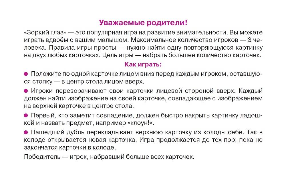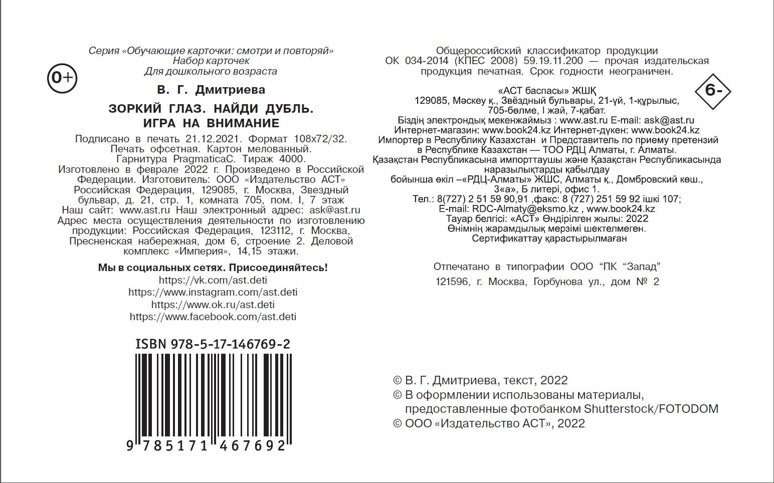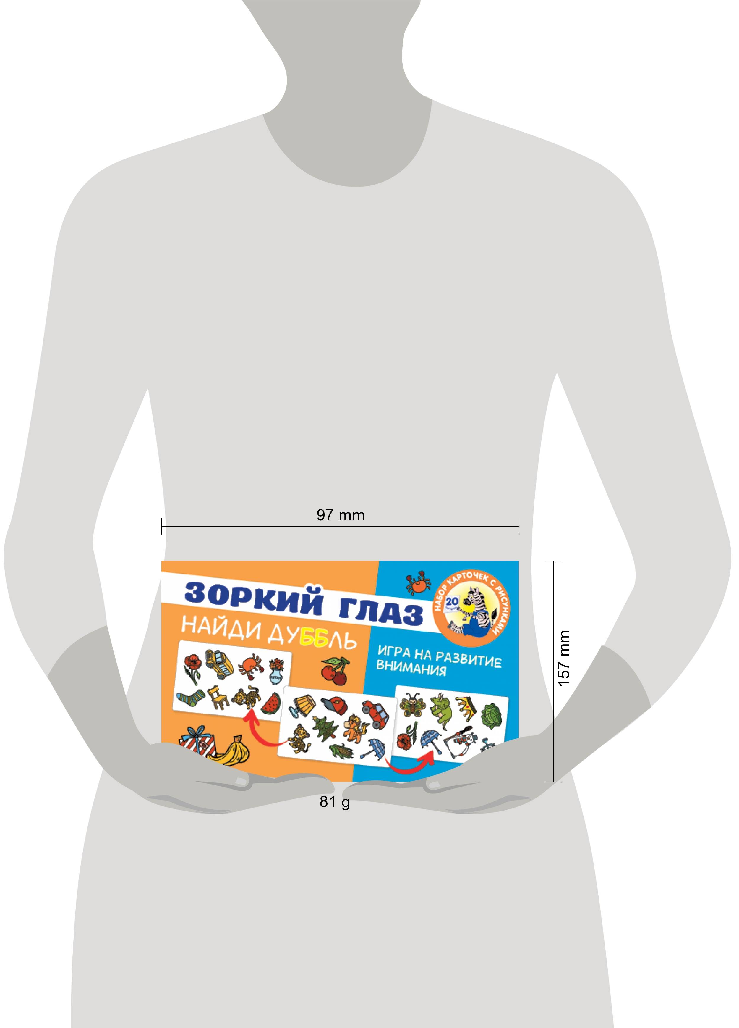 Кто самый зоркий, быстрый и внимательный? Весёлая развивающая игра "Зоркий глаз. Найди дубль" объединит всю семью и поможет выявить самых-самых! Адаптированный для малышей аналог популярной игры "Дуббль", вызывающей неподдельный азарт у детей и взрослых. Ведь нужно раньше других найти повторяющуюся картинку, быстро назвать предмет и забрать карточку себе! "Зоркий глаз" развивает внимание и реакцию и очень нравится детям. Игра подходит для детей от 4 лет. Веселитесь всей семьёй вместе с вашими малышами! Правила игры просты. Каждая карточка содержит неповторяющийся набор картинок и имеет только одну общую картинку с любой карточкой из колоды. Каждому угроку раздаётся по одной карточке, ещё одна карточка остаётся сверху колоды в центре стола. Нужно первым найти общую картинку, быстро назвать этот предмет и забрать себе карточку из колоды. Побеждает игрок, собравший наибольшее количество карточек. Для дошкольного и младшего школьного возраста| Издательство | ИЗДАТЕЛЬСТВО "АСТ" |