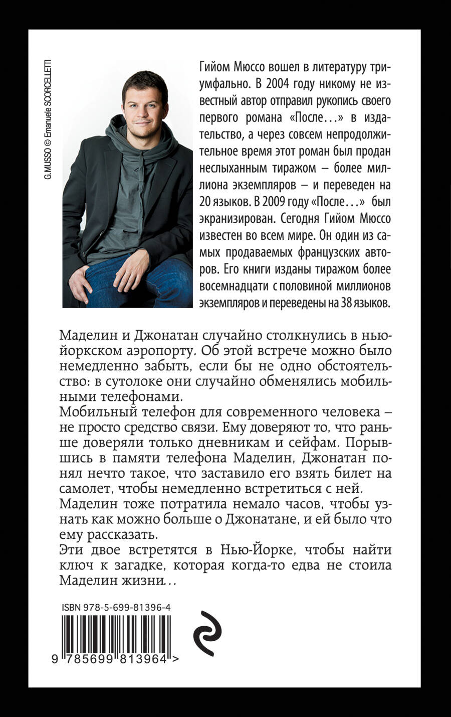 Гийом Мюссо вошел в литературу триумфально. В 2004 году никому не известный автор отправил рукопись своего первого романа, «После...», в издательство, а через совсем непродолжительное время этот роман был продан неслыханным тиражом - более миллиона экземпляров - и переведен на двадцать языков. В 2009 году «После...» был экранизирован. Сегодня Гийом Мюссо известен во всем мире. Он один из самых продаваемых французских авторов. Его книги изданы тиражом более 33 миллионов и переведены на 42 языка. Маделин и Джонатан случайно столкнулись в нью-йоркском аэропорту. Об этой встрече можно было немедленно забыть, если бы не одно обстоятельство: в сутолоке они случайно обменялись мобильными телефонами. Мобильный телефон для современного человека - не просто средство связи. Ему доверяют то, что раньше доверяли только дневникам и сейфам. Порывшись в памяти телефона Маделин, Джонатан понял нечто такое, что заставило его взять билет на самолет, чтобы немедленно встретиться с ней. Маделин тоже потратила немало часов, чтобы узнать как можно больше о Джонатане, и ей было что ему рассказать. Эти двое встретятся в Нью-Йорке, чтобы найти ключ к загадке, которая когда-то едва не стоила Маделин жизни…| Издательство | ООО "Издательство "Эксмо" |