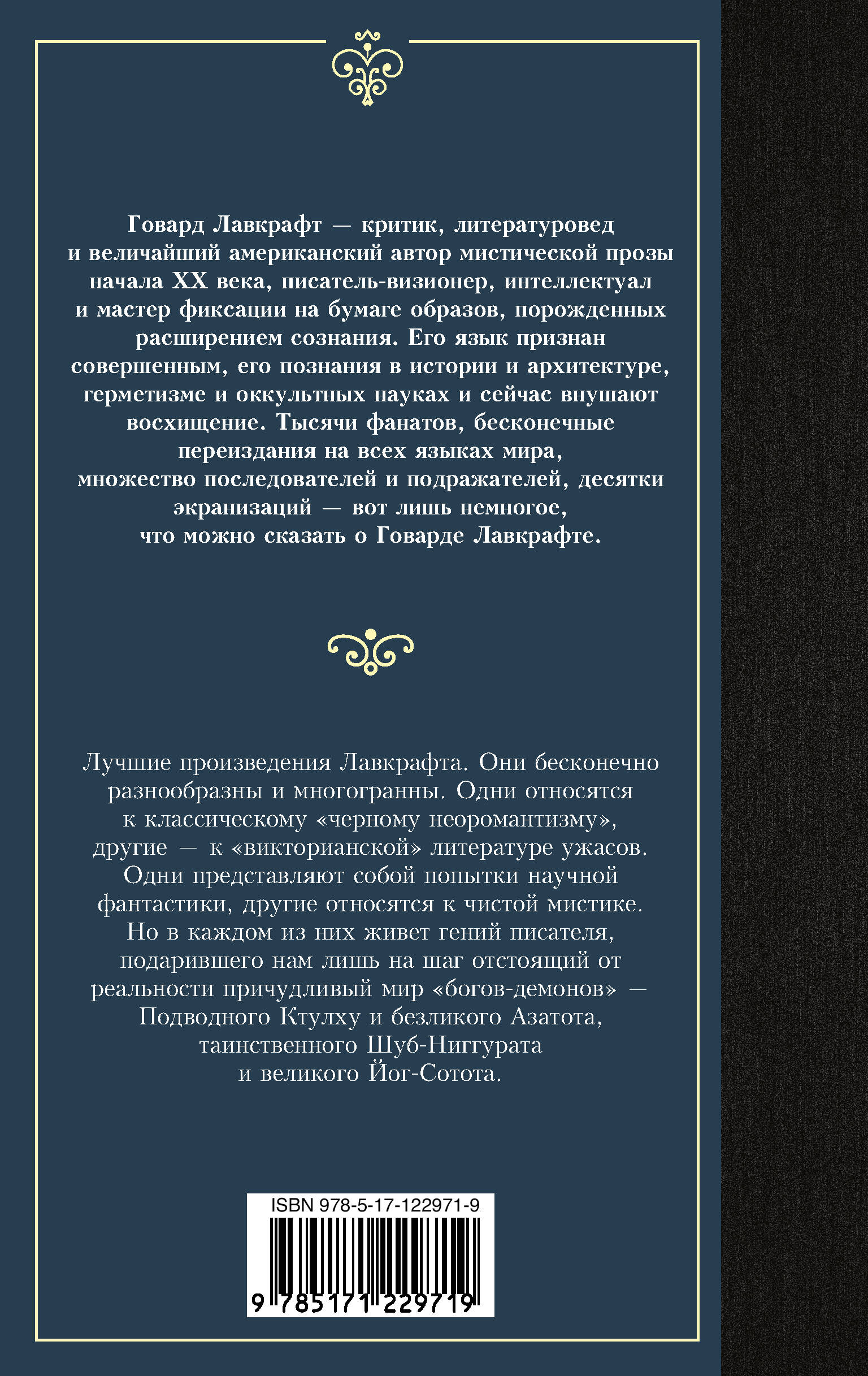 Лучшие произведения Лавкрафта. Они бесконечно разнообразны и многогранны. Одни относятся к классическому "черному неоромантизму", другие - к "викторианской" литературе ужасов. Одни представляют собой попытки научной фантастики, другие относятся к чистой мистике. Но в каждом из них живет гений писателя, подарившего нам лишь на шаг отстоящий от реальности причудливый мир "богов-демонов" - Подводного Ктулху и безликого Азатота, таинственного Шуб-Ниггурата и великого Йог-Сотота.