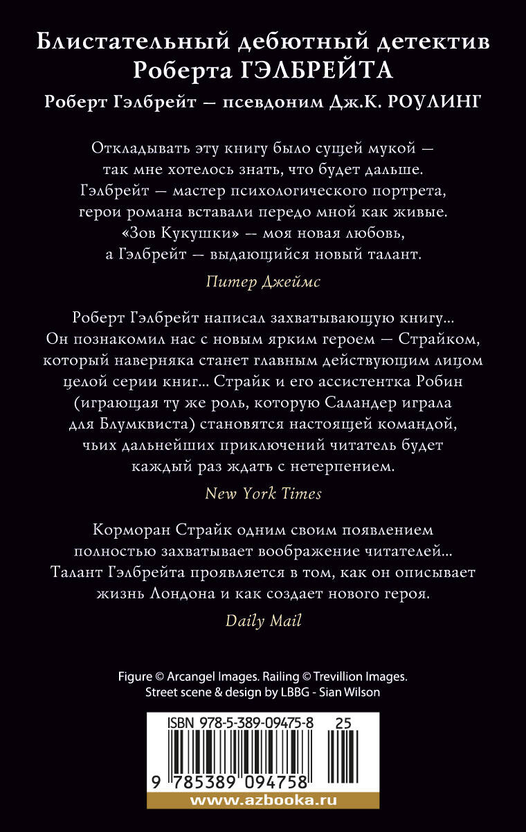 Когда скандально известная топ-модель, упав с заснеженного балкона своего пентхауса, разбивается насмерть, все решают, что это самоубийство. Но брат девушки не может смириться с таким выводом и обращается к услугам частного сыщика по имени Корморан Страйк. Страйк прошел войну, пострадал физически и душевно; жизнь его несется под откос. Теперь он рассчитывает закрыть хотя бы финансовую брешь, однако расследование оборачивается коварной ловушкой. Углубляясь в запутанную историю юной звезды, Страйк приоткрывает тайную изнанку событий - и сам движется навстречу смертельной опасности. Захватывающий, отточенный сюжет разворачивается на фоне Лондона, от тихих улиц благопристойного Мэйфера до обшарпанных пабов Ист-Энда и круглосуточно бурлящего Сохо. "Зов Кукушки" - незаурядный и заслуженно популярный роман, в котором впервые появляется Корморан Страйк. Это также первое произведение Дж.К. Роулинг, созданное в детективном жанре и подписанное именем Роберта Гэлбрейта.| Издательство | Азбука-Аттикус Издат.группа ООО |