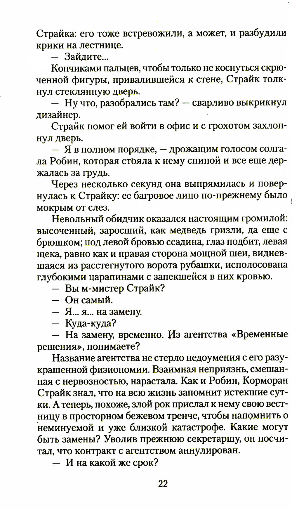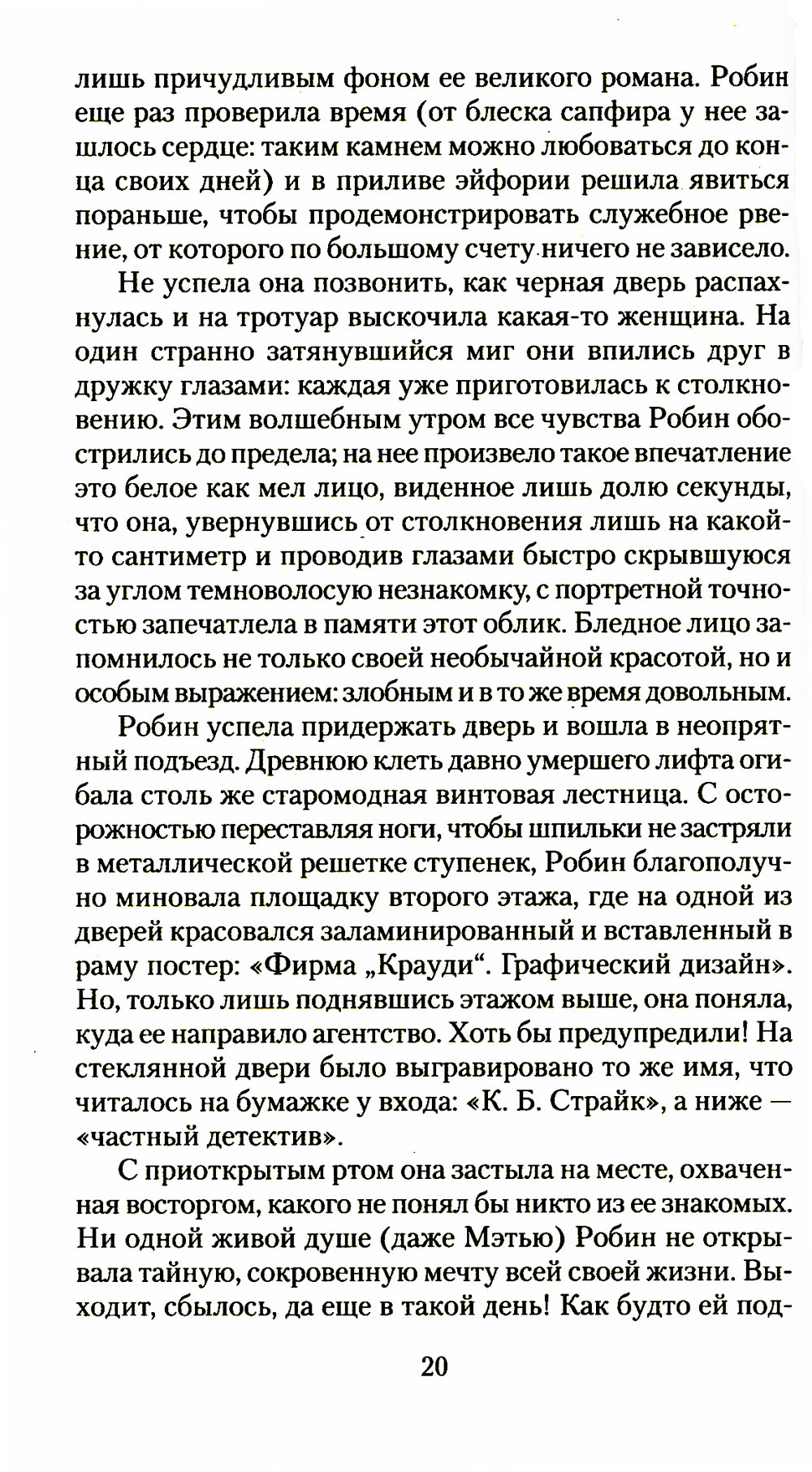 Когда скандально известная топ-модель, упав с заснеженного балкона своего пентхауса, разбивается насмерть, все решают, что это самоубийство. Но брат девушки не может смириться с таким выводом и обращается к услугам частного сыщика по имени Корморан Страйк. Страйк прошел войну, пострадал физически и душевно; жизнь его несется под откос. Теперь он рассчитывает закрыть хотя бы финансовую брешь, однако расследование оборачивается коварной ловушкой. Углубляясь в запутанную историю юной звезды, Страйк приоткрывает тайную изнанку событий - и сам движется навстречу смертельной опасности... Захватывающий, отточенный сюжет разворачивается на фоне Лондона, от тихих улиц благопристойного Мэйфера до обшарпанных пабов Ист-Энда и круглосуточно бурлящего Сохо. «Зов Кукушки» - незаурядный и заслуженно популярный роман, в котором впервые появляется Корморан Страйк. Это также первое произведение Дж. К. Роулинг, созданное в детективном жанре и подписанное именем Роберта Гэлбрейта.| Издательство | Азбука |