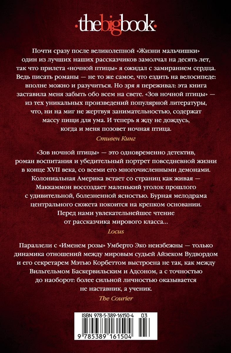 Холодная весна 1699 года, североамериканская колония Каролина. Мировой судья Айзек Вудворд и его секретарь Мэтью Корбетт отправляются из столичного Чарльз-Тауна в городок Фаунт-Ройал, где происходит какая-то чертовщина: земля не родит, дома по ночам полыхают, а тут еще и два зверских убийства. Горожане обвиняют во всем молодую вдову Рейчел Ховарт и стремятся поскорее сжечь ведьму на костре, однако глава поселения Роберт Бидвелл желает, чтобы все было по закону. Для мирового судьи показания свидетелей звучат вполне убедительно, а вот его секретарь колеблется: точно ли девушка - ведьма и зачем в шкафах у горожан столько скелетов? И дьяволовы ли козни всему виной - или же дьявольски хитроумный план неведомого преступника?.. «"Зов ночной птицы" - из тех уникальных произведений популярной литературы, что, ни на миг не жертвуя занимательностью, содержат массу пищи для ума. И теперь я жду не дождусь, когда и меня позовет ночная птица» (Стивен Кинг). Роман публикуется в новом переводе.| Издательство | Азбука |