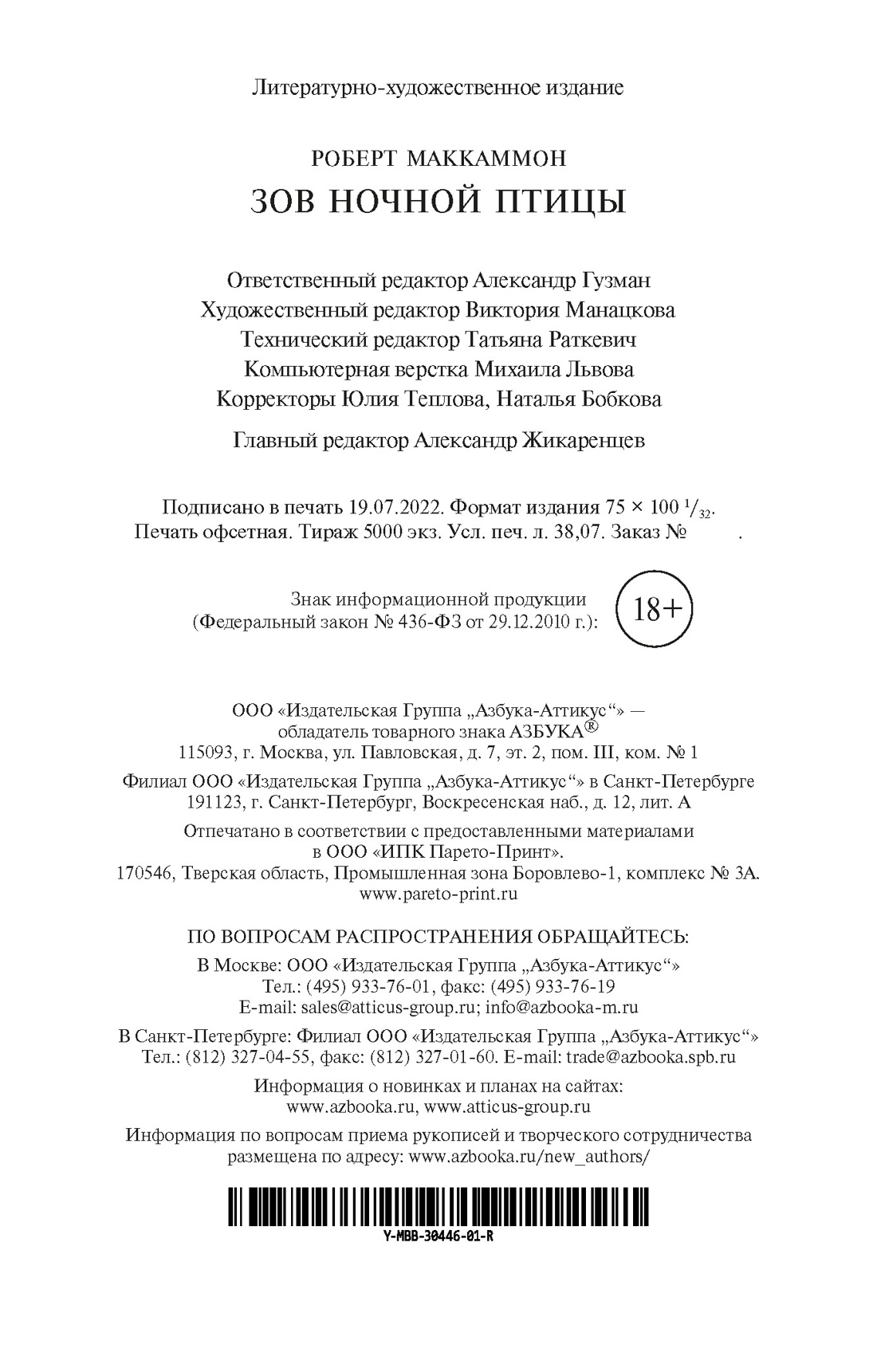 Холодная весна 1699 года, североамериканская колония Каролина. Мировой судья Айзек Вудворд и его секретарь Мэтью Корбетт отправляются из столичного Чарльз-Тауна в городок Фаунт-Ройал, где происходит какая-то чертовщина: земля не родит, дома по ночам полыхают, а тут еще и два зверских убийства. Горожане обвиняют во всем молодую вдову Рейчел Ховарт и стремятся поскорее сжечь ведьму на костре, однако глава поселения Роберт Бидвелл желает, чтобы все было по закону. Для мирового судьи показания свидетелей звучат вполне убедительно, а вот его секретарь колеблется: точно ли девушка - ведьма и зачем в шкафах у горожан столько скелетов? И дьяволовы ли козни всему виной - или же дьявольски хитроумный план неведомого преступника?.. «"Зов ночной птицы" - из тех уникальных произведений популярной литературы, что, ни на миг не жертвуя занимательностью, содержат массу пищи для ума. И теперь я жду не дождусь, когда и меня позовет ночная птица» (Стивен Кинг). Роман публикуется в новом переводе.| Издательство | Азбука |
