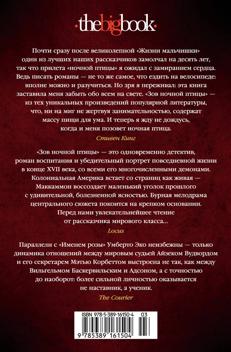 Холодная весна 1699 года, североамериканская колония Каролина. Мировой судья Айзек Вудворд и его секретарь Мэтью Корбетт отправляются из столичного Чарльз-Тауна в городок Фаунт-Ройал, где происходит какая-то чертовщина: земля не родит, дома по ночам полыхают, а тут еще и два зверских убийства. Горожане обвиняют во всем молодую вдову Рейчел Ховарт и стремятся поскорее сжечь ведьму на костре, однако глава поселения Роберт Бидвелл желает, чтобы все было по закону. Для мирового судьи показания свидетелей звучат вполне убедительно, а вот его секретарь колеблется: точно ли девушка - ведьма и зачем в шкафах у горожан столько скелетов? И дьяволовы ли козни всему виной - или же дьявольски хитроумный план неведомого преступника?.. ""Зов ночной птицы" - из тех уникальных произведений популярной литературы, что, ни на миг не жертвуя занимательностью, содержат массу пищи для ума. И теперь я жду не дождусь, когда и меня позовет ночная птица" (Стивен Кинг). Роман публикуется в новом переводе.| Издательство | Азбука-Аттикус Издат.группа ООО |