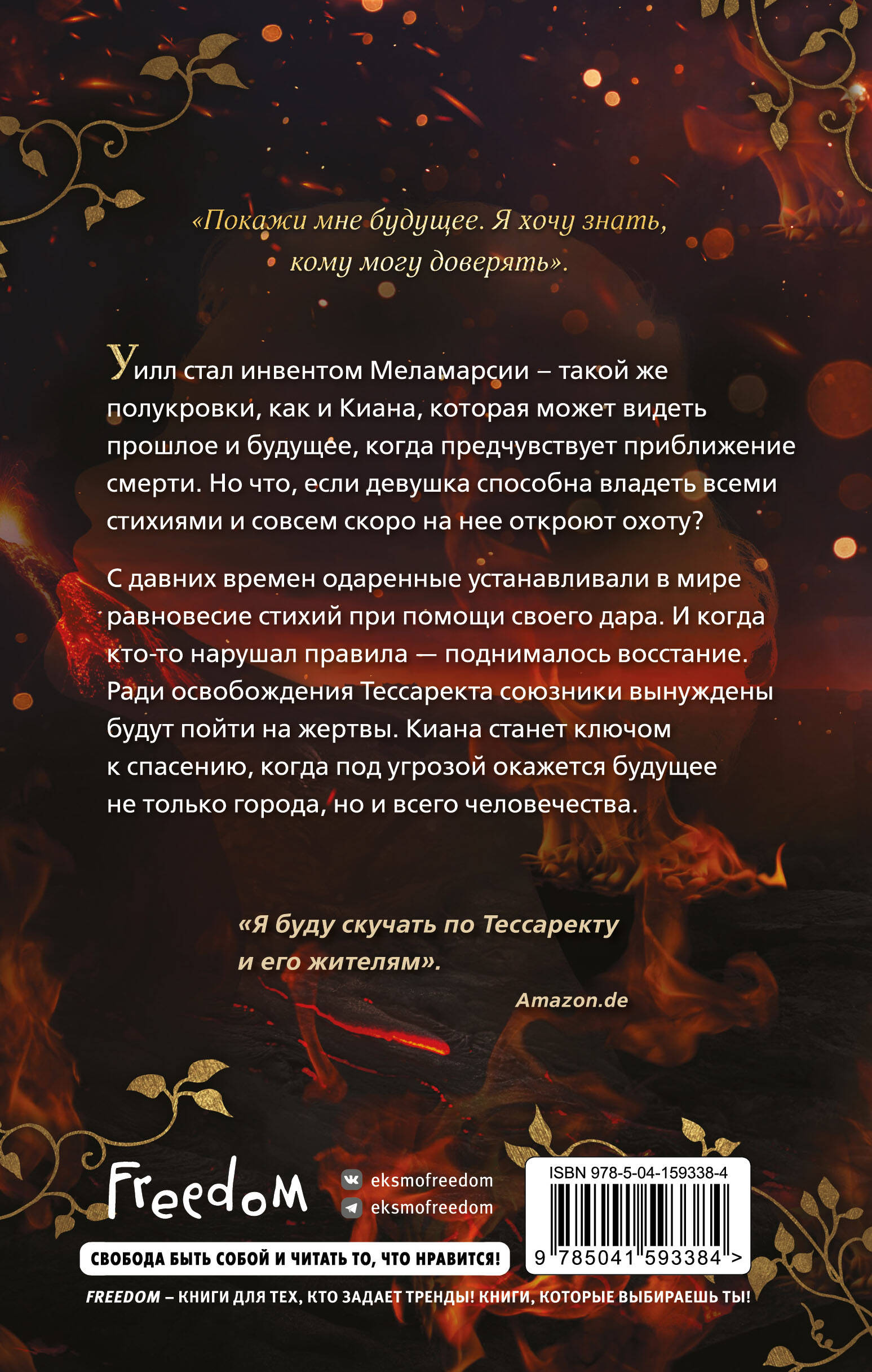 Уилл стал инвентом Меламарсии - такой же полукровки, как и Киана, сочетающей в себе стихии земли и воды. Теперь девушка должна обучить ее всему, чтобы противостоять в борьбе с Омилией. Киана способна видеть альтернативные реальности, когда предчувствует приближение смерти. С давних времен одаренные устанавливали в мире равновесие стихий при помощи своего дара. И когда кто-то нарушал правила - поднималось восстание. Мигма - организация, которая выступает против Омиилии и старых устоев, готовится нанести удар и освободить Тессарект. На какие жертвы должны будут пойти союзники? Киана окажется ключом к спасению, когда под угрозой окажется не только будущее города, но и всего человечества. Тессарект - город, который строго разделен на четыре сектора, в каждом из которых господствует определенная стихия. Любые отношения между представителями разных народов запрещены. Но всегда найдутся те, кто нарушит правила, и те, кому это очень не понравится. 4 силы, 4 стихии: огонь, вода, земля, воздух. Юная Кия стала первой в своем роде, кто принадлежал сразу к двум стихиям. Но как ими управлять и чем опасна такая особенность не только для нее, но и для всех, кто ее окружает? Многообразие персонажей: полукровки, инвенты, представители каждого сектора, обладающие необычными силами. Впереди вас ждет немало открытий, переживаний. «Зов огня» - завершающая часть тетралогии. Вы будете скучать по Тессаректу и его обитателям. Отправляйтесь в финальное путешествие по новой и последней земле. Иллюстратор Lea Melcher в своем Instagram делится работами по романам Нины Трамунтани. В социальных сетях можно найти иллюстрации главных персонажей, их портреты, а также значимые сцены. 4,5 из 5 рейтинг на портале Lovelybooks.de. 91% положительных отзывов на сайте Amazon «Мне будет очень не хватать этой серии». - Amazon
