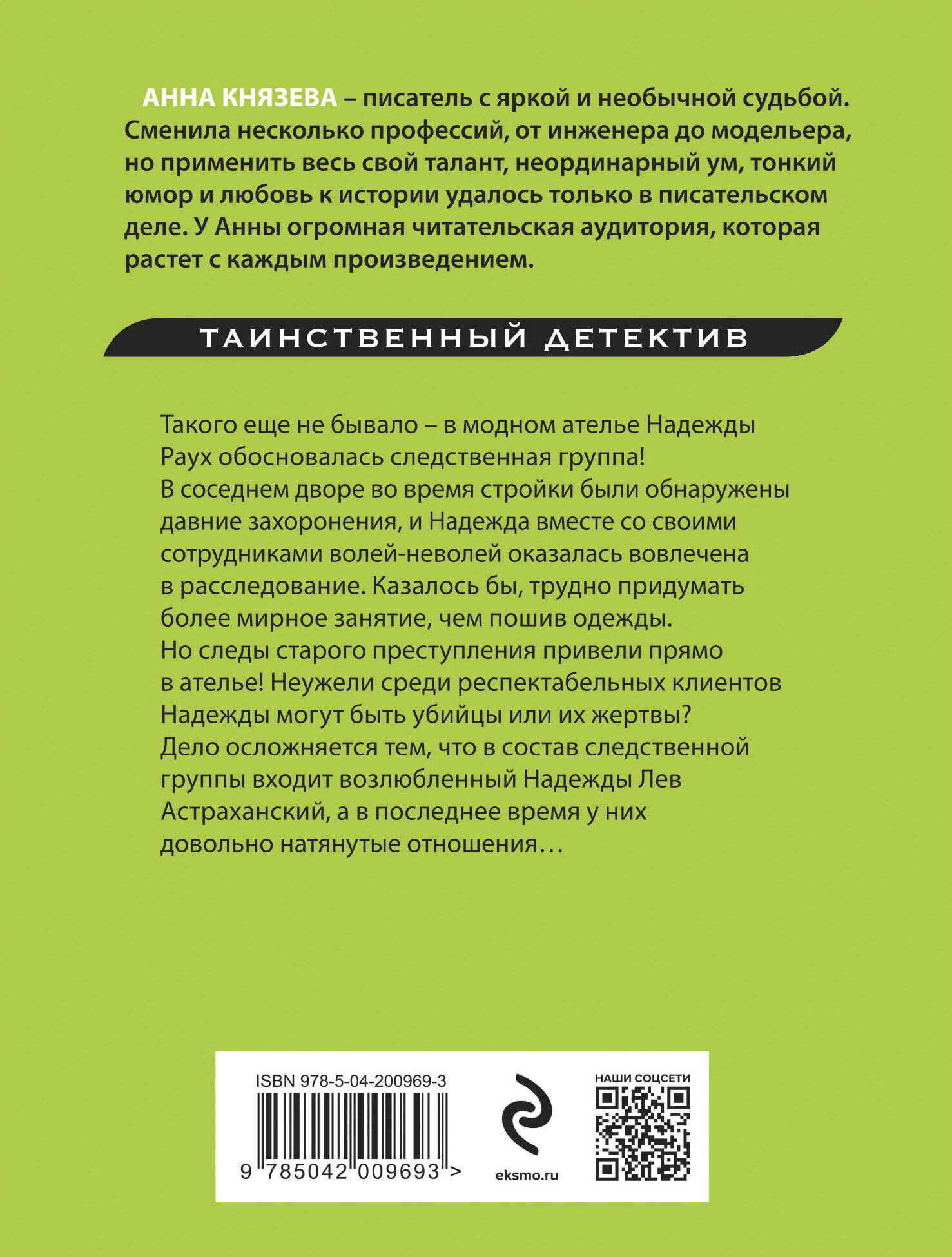 Анна Князева - популярный автор остросюжетных романов, в которых есть место не только опасным авантюрам и интригующим детективным расследованиям, но и историческим загадкам. Сюжет каждой ее книги представляет необычное переплетение разных эпох, непредсказуемых событий, ярких персонажей. Действие романа «Зов темной крови» начинается в ателье модной одежды, принадлежащем Надежде Раух. Туда заявляется группа оперативников и просит предоставить помещение для работы. На стройке в соседнем дворе обнаружены расчлененные останки двух человек, мужчины и женщины. В составе следственной группы - возлюбленный Надежды Лев Астраханский, но у них в последнее время натянутые отношения. Также рядом с Надеждой снова появляется адвокат Марк Фридманович, ее бывший любовник…| Издательство | ООО "Издательство "Эксмо" |