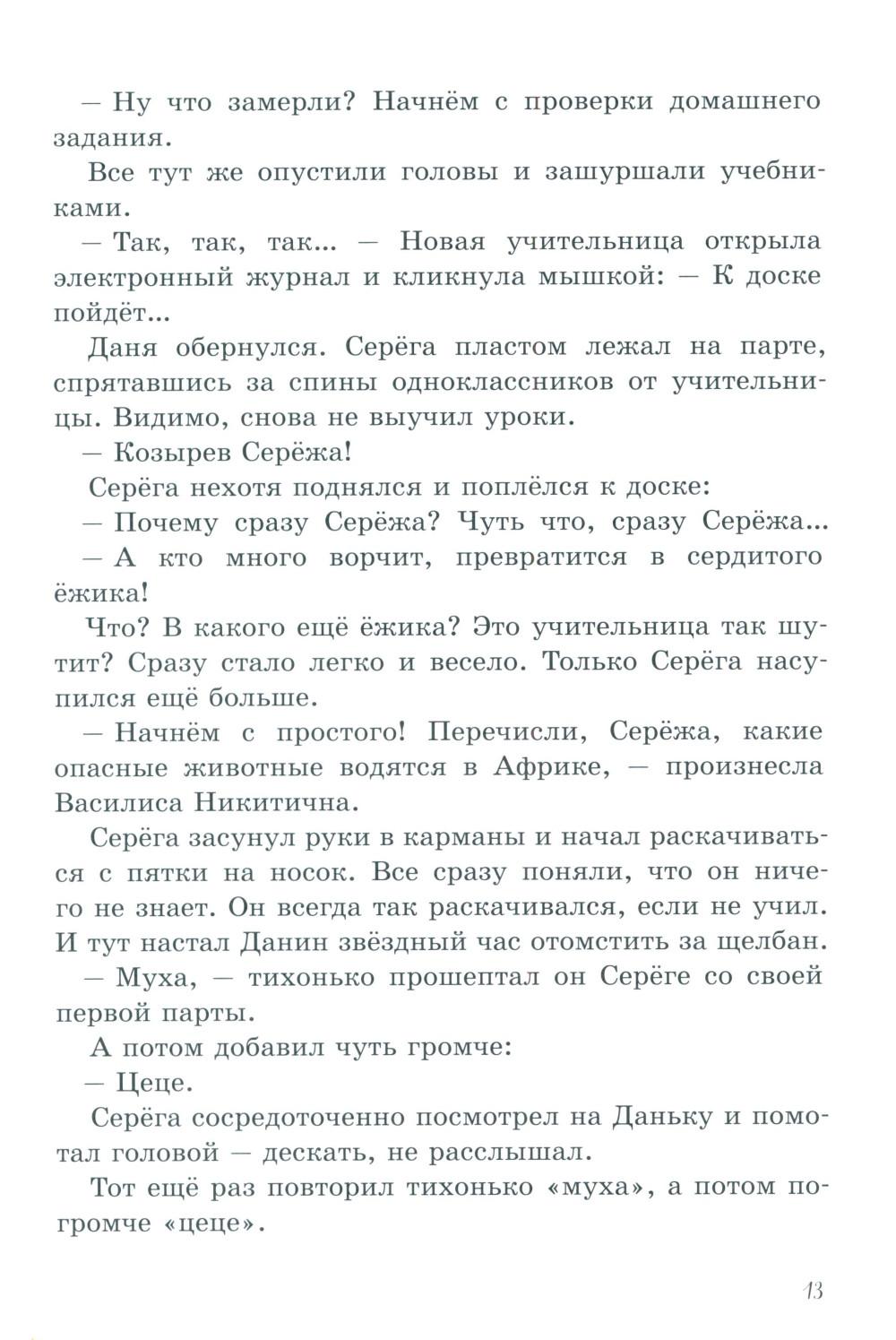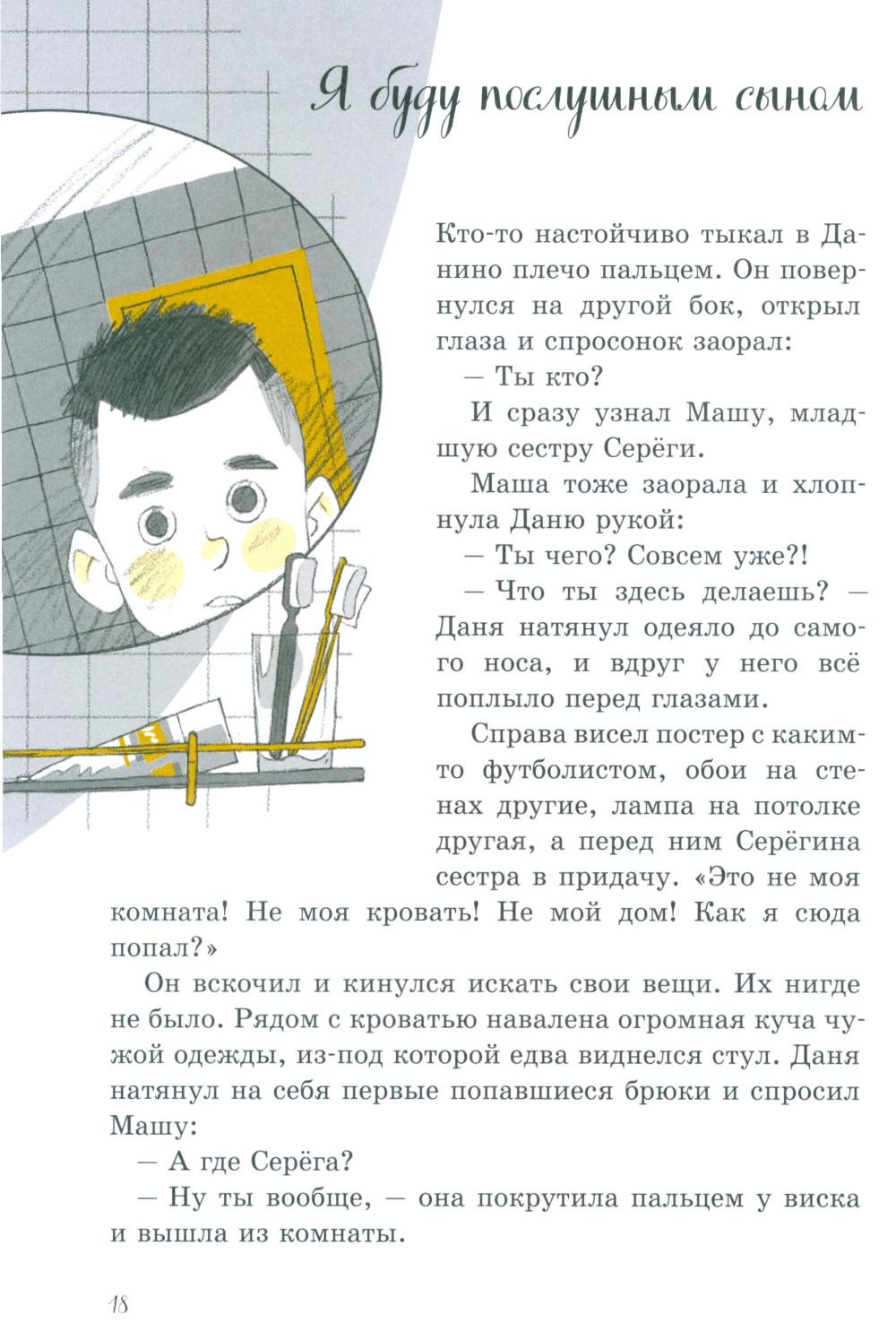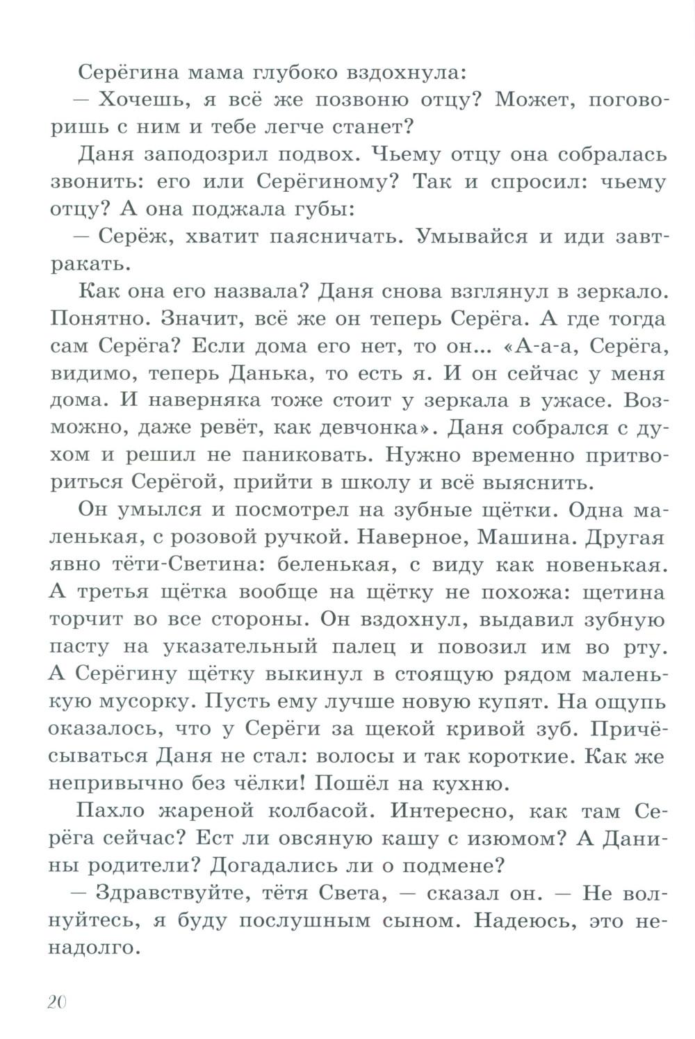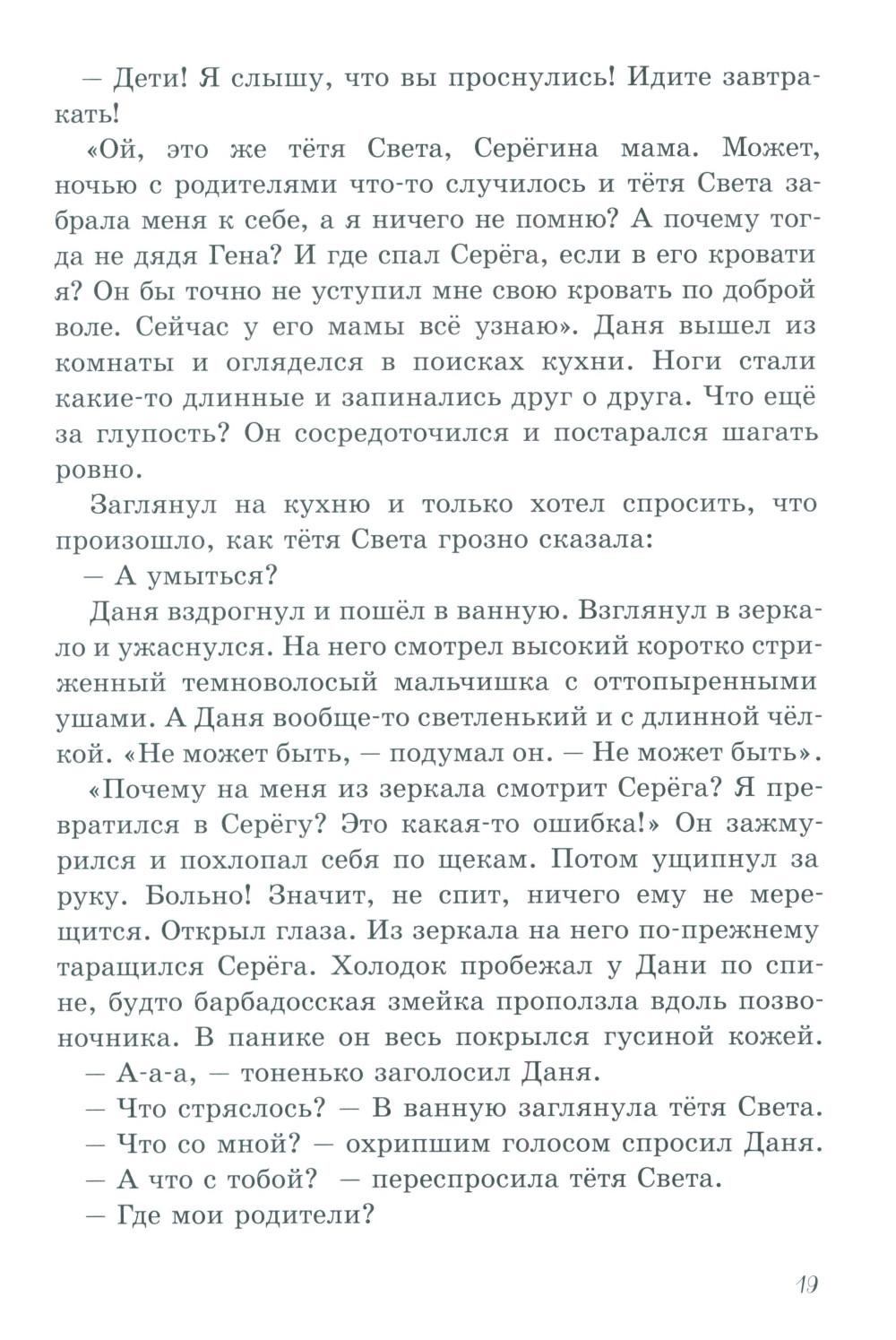 Чудеса творятся у второклашек! Два непримиримых врага, умник Данька и задира Серёга вдруг поменялись телами. А значит, и родителями, и квартирами, и любимыми занятиями. Невероятно, но факт: к этому странному событию имеет прямое отношение самая лучшая и самая мудрая учительница Василиса Никитична! У мальчишек начинается непростая жизнь, полная испытаний и нелепых казусов. Ребята изо всех сил пытаются придумать способы все исправить и временно приспособиться к жизни в новых семьях и непривычному кругу общения. Но не тут-то было! Данька - «заучка»-книголюб, увлекается герпетологией, в целом пай мальчик и даже толком не знает, как гонять футбольный мяч, а Серега - баламут, хулиган, заядлый футболист и не привык учить уроки. Постепенно до мальчишек доходит: чтобы вернуть себе свои жизни, они должны помочь друг другу стать лучше. Этот процесс ох как не прост! Даня начинает помогать Сереже с уроками, и тот медленно-медленно, но все более охотно и даже успешно начинает постигать премудрости школьной программы. А Сереже, кто бы мог подумать, удается приобщить Даньку к футболу. Постепенно меняется их отношение друг к другу. Теперь они если еще не совсем друзья, но уж точно не враги. Финал книги впечатляющий. Паникуя и впадая в отчаяние, в самый последний момент Сережа вспоминает Данькины обучающие приемы и решает итоговый тест по математике на отлично. А Данька, в свою очередь, тоже в первые минуты поддается панике и отчаянию, потом собирается с духом, успешно ловит летящие в ворота мячи и выводит футбольную команду к победе. Зачем понадобилось такое превращение, к чему оно в конечном итоге привело, вернутся ли мальчишки в свои тела и при чем здесь Василиса Никитична, узнают из этой веселой книги дети младшего школьного возраста.| Издательство | Мелик-Пашаев |