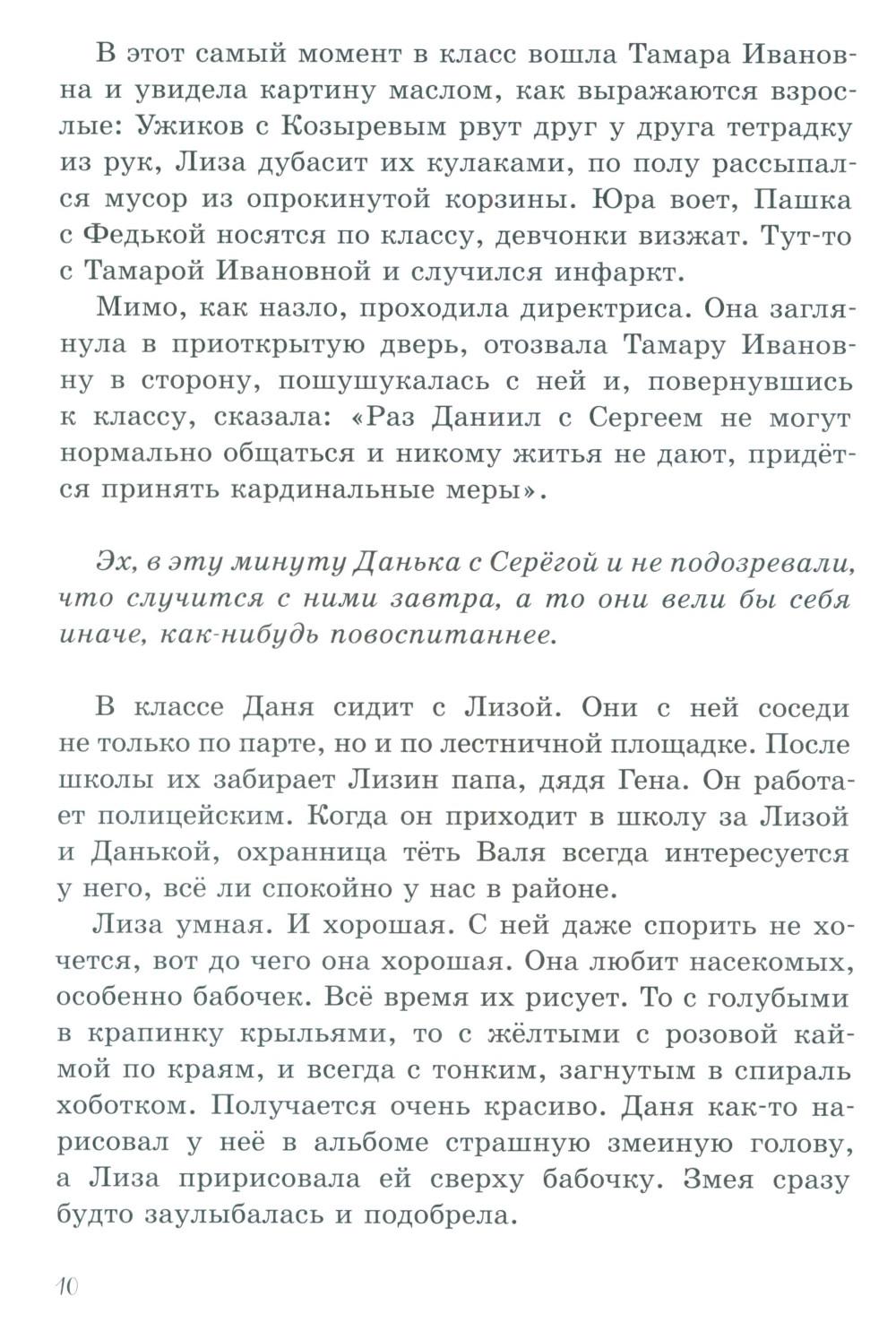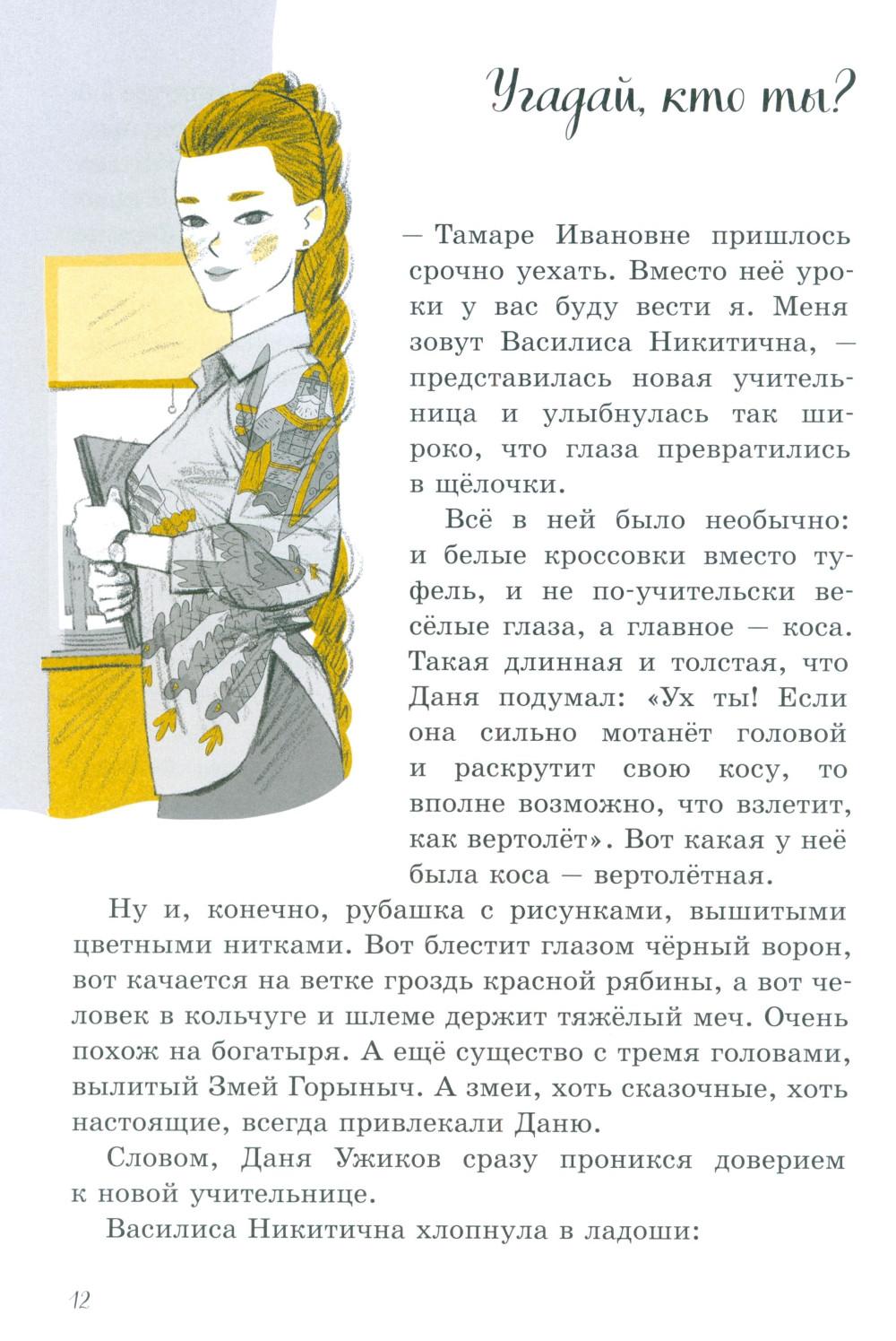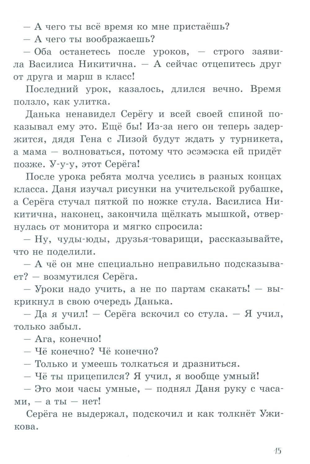 Чудеса творятся у второклашек! Два непримиримых врага, умник Данька и задира Серёга вдруг поменялись телами. А значит, и родителями, и квартирами, и любимыми занятиями. Невероятно, но факт: к этому странному событию имеет прямое отношение самая лучшая и самая мудрая учительница Василиса Никитична! У мальчишек начинается непростая жизнь, полная испытаний и нелепых казусов. Ребята изо всех сил пытаются придумать способы все исправить и временно приспособиться к жизни в новых семьях и непривычному кругу общения. Но не тут-то было! Данька - «заучка»-книголюб, увлекается герпетологией, в целом пай мальчик и даже толком не знает, как гонять футбольный мяч, а Серега - баламут, хулиган, заядлый футболист и не привык учить уроки. Постепенно до мальчишек доходит: чтобы вернуть себе свои жизни, они должны помочь друг другу стать лучше. Этот процесс ох как не прост! Даня начинает помогать Сереже с уроками, и тот медленно-медленно, но все более охотно и даже успешно начинает постигать премудрости школьной программы. А Сереже, кто бы мог подумать, удается приобщить Даньку к футболу. Постепенно меняется их отношение друг к другу. Теперь они если еще не совсем друзья, но уж точно не враги. Финал книги впечатляющий. Паникуя и впадая в отчаяние, в самый последний момент Сережа вспоминает Данькины обучающие приемы и решает итоговый тест по математике на отлично. А Данька, в свою очередь, тоже в первые минуты поддается панике и отчаянию, потом собирается с духом, успешно ловит летящие в ворота мячи и выводит футбольную команду к победе. Зачем понадобилось такое превращение, к чему оно в конечном итоге привело, вернутся ли мальчишки в свои тела и при чем здесь Василиса Никитична, узнают из этой веселой книги дети младшего школьного возраста.| Издательство | Мелик-Пашаев |