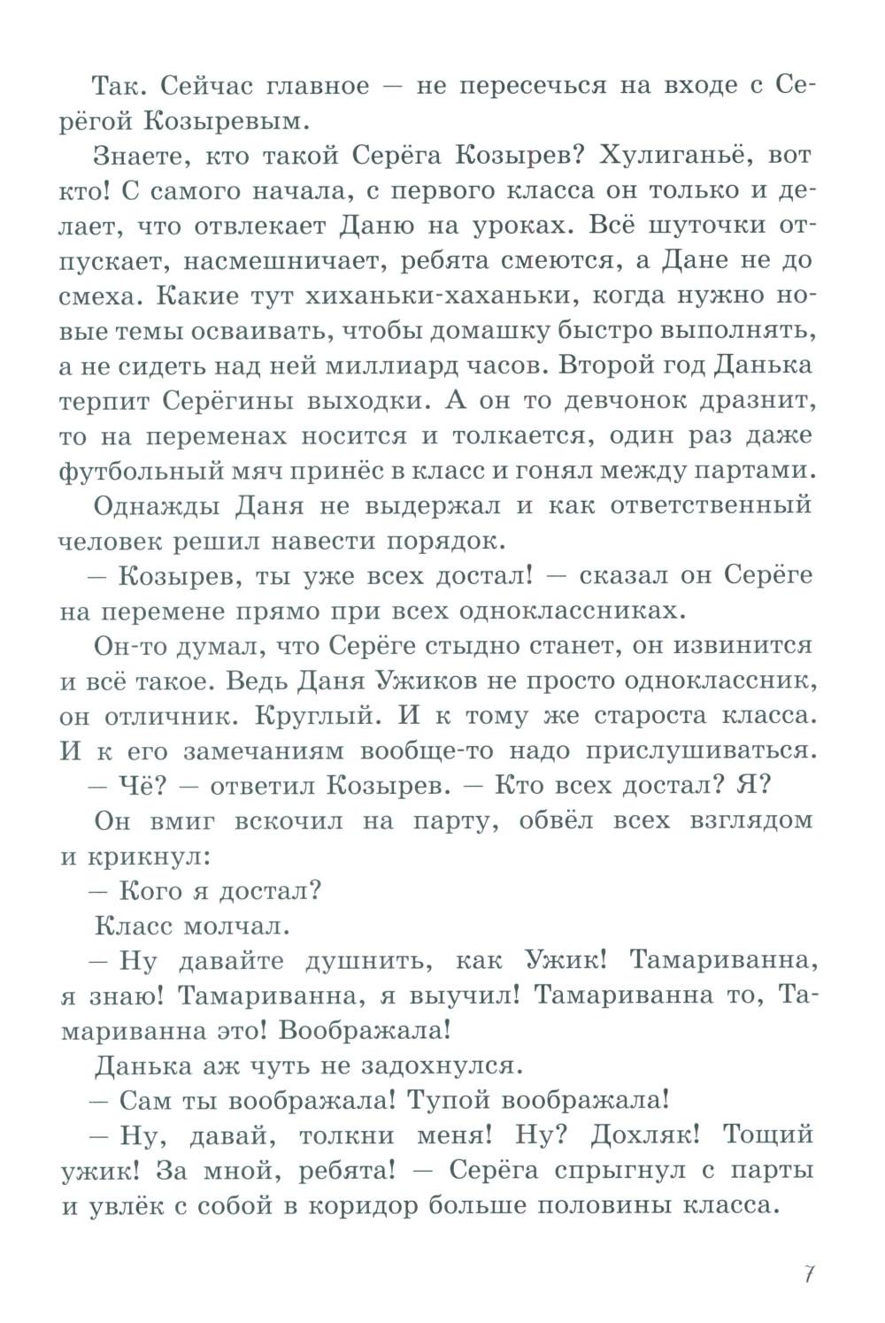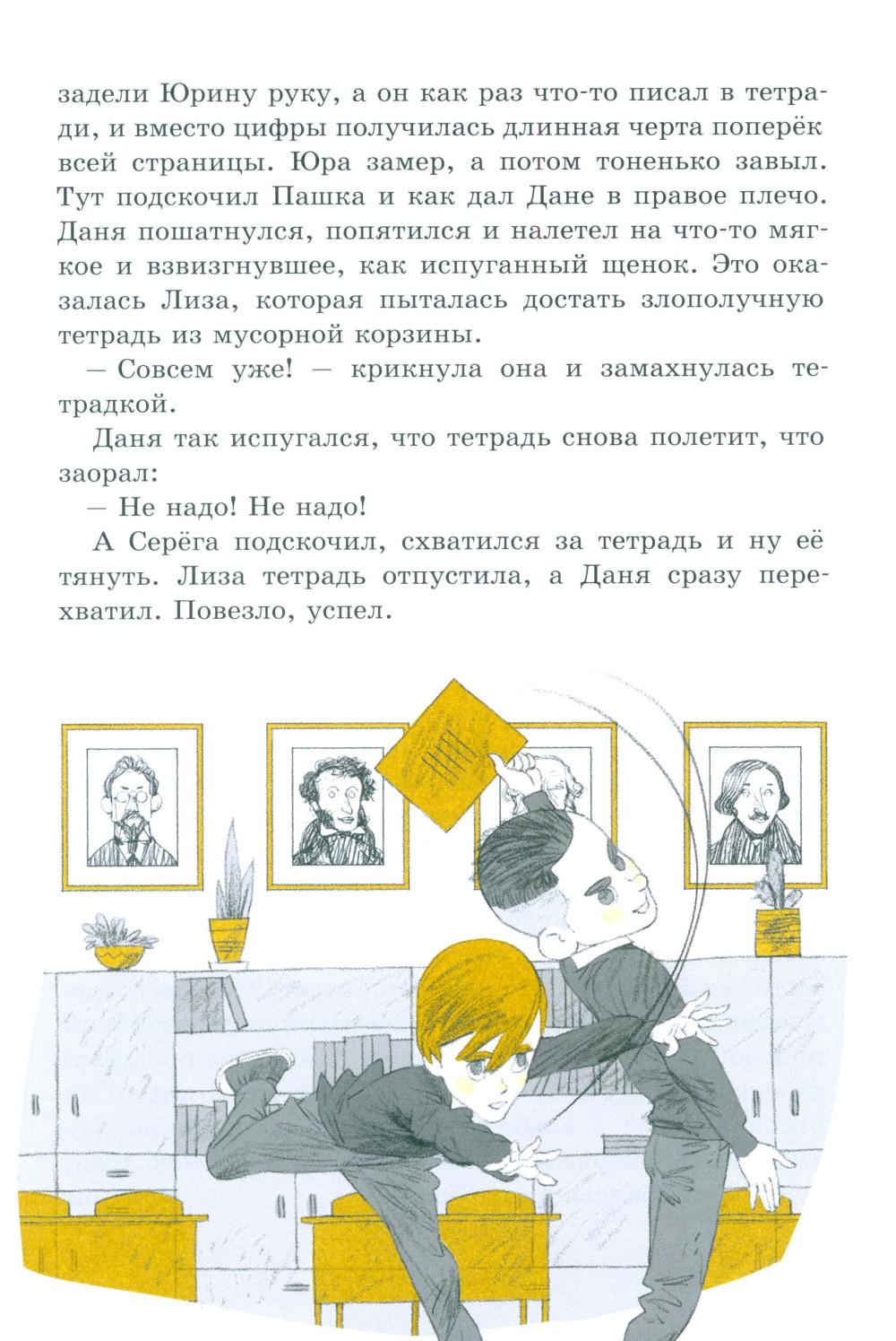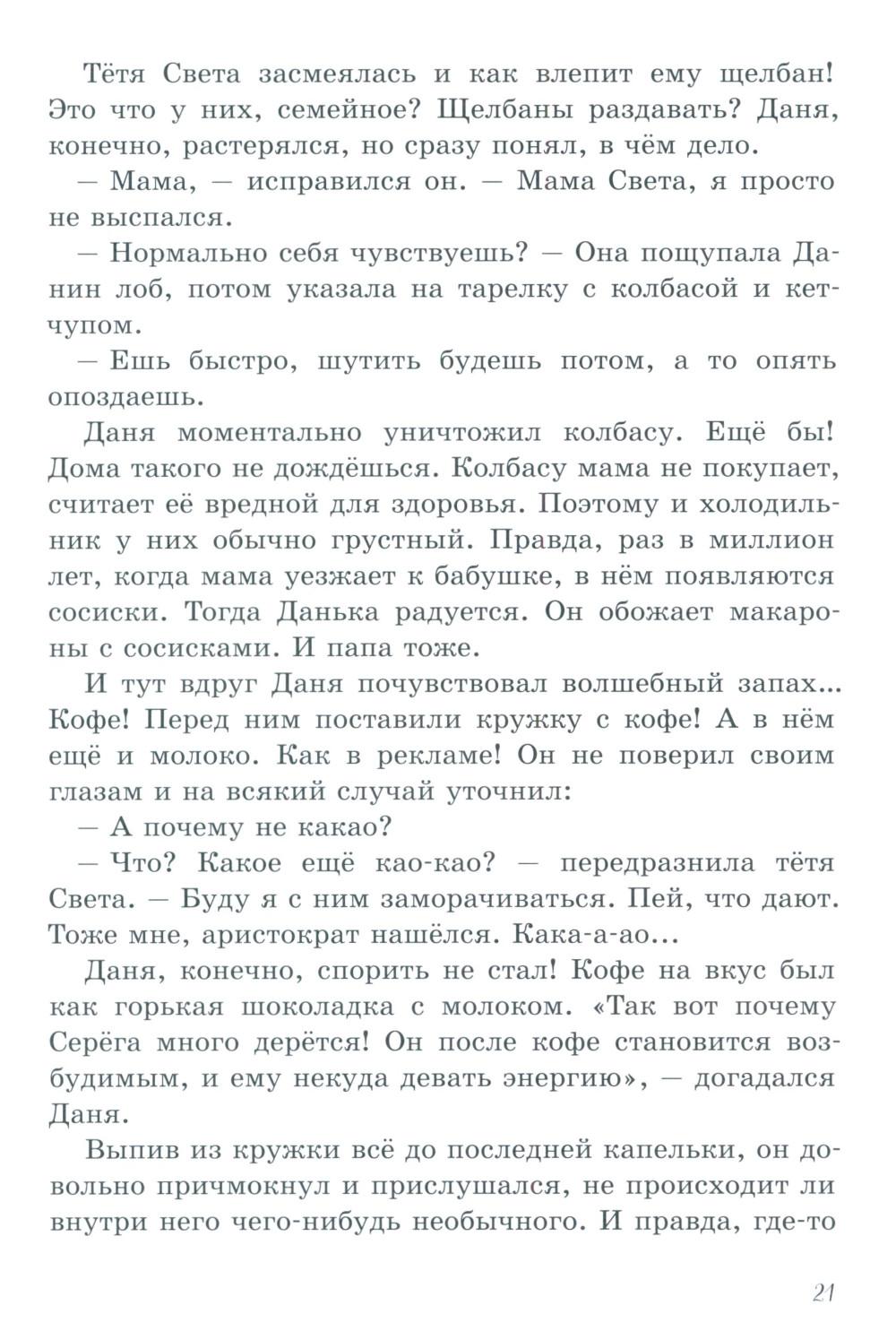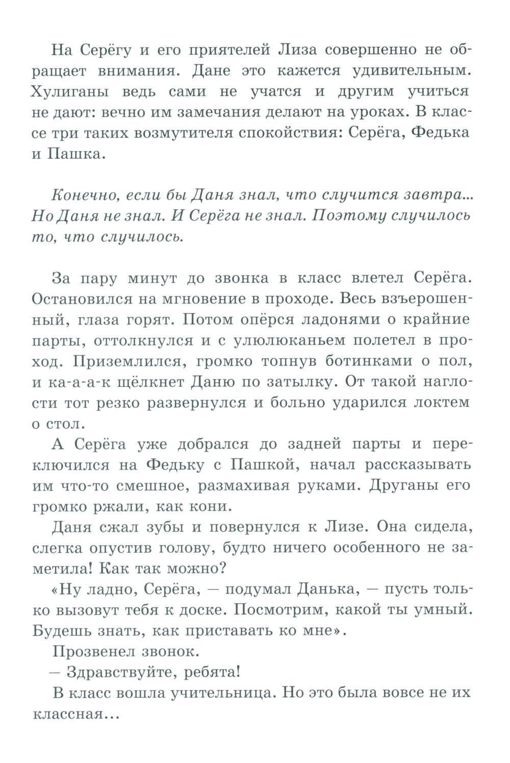 Чудеса творятся у второклашек! Два непримиримых врага, умник Данька и задира Серёга вдруг поменялись телами. А значит, и родителями, и квартирами, и любимыми занятиями. Невероятно, но факт: к этому странному событию имеет прямое отношение самая лучшая и самая мудрая учительница Василиса Никитична! У мальчишек начинается непростая жизнь, полная испытаний и нелепых казусов. Ребята изо всех сил пытаются придумать способы все исправить и временно приспособиться к жизни в новых семьях и непривычному кругу общения. Но не тут-то было! Данька - «заучка»-книголюб, увлекается герпетологией, в целом пай мальчик и даже толком не знает, как гонять футбольный мяч, а Серега - баламут, хулиган, заядлый футболист и не привык учить уроки. Постепенно до мальчишек доходит: чтобы вернуть себе свои жизни, они должны помочь друг другу стать лучше. Этот процесс ох как не прост! Даня начинает помогать Сереже с уроками, и тот медленно-медленно, но все более охотно и даже успешно начинает постигать премудрости школьной программы. А Сереже, кто бы мог подумать, удается приобщить Даньку к футболу. Постепенно меняется их отношение друг к другу. Теперь они если еще не совсем друзья, но уж точно не враги. Финал книги впечатляющий. Паникуя и впадая в отчаяние, в самый последний момент Сережа вспоминает Данькины обучающие приемы и решает итоговый тест по математике на отлично. А Данька, в свою очередь, тоже в первые минуты поддается панике и отчаянию, потом собирается с духом, успешно ловит летящие в ворота мячи и выводит футбольную команду к победе. Зачем понадобилось такое превращение, к чему оно в конечном итоге привело, вернутся ли мальчишки в свои тела и при чем здесь Василиса Никитична, узнают из этой веселой книги дети младшего школьного возраста.| Издательство | Мелик-Пашаев |