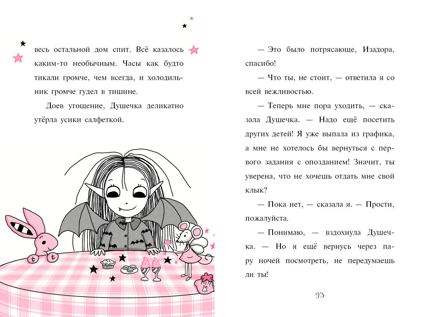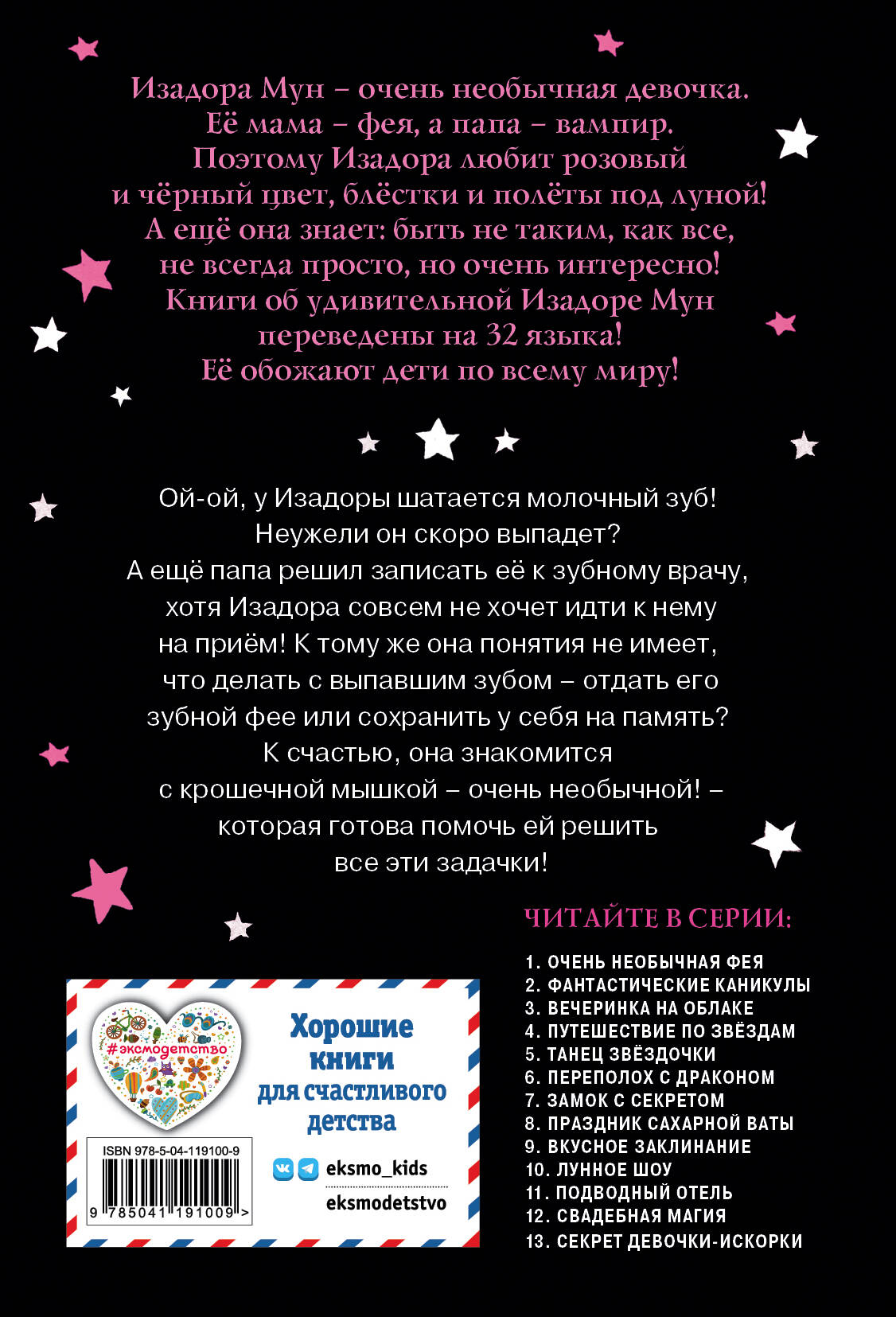 У Изадоры зашатался молочный зуб! У вампиров принято хранить выпавшие клыки в рамке под стеклом, а феи отдают свои зубки зубной фее. Изадора никак не может решить, как ей поступить… пока однажды ночью к ней не наведывается волшебная мышка. Благодаря её помощи Изадора создаёт новую традицию. Совершенно необыкновенную - такую же, как она сама! Книги об удивительной Изадоре Мун переведены на 32 языка! Её обожают дети по всему миру! Внутри милые чёрно-розовые иллюстрации. Крупный шрифт, лёгкий слог, интересный сюжет - прекрасно подойдёт для самостоятельного чтения.| Издательство | ООО "Издательство "Эксмо" |