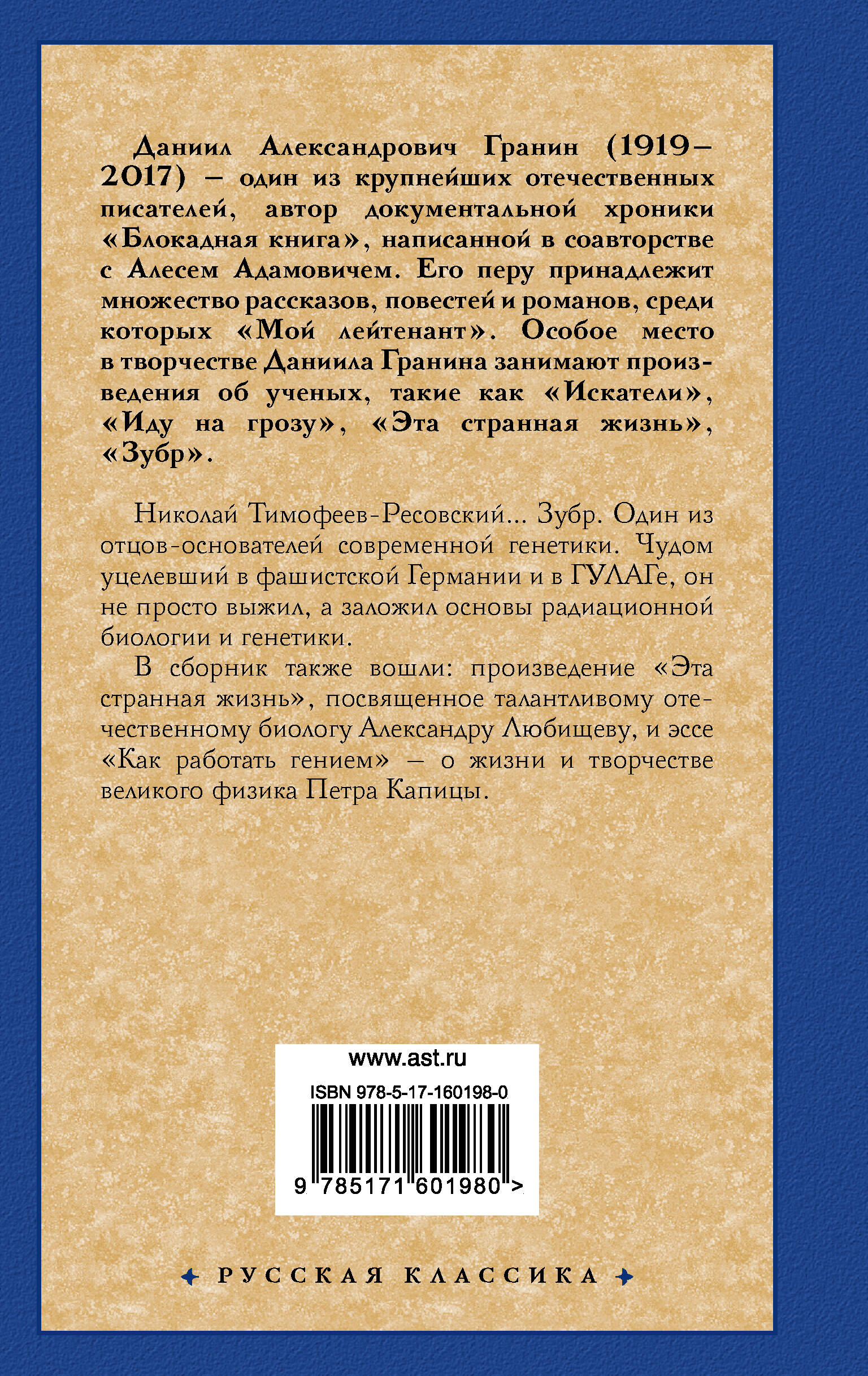 Даниил Александрович Гранин (1919-2017) - один из крупнейших отечественных писателей, автор документальной хроники, множества рассказов, повестей и романов. Особое место в его творчестве занимают произведения об ученых. Николай Тимофеев-Ресовский… Зубр. Один из отцов-основателей современной генетики. Чудом уцелевший в фашистской Германии и в ГУЛАГе, он не просто выжил, а заложил основы радиационной биологии и генетики. В сборник также вошли: произведение "Эта странная жизнь", посвященное талантливому отечественному биологу Александру Любищеву, и эссе "Как работать гением" - о жизни и творчестве великого физика Петра Капицы.| Издательство | ИЗДАТЕЛЬСТВО "АСТ" |