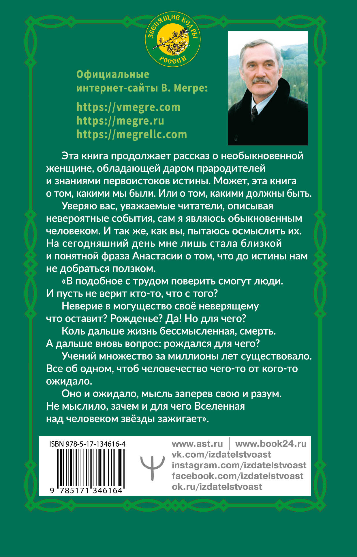 Два человека, представители двух разных земных цивилизаций, встретились на безлюдном берегу сибирской реки Обь. Она - представительница древнейшего рода, молодая отшельница сибирской тайги, а он - современный предприниматель, который высмеивал ее образ жизни, философские умозаключения и предсказания. Впоследствии он, оставив бизнес, все же изложил их в своей книге под названием «Анастасия». И вскоре… по миру покатилась необычная информационная волна! Сегодня книги серии «Звенящие кедры России» переведены на 20 языков и с успехом продаются в европейских странах, Америке и Азии, о них высказываются религиозные деятели и ученые. Эта книга продолжает рассказ о необыкновенной женщине, обладающей даром прародителей и знаниями первоистоков истины. Может, эта книга о том, какими мы были. Или о том, какими должны быть.