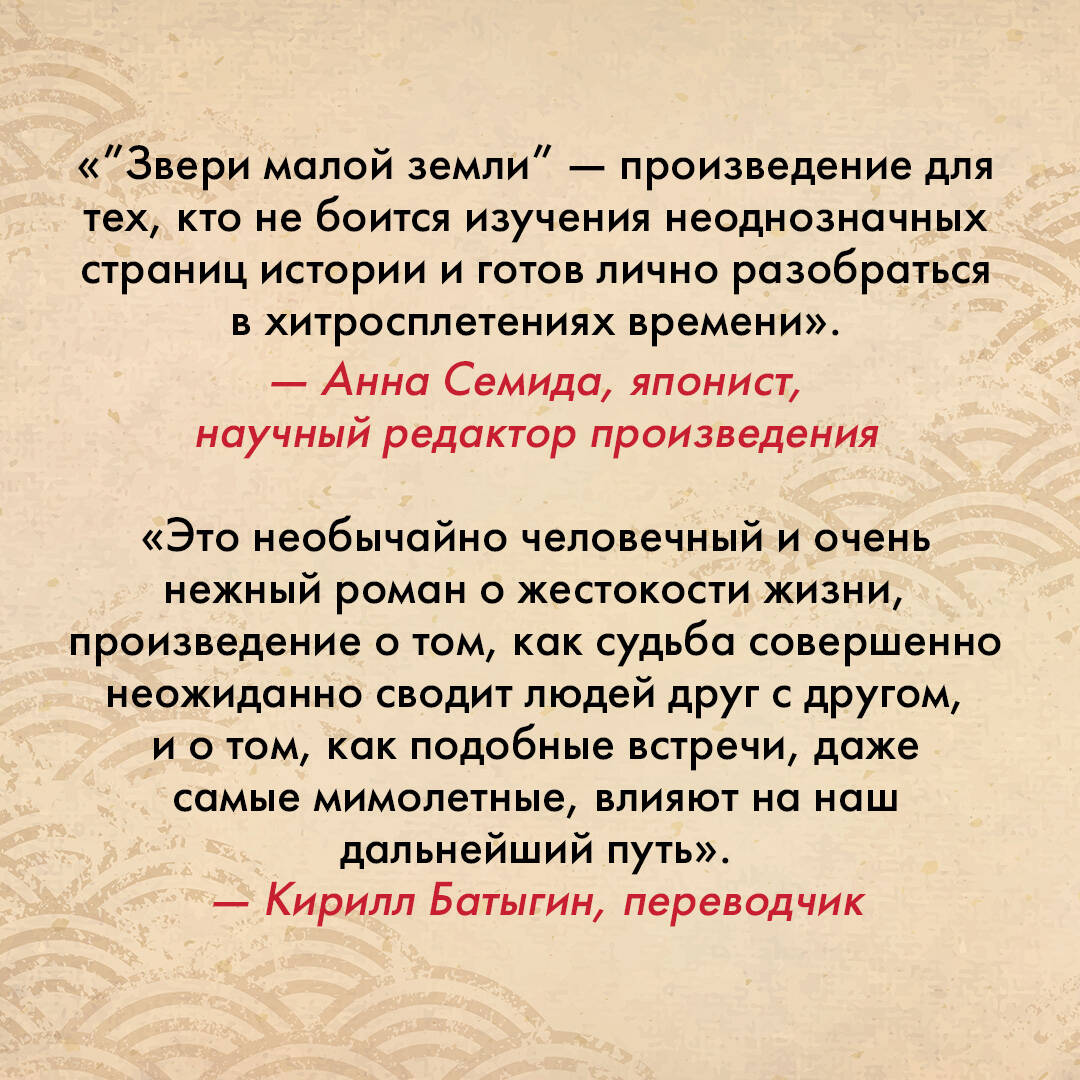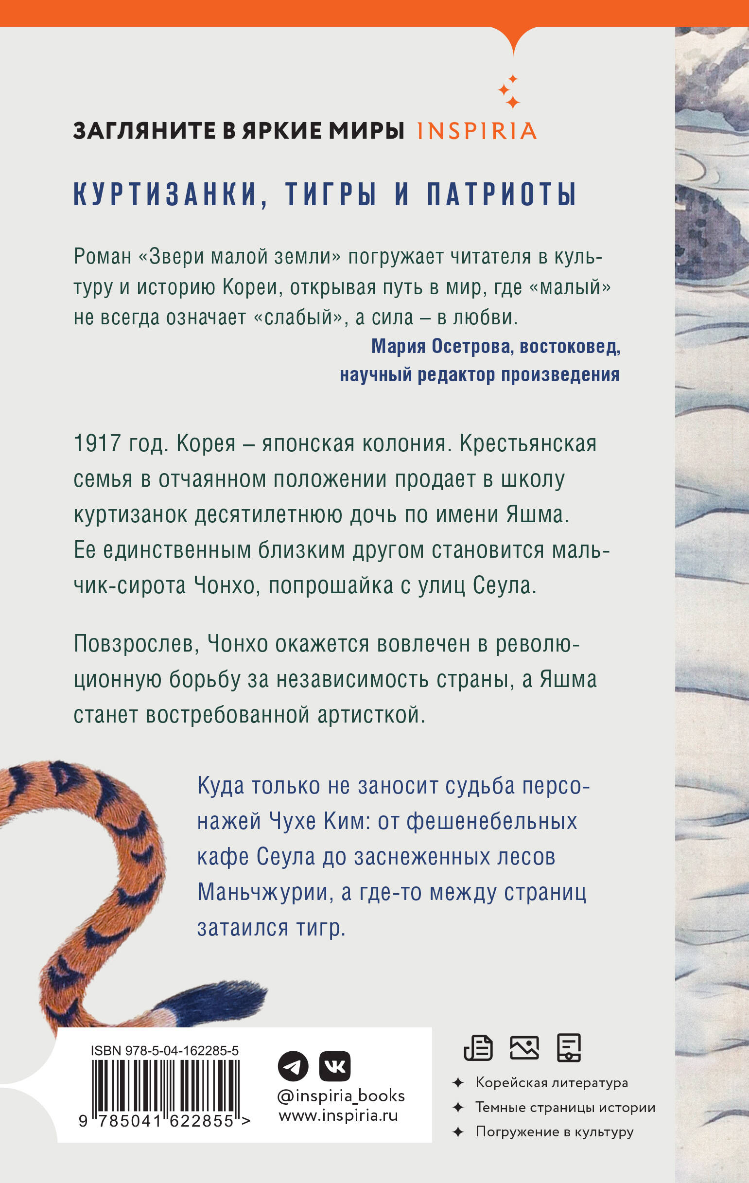 Куртизанки, тигры и патриоты: почему стоит прочитать роман «Звери малой земли»? «Роман "Звери малой земли" погружает читателя в культуру и историю Кореи, открывая путь в мир, где "малый" не всегда означает "слабый", а сила - в любви». - Мария Осетрова, востоковед, научный редактор произведения 1917 год. Корея - японская колония. Крестьянская семья в отчаянном положении продает в школу куртизанок десятилетнюю дочь по имени Яшма. Ее единственным близким другом становится мальчик-сирота Чонхо, попрошайка с улиц Сеула. Повзрослев, Чонхо окажется вовлечен в революционную борьбу за независимость страны, а Яшма станет востребованной артисткой. Куда только не заносит судьба персонажей Чухе Ким: от фешенебельных кафе Сеула до заснеженных лесов Маньчжурии, а где-то между страниц затаился тигр. «"Звери малой земли" - произведение для тех, кто не боится изучения неоднозначных страниц истории и готов лично разобраться в хитросплетениях времени». - Анна Семида, японист, научный редактор произведения «Это необычайно человечный и очень нежный роман о жестокости жизни, произведение о том, как судьба совершенно неожиданно сводит людей друг с другом, и о том, как подобные встречи, даже самые мимолетные, влияют на наш дальнейший путь». - Кирилл Батыгин, переводчик