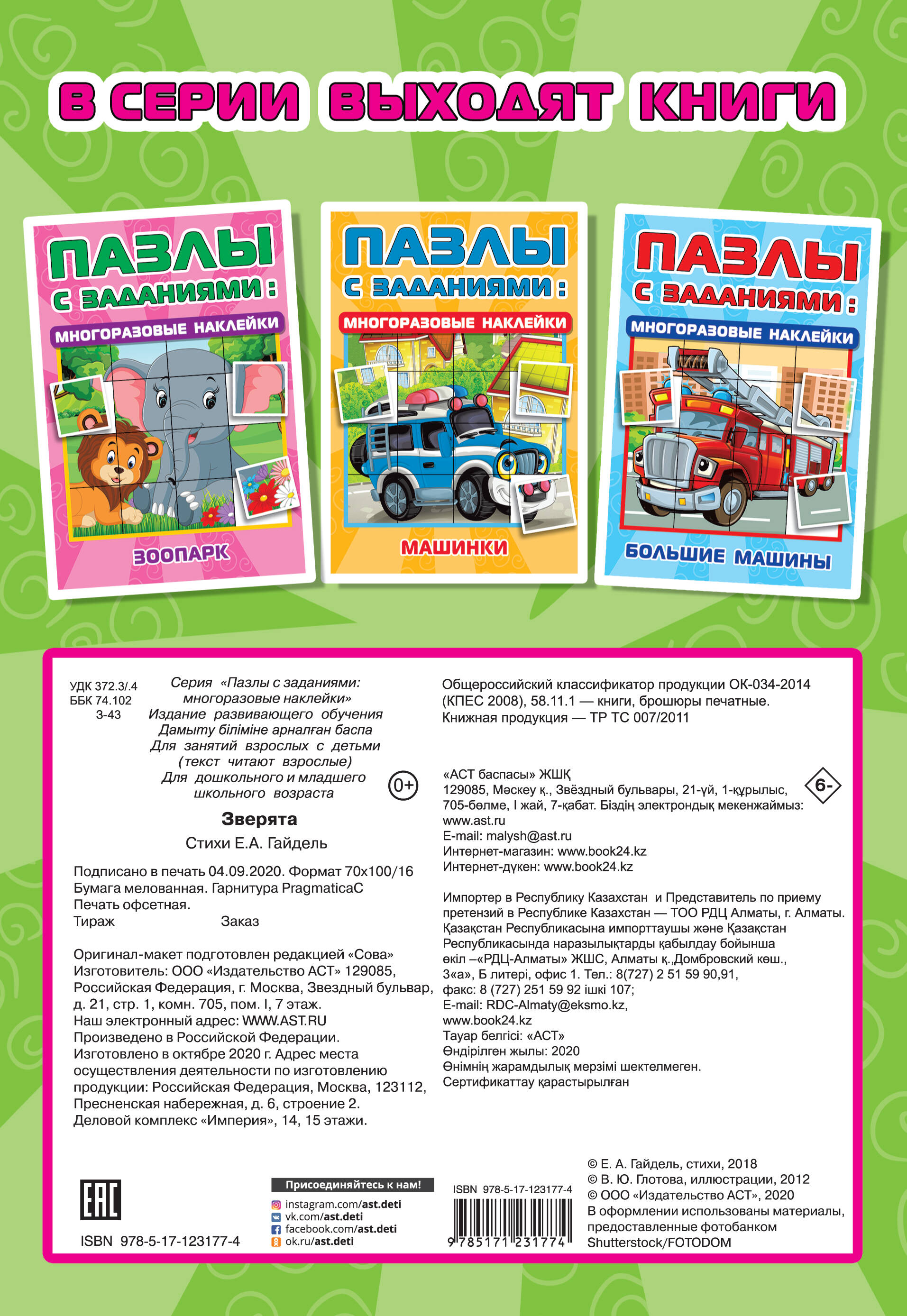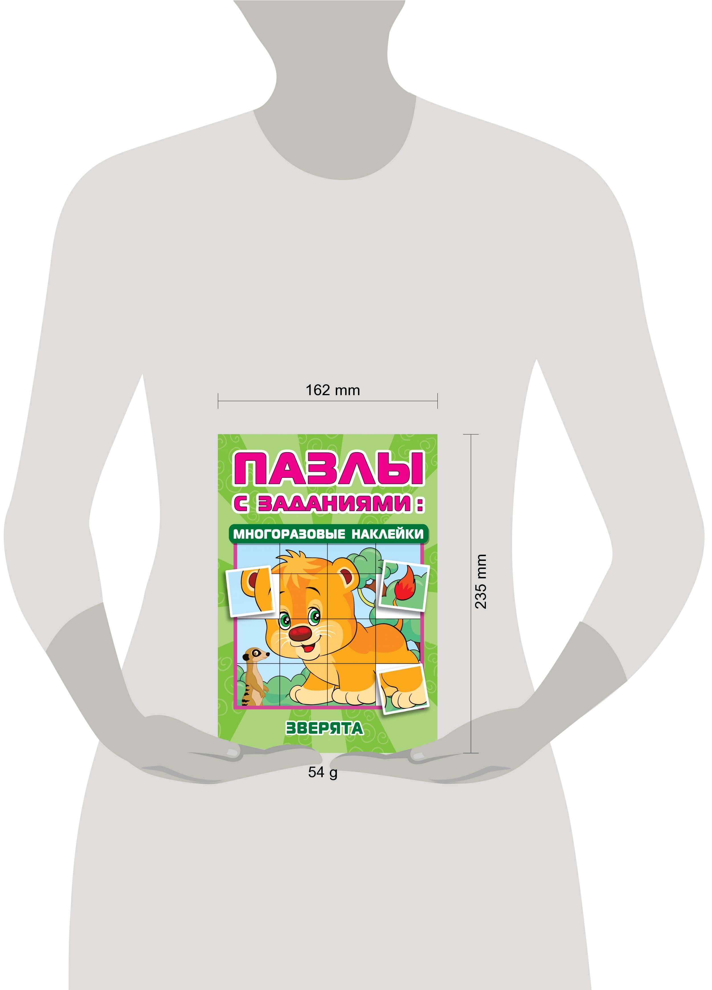 О чем эта книга Прекрасно иллюстрированная книжка-игра с весёлыми загадками о животных + набор красочных многоразовых наклеек. Кому эта книга будет интересна Отличный подарок для дошколят - занимательная, полезная игра + набор красочных стикеров, которые можно наклеивать на страницы книги много-много раз. Каковы особенности этой книги • На каждой странице книги - яркие иллюстрации и занимательные задания. • Многоразовые пазлы-наклейки можно приклеивать и отклеивать хоть 100 раз. • Чтение весёлых загадок о животных и поиск наклеек сделают игровые занятия увлекательными и полезными. • Это прекрасный тренажер для развития мелкой моторики и пространственного мышления - малыш научится правильно подбирать и располагать наклейки в подходящих местах. • Книжка с пазлами-наклейками поможет раскрыть интеллектуальный и творческий потенциал ребёнка, подарит много положительных эмоций. Играя с пазлами-наклейками, малыш сможет создать картинки животных своими руками