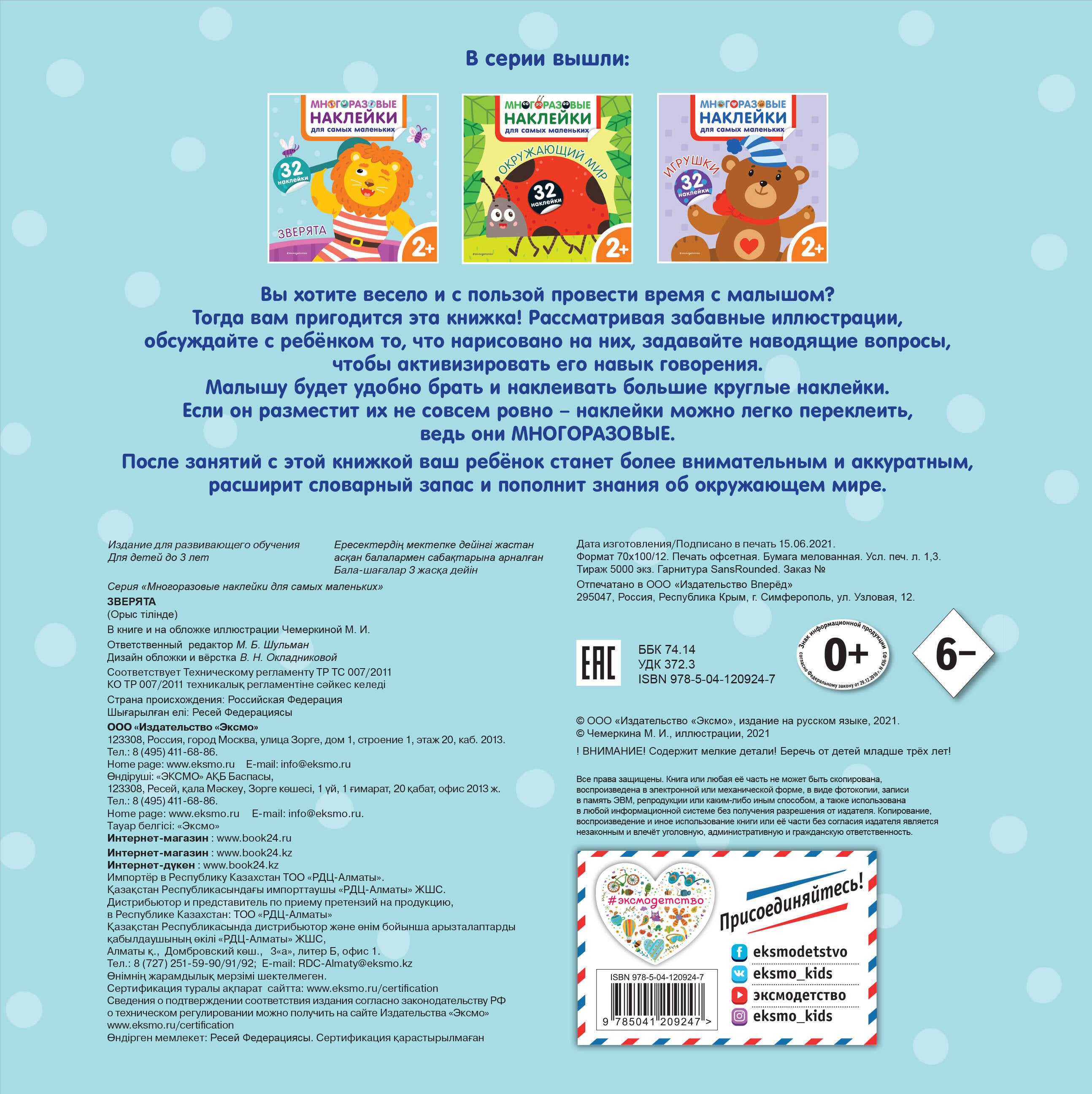 Серия «Многоразовые наклейки для самых маленьких» специально разработана для малышей: небольшой квадратный размер, крупные круглые наклейки, яркие иллюстрации. С одной стороны, играя с книгой, малыш весело проведёт время, ведь он будет «оживлять» картинки с помощью наклеек. С другой - одновременно разовьёт внимание, мышление и воображение, ведь соответствующую наклейку ещё нужно найти! А отвечая на вопросы к картинкам, он попрактикуется в разговорной речи и расширит словарный запас.| Издательство | ООО "Издательство "Эксмо" |
