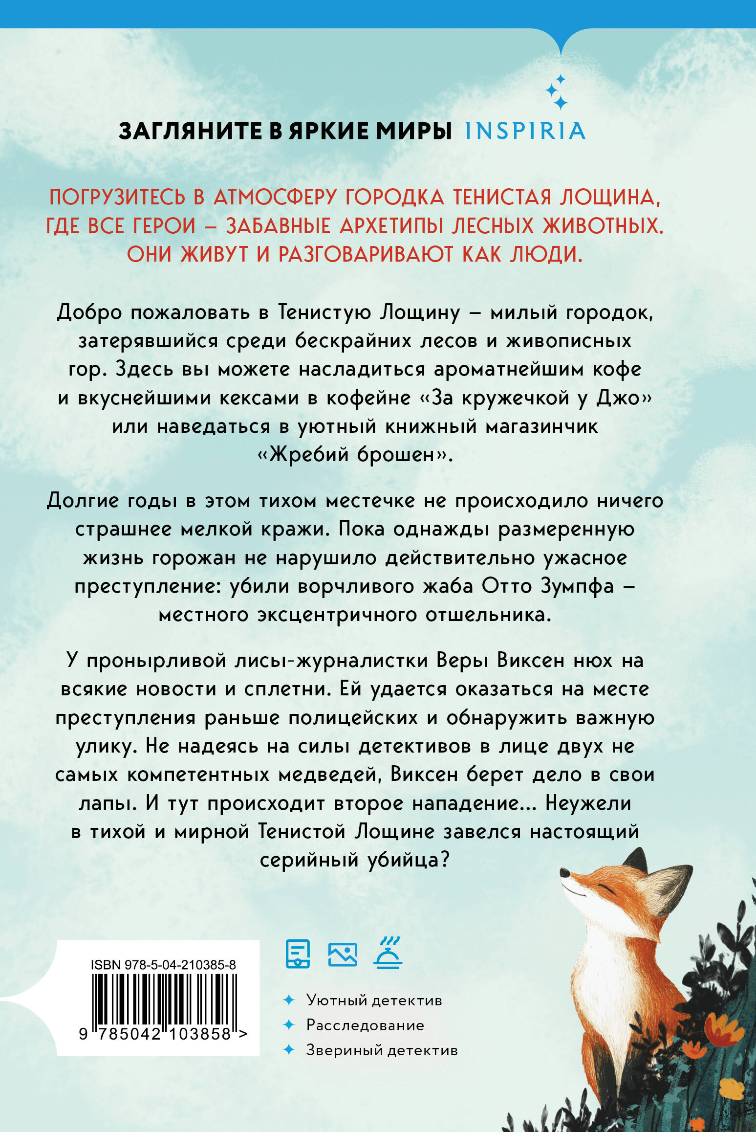 ЧТО, ЕСЛИ БЫ ВСЕМИ ЛЮБИМЫЕ КНИЖНЫЕ ГЕРОИ-ДЕТЕКТИВЫ СТАЛИ… ЖИВОТНЫМИ? КЕМ БЫ ТОГДА БЫЛА МИСС МАРПЛ? А ГЕНИАЛЬНЫЕ ЭРКЮЛЬ ПУАРО И ШЕРЛОК ХОЛМС? ОСТРОУМНЫЙ И УЮТНЫЙ ДЕТЕКТИВ, СОЕДИНЯЮЩИЙ ИЗОБРЕТАТЕЛЬНОСТЬ АГАТЫ КРИСТИ И ОЧАРОВАНИЕ КНИГ БЕАТРИС ПОТТЕР. ПОГРУЗИТЕСЬ В АТМОСФЕРУ ГОРОДКА ТЕНИСТАЯ ЛОЩИНА, ГДЕ ВСЕ ГЕРОИ - ЗАБАВНЫЕ АРХЕТИПЫ ЛЕСНЫХ ЖИВОТНЫХ. ОНИ ЖИВУТ И РАЗГОВАРИВАЮТ КАК ЛЮДИ С УЗНАВАЕМЫМИ ЗВЕРИНЫМИ ЧЕРТАМИ. Добро пожаловать в Тенистую Лощину - милый городок, затерявшийся среди бескрайних лесов и живописных гор. Здесь вы можете насладиться ароматнейшим кофе и вкуснейшими кексами в кофейне «За кружечкой у Джо» или наведаться в уютный книжный магазинчик «Жребий брошен». Долгие годы в этом тихом местечке не происходило ничего страшнее мелкой кражи. Пока однажды размеренную жизнь горожан не нарушило действительно ужасное преступление: убили ворчливого жаба Отто Зумпфа - местного эксцентричного отшельника. У пронырливой лисы-журналистки Веры Виксен нюх на всякие новости и сплетни. Ей удается оказаться на месте преступления раньше полицейских и обнаружить важную улику. Не надеясь на силы детективов в лице двух не самых компетентных медведей, Виксен берет дело в свои лапы. И тут происходит второе нападение… Неужели в тихой и мирной Тенистой лощине завелся настоящий серийный убийца? _________________________________________________________ «Книги Блэка... стали моими любимыми новинками для комфортного чтения. Напряженный сюжет, лаконичная проза и светлая атмосфера. Виксен и другие существа не похожи на антропоморфных героев Диснея. Я с нетерпением жду новой книги в серии про Тенистую лощину». - The New York Times «Волшебное лакомство, которое пробудит в вас ностальгию по сказкам вашего детства. Оно оригинальное и остроумное, очаровательное и находчивое. Я прочла "Зверские убийства в Тенистой Лощине" за один присест и не могу дождаться продолжения». - Сара Эдисон Аллен, автор мировых бестселлеров «Садовые чары» и «Хранитель персиков» «Нужна книга, чтобы провести с ней время у камина? Вот она! "Зверские убийства в Тенистой Лощине", должно быть, самая уютная из детективных историй. Это загадочное лесное убийство не похоже ни на что другое! Мне не только понравилось читать о нем - я хочу жить там, в окружении загадочных панд, трудолюбивых мышей и начитанных ворон. Я должна попробовать еду, послушать сплетни и зайти в небольшое кафе, - и меня не волнует, что убийца разгуливает на свободе!» - Леони Свонн, автор детектива «Гленнкилл: следствие ведут овцы» «Абсолютно восхитительное уютное чтение… На этих страницах также появляется удивительное сопереживание, что относит эту книгу к числу душевных, несмотря на убийство, про которое в ней рассказывается». - Criminal Element «"Обитатели холмов" встречаются с Микки Спиллейном. Детектив редкого зловещего очарования». - Алан Брэдли, автор цикла про Флавию де Люс «В этой увлекательной истории солнечная атмосфера и убийство сочетаются в идеальной пропорции, чтобы читатели могли развлечься и погрузиться в обманчиво безмятежную Тенистую лощину». - Shelf Awareness «Приготовьтесь влюбиться в Тенистую лощину и ее причудливых героев-животных. Очаровательная и умная Джуно Блэк поведет читателей в увлекательное путешествие по мере раскрытия тайн. Мне не терпится прочитать больше!» - писательница Эми Э. Райхерт «Агата Кристи встречает Беатрис 