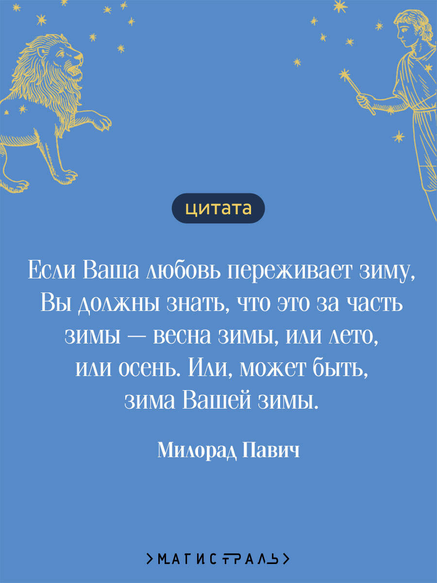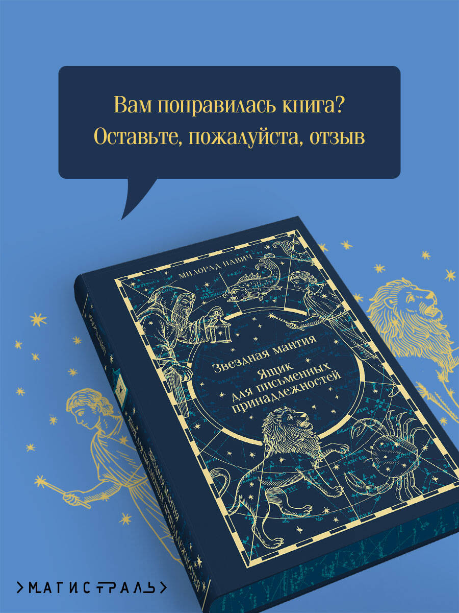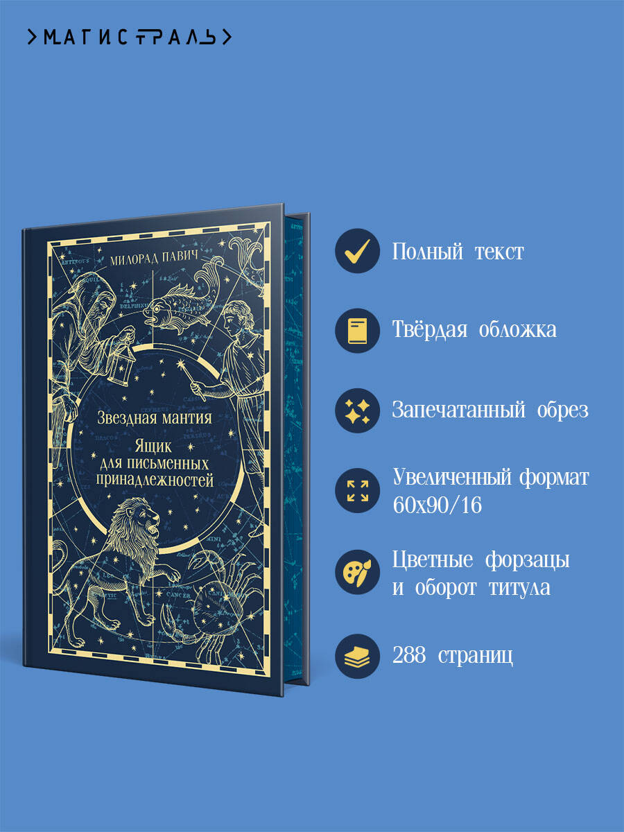 Новая серия классики для поклонников «Магистраль. Главный тренд» в твердой обложке. Безупречность стиля, лаконичность, тактильные материалы, цветные форзацы, рисунок на обрезе. Милорад Павич - знаковый сербский писатель, в произведениях которого магический реализм переплетается с гипертекстуальностью. Это позволяет читателю влиять на сюжет. Два его романа - «Звездная мантия» и «Ящика для письменных принадлежностей» издаются под одной обложкой. «Звездная мантия» - это путеводитель по знакам Зодиака. Главная героиня обнаруживает, что стоит ей заснуть, как она перерождается под знаком другого созвездия. Она становится девушкой из Средневековья, влюбленной в парня-Водолея и собирающейся кого-то убить. Просыпается женщиной из XX столетия, у которой есть враг в XVIII веке, родившийся под знаком Стрельца и крадущий ее время и молодость. Оказывается под бомбардировкой Югославии, страдая от любви к Тельцу, забывшему, как ее зовут… Переносясь по страницам справочника зодиакальных созвездий, вам предстоит определить судьбу героини: вернуть ей имя и воссоединить влюбленных или, ничего не предприняв, оставить их разбитыми посреди войны. История «Ящика для письменных принадлежностей» начинается в момент окончания. Внутри ящика - в открытках, объявлении, рецепте, рукописи, вырванных из книги страницах, на пленке и фотографии - запечатлена непростая история любви двух неординарных личностей. Она умеет читать запахи и дважды покупает совершенно бесплатно самую дорогую шубу в Париже. Он ищет девушку с женской версией «Хазарского словаря» и забывает родной сербский язык за семь уроков. Их отношения измеряются любовными часами, которые отмеряют длительность любовного акта... Это роман-загадка, роман-лабиринт. Это рассказ без слов о том, что такое любовь. В романе две концовки, одну из которых можно открыть, перейдя по QR-коду.| Издательство | ООО "Издательство "Эксмо" |