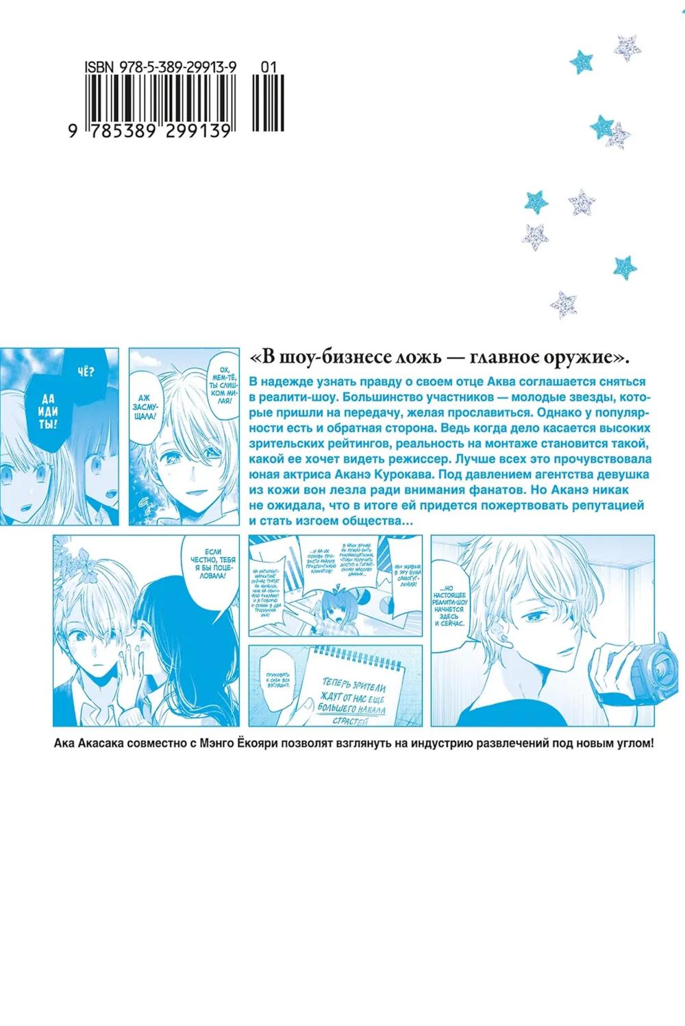 В надежде узнать правду о своем отце, Аква соглашается сняться в реалити-шоу. Большинство участников - молодые звезды, которые пришли на передачу, желая прославиться. Однако у популярности есть и обратная сторона. Ведь, когда дело касается высоких зрительских рейтингов, реальность на монтаже становится такой, какой ее хочет видеть режиссер. Лучше всех это прочувствовала юная актриса Аканэ Курокава. Под давлением агентства, девушка из кожи вон лезла ради внимания фанатов. Но Аканэ никак не ожидала, что в итоге ей придется пожертвовать репутацией и стать изгоем общества...| Издательство | Азбука |