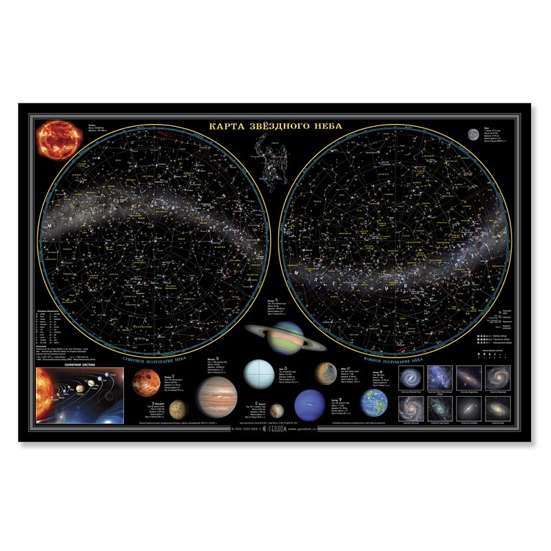На карте зведного также отражена Солнечная система - Солнце и обращающиеся вокруг него небесные тела - 8 планет. Для более точного представления звездного неба даны таблицы характеристик планет, галактик, туманностей, самых ярких звезд и других космических объектов.