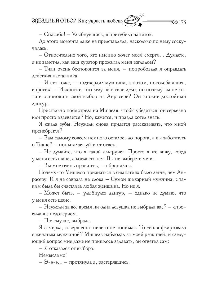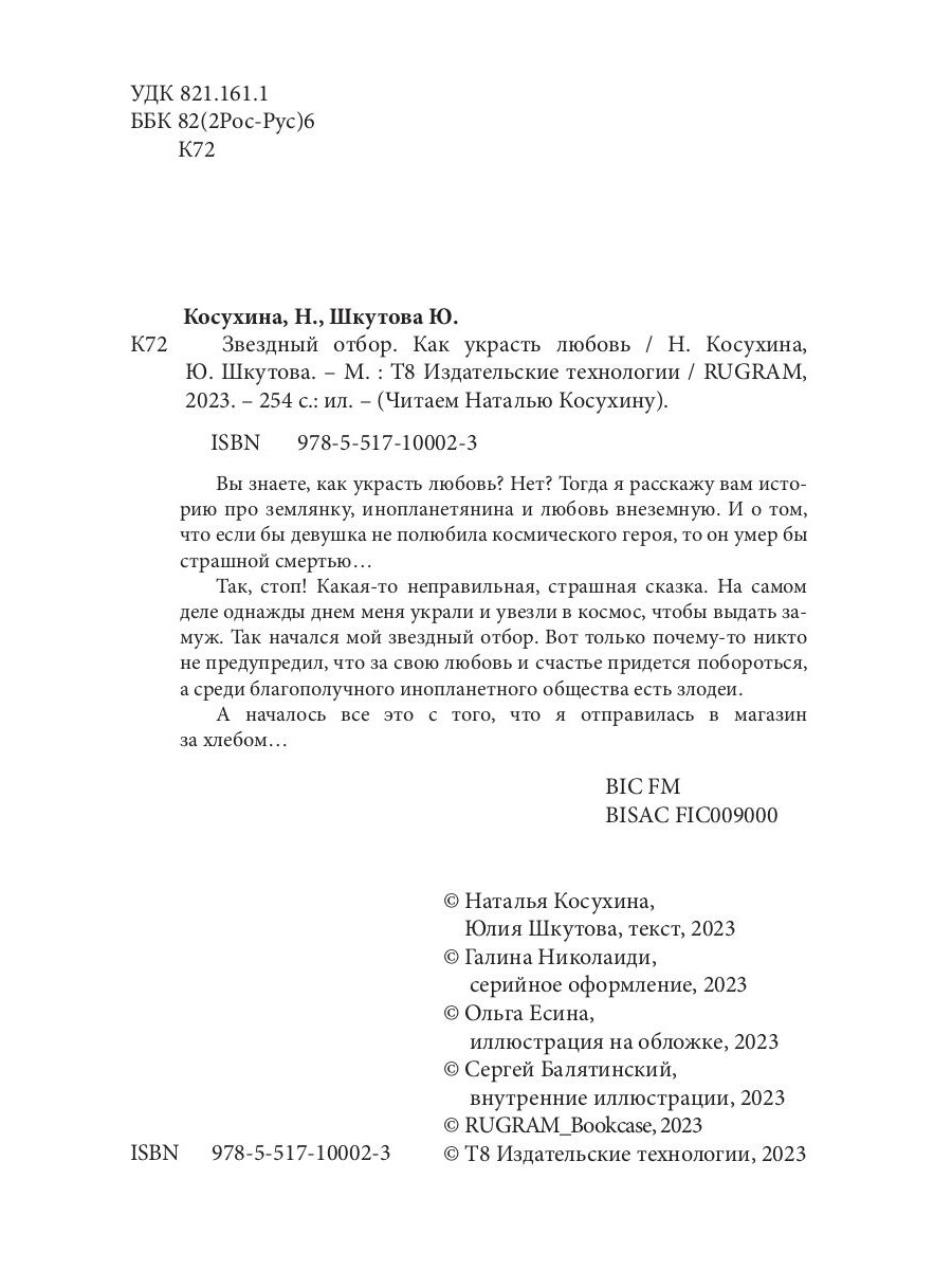 Вы знаете, как украсть любовь? Нет? Тогда я расскажу вам историю про землянку, инопланетянина и любовь внеземную. И о том, что если бы девушка не полюбила космического героя, то он умер бы страшной смертью… Так, стоп! Какая-то неправильная, страшная сказка. На самом деле однажды днем меня украли и увезли в космос, чтобы выдать замуж. Так начался мой звездный отбор. Вот только почему-то никто не предупредил, что за свою любовь и счастье придется побороться, а среди благополучного инопланетного общества есть злодеи. А началось все это с того, что я отправилась в магазин за хлебом…| Издательство | Т8 RUGRAM |