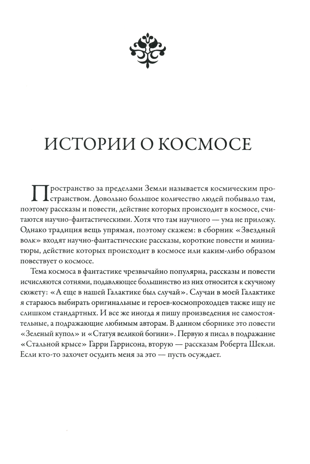 В новый авторский сборник "Звездный волк" признанного классика отечественной фантастики Святослава Логинова вошли преимущественно рассказы и повести, ранее не издававшиеся, а также несколько "редкостей" разных лет. Глубокий космос, мрачный, холодный, но наполненный самой разнообразной жизнью, далекие галактики, загадочные инопланетные цивилизации, первые контакты с чуждым разумом - вот темы сборника.