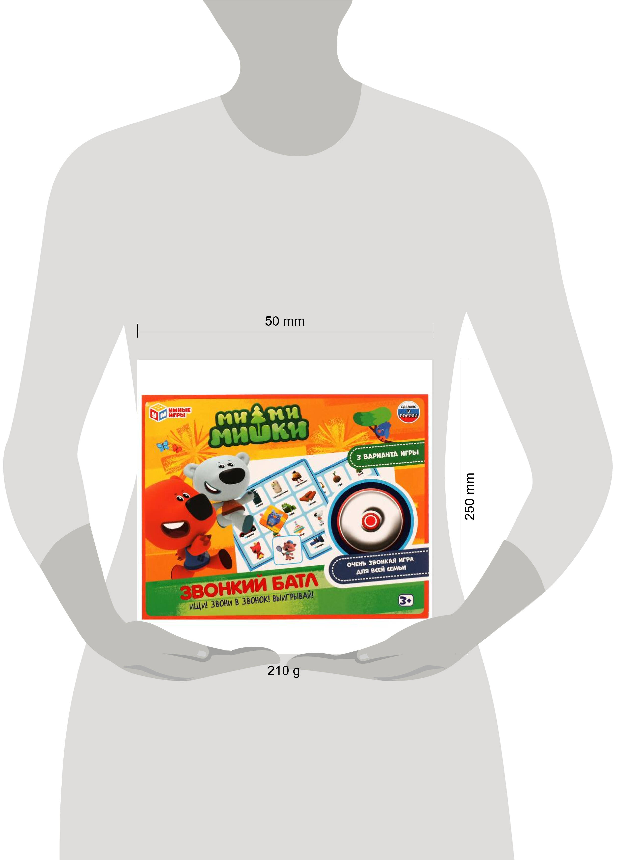 IНастольная игра со звонком "Ми-ми-мишки. Звонкий батл" ТМ "Умные игры" - весёлая и очень звонкая игра для всей семьи! Особенности: - 3 варианта игры - красочный дизайн с любимыми персонажами - количество игроков: от 2-х человек - продолжительность игры: от 15 минут Состав игры: - звонок - правила игры - 3 карточки-основы - 81 фишка Эта увлекательная игра поможет выучить азбуку, закрепить полученные знания и просто хорошо провести время. Выбирайте подходящий вариант игры, находите нужные картинки и нажимайте на звонок! ИГРА "НАЙДИ КАРТИНКУ" 2+ игрока, 15 минут Ход игры Начинает игру самый младший игрок. Далее ход переходит по часовой стрелке. Игроки по очереди переворачивают фишки и ищут на карточках-основах такую же картинку или букву, как на карточке. Когда игрок находит совпадающую картинку, он нажимает на звонок. Если игрок нашёл верную картинку, он забирает фишку себе. Если игрок ошибся, то он получает штрафную фишку с совой, а фишка с картинкой или буквой уходит в сброс. При подсчёте очков каждая штрафная фишка даёт -1 балл. Игра заканчивается после того, как была открыта последняя фишка. Игроки подсчитывают очки: за каждую фишку игроки получают 1 балл, за каждую штрафную фишку с совой -1 балл. Побеждает тот, кто набрал больше всего очков. ИГРА "БУКВОПУТАНИЦА" 2+ игрока, 15 минут Ход игры Начинает игру самый младший игрок. Далее ход переходит по часовой стрелке. Игроки по очереди переворачивают фишки и ищут совпадения на карточках-основах. Если на фишке картинка - игроки ищут на карточке букву, с которой начинается название предмета (для букв Ъ, Ы, Ь - содержит эту букву). Можно использовать синонимы и разные варианты названий. Например, если на фишке изображён Иннокентий, игроки могут искать букву "И" - "Иннокентий", букву "К" - "Кеша" или букву "М" - "Мишка". Если на открытой фишке буква - игроки ищут картинку, название которой начинается с этой буквы. Игрок, который первым находит нужную пару, нажимает на звонок. Если игрок нашёл верную комбинацию, он забирает фишку себе. Если игрок ошибся, то он получает штрафную фишку с совой, а фишка с картинкой или буквой уходит в сброс. При подсчёте очков каждая штрафная фишка даёт -1 балл. Игра заканчивается после того, как была открыта последняя фишка. Игроки подсчитывают очки: за каждую фишку игроки получают 1 балл, за каждую штрафную фишку с совой -1 балл. Побеждает тот, кто набрал больше всего очков. ИГРА "ЛОТО" 2-3 игрока, 15 минут Ход игры Ведущий (если вы играете без ведущего - то каждый игрок по очереди, начиная с самого младшего) достаёт из мешочка фишку. Игроки ищут такую же картинку или подходящую букву (они выделены цветами в подписях к картинкам) на своих карточках-основах. Если игрок нашёл верное совпадение, он забирает фишку себе. Если игрок ошибся, то он получает штрафную фишку с совой, а фишка с картинкой или буквой уходит в сброс. При подсчёте очков каждая штрафная фишка даёт -1 балл. Если вы выбрали вариант игры с буквами, в таком случае на каждой карточке-основе останется одна незаполненная ячейка. В таких ячейках нет подписи к картинке. Игра заканчивается, когда один из игроков полностью заполнил свою карточку-основу. Игроки начинают подсчёт очков: за каждую выложенную на карточку-основу фишку игроки получают 1 балл, за каждую штрафную фишку с совой -1 балл. Побеждает тот, кто набрал больше всего очков. Внимание! Для 