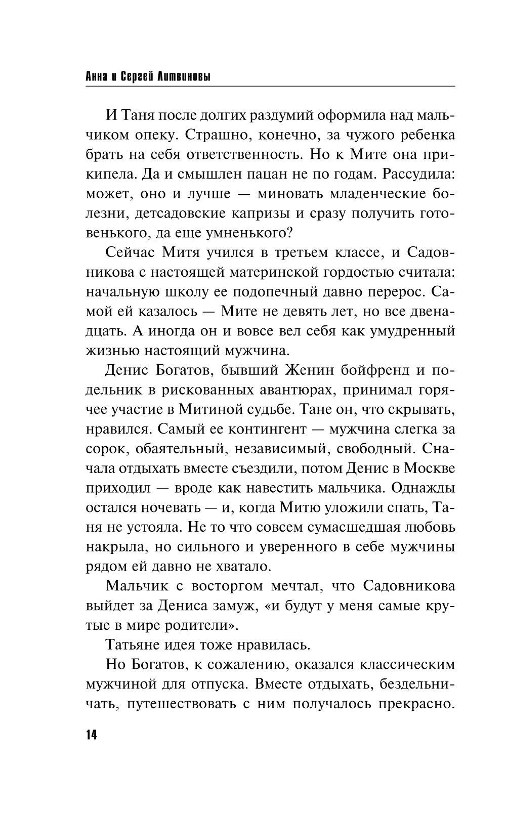 Напрасно Таня Садовникова надеялась, что ей удастся остепениться, стать идеальной матерью и хорошей хозяйкой. Семейные отношения не сложились, но она не отказывается помочь своему бывшему, когда у того при загадочных обстоятельствах погибает отец. По официальной версии причиной стали проблемы со здоровьем, однако Таня и Денис начинают собственное расследование. Вскоре становится ясно: подобная смерть - далеко не единственная, по всей стране пострадали десятки людей. Татьяна горит желанием спасти их, но в итоге сама оказывается в смертельной опасности… Закрученная интрига, понятные и близкие читателю персонажи, современные проблемы - вот секрет успеха хорошего детектива за авторством Литвиновых. Следствие вновь ведут хорошо известные читателям по романам и телесериалам герои - авантюристка Татьяна Садовникова и ее отчим, отставной полковник внешней разведки Валерий Ходасевич.| Издательство | Эксмо |