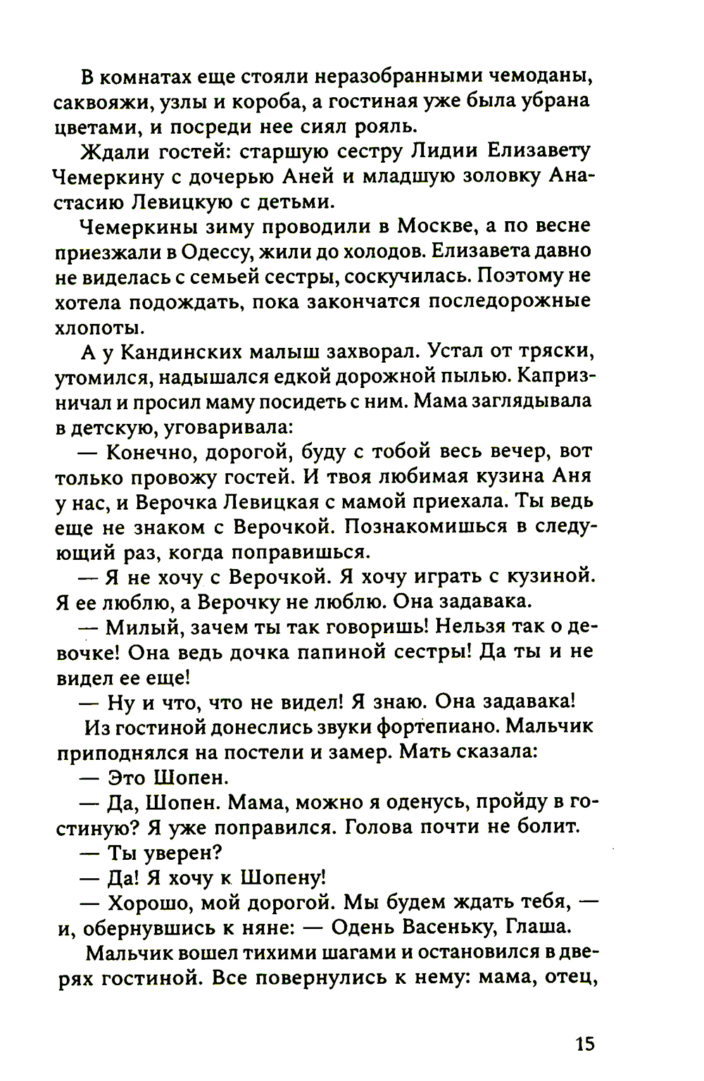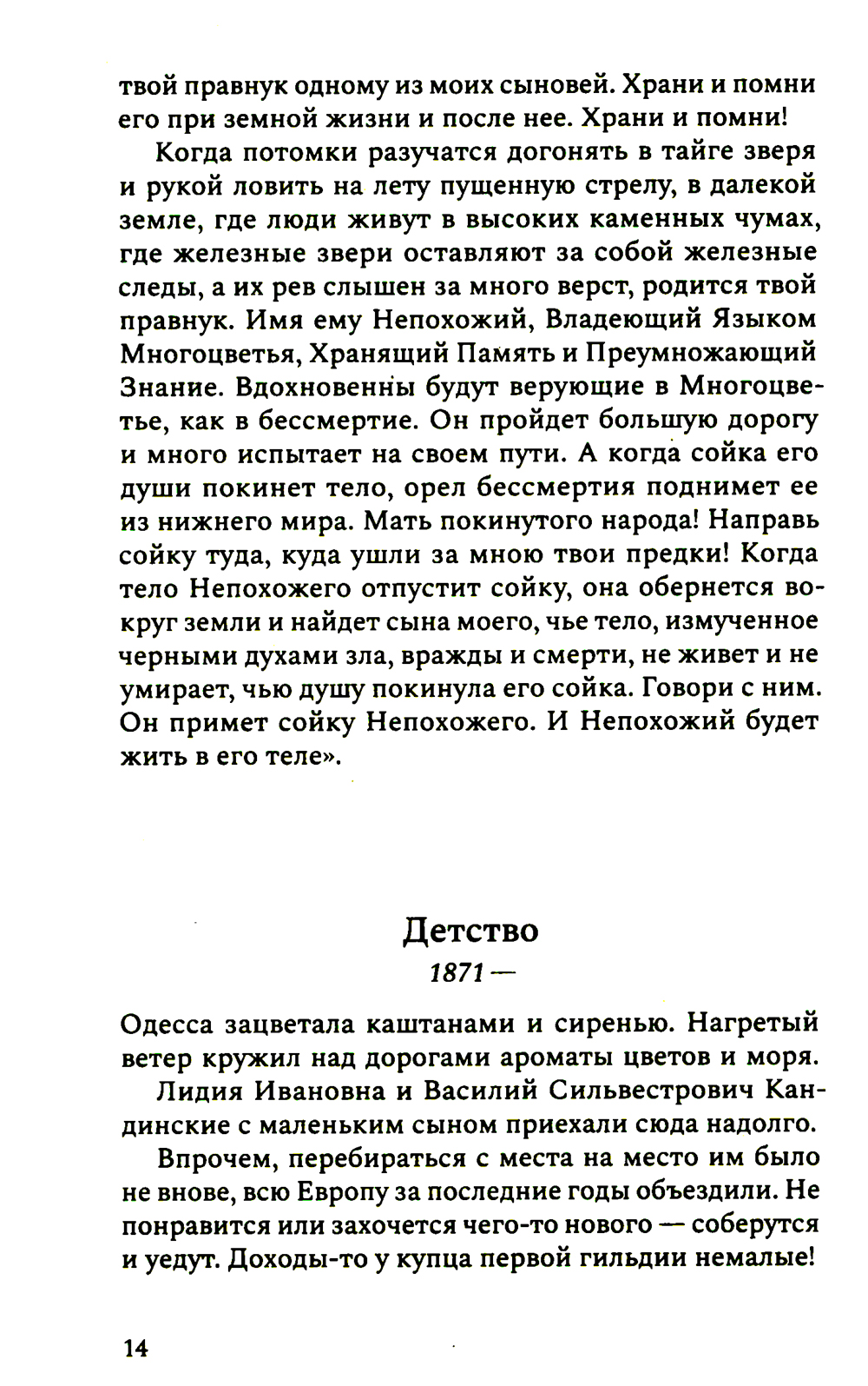 Звуки и цвет, переплетаясь, рождают бурю импульсов, образов, эмоций. Василий Кандинский был способен видеть мир в его пестром единении, и, несмотря на все препятствия и окружающее неодобрение, он не мог не поделиться с миром своим особенным даром. 1885 год. По настоянию отца Василию Кандинскому приходится заняться юриспруденцией. Но тяга к живописи настолько непреодолима, что в 30 лет он решает отдать всего себя искусству, переехав в Германию. Встретив новую любовь, Василий вернулся в Россию. Но революция не дала наслаждаться счастьем долго. Пришлось покинуть дом. В этот раз навсегда. Василий и Нина нашли новое пристанище. Баухаус вновь дарил им счастье. До тех пор, пока к власти в Германии не пришли фашисты... 1946 год. В военном госпитале Мичигана молодой индеец приходит в себя после двухлетней комы, говорит на чистом русском языке и заявляет, что он никто иной, как 77-летний русский художник Василий Кандинский. Стоит ли верить таким диким утверждениям? Возможно ли, что это переселение душ, и где же тогда душа самого Дэвида?| Издательство | ИД Мещерякова |