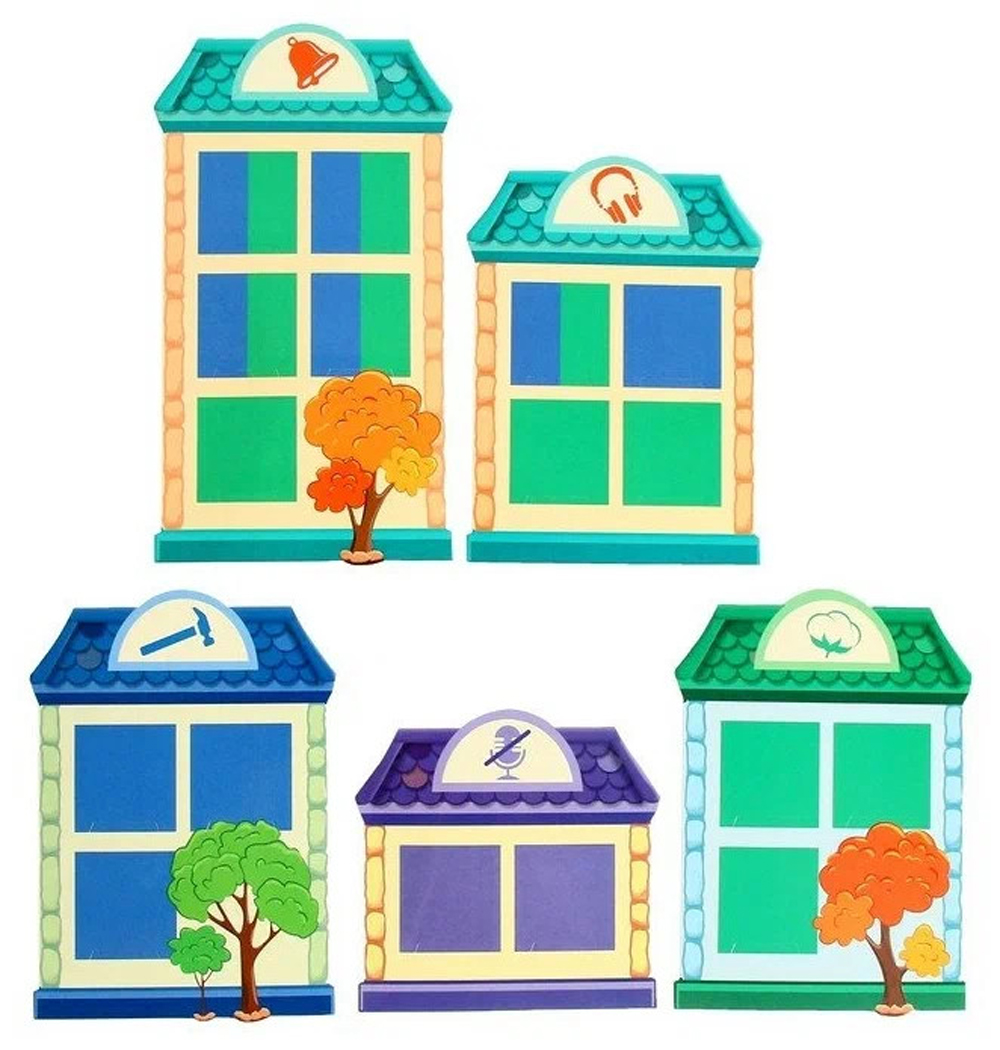 Дидактическая игра «Звуко-буквенные домики» представляет собой 156 картинок: 9 домиков с окошками для букв, звуков, картинок; 66 карточек на ножках с буквами русского алфавита; 12 цветных карточек на ножках для обозначения качественных характеристик звуков; 69 карточек с картинками. Она познакомит детей старшего дошкольного и младшего школьного возраста (5-7 лет) с буквами и звуками русского языка: последовательностью букв в алфавите, основными качественными характеристиками звуков. Цель игры: формировать фонематическое восприятие, закреплять представления детей о звуках и буквах русского языка, готовить детей к обучению грамоте и звуко-буквенному анализу слов, развивать навык чтения. Для этого предлагается выполнить ряд увлекательных заданий: «Найди квартиру для буквы», «Подбери картинки», «Найди жильца», «Найди место в алфавите», «Подружи буквы».