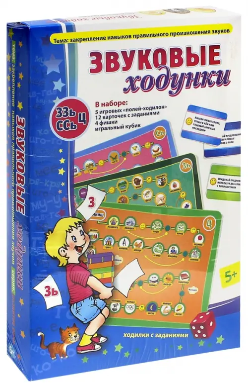 В наборе: 5 игровых "полей-ходилок", 12 карточек с заданиями, 4 фишки, игральный кубик.
