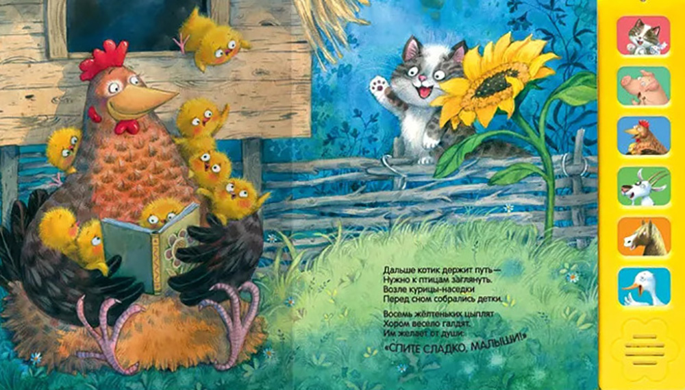 Эта замечательная звуковая книга с волшебными иллюстрациями Л. Ереминой и добрыми стихами обязательно понравится малышу. Вместе с забавным котенком он пожелает: «Спокойной ночи!» - лошадке, утятам, свинке, курице и другим домашним животным. Нажимая на кнопки, ребенок сможет послушать 6 разных звуков: кряканье утят, ржание лошадки и другие.| Издательство | Мозаика-Синтез |