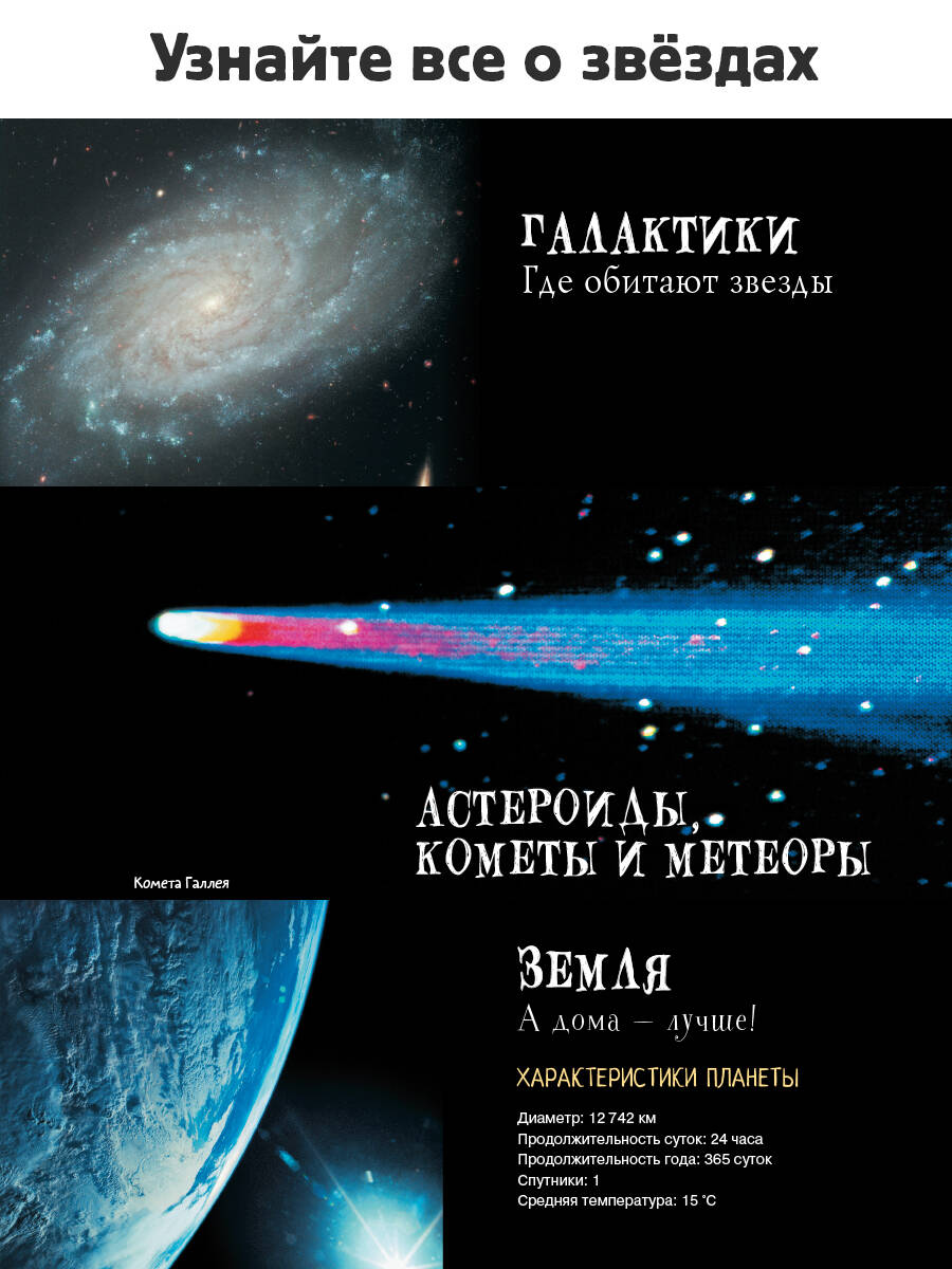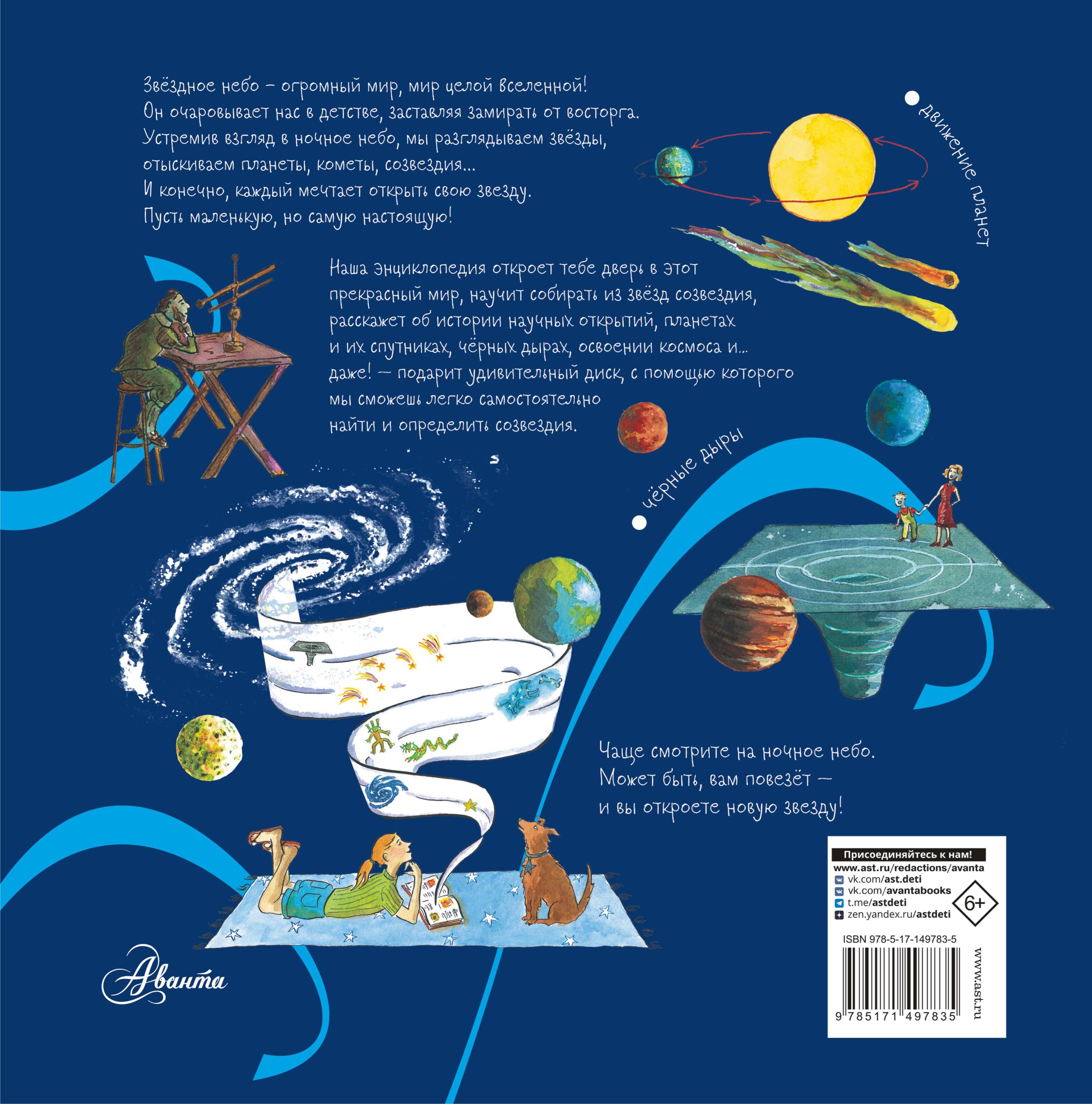 Звёздное небо - огромный мир, мир целой Вселенной! Он очаровывает нас в детстве, заставляя замирать от восторга. Устремив взгляд в ночное небо, мы разглядываем звёзды, отыскиваем созвездия ... Наша книга расскажет юным читателям о самых интересных из них, а еще о планетах и их спутниках, метеорах и кометах, чёрных дырах во Вселенной и многом другом. В книгу вложен дополнительные элемент - дикс, с помощью которого легко отыскать и определить созвездие на небе в любое время года. Самостоятельное определение созвездий поможет тебе на уроках физики и астрономии в школе. Энциклопедия не только расскажет о звездах и научит тебя собирать из звёзд созвездия, а также представит историю научных открытияй и освоения космоса. Чаще смотри на ночное небо и изучай созвездия с нашей книгой. Может быть, тебе повезёт - и ты найдешь свою звезду!| Издательство | ИЗДАТЕЛЬСТВО "АСТ" |