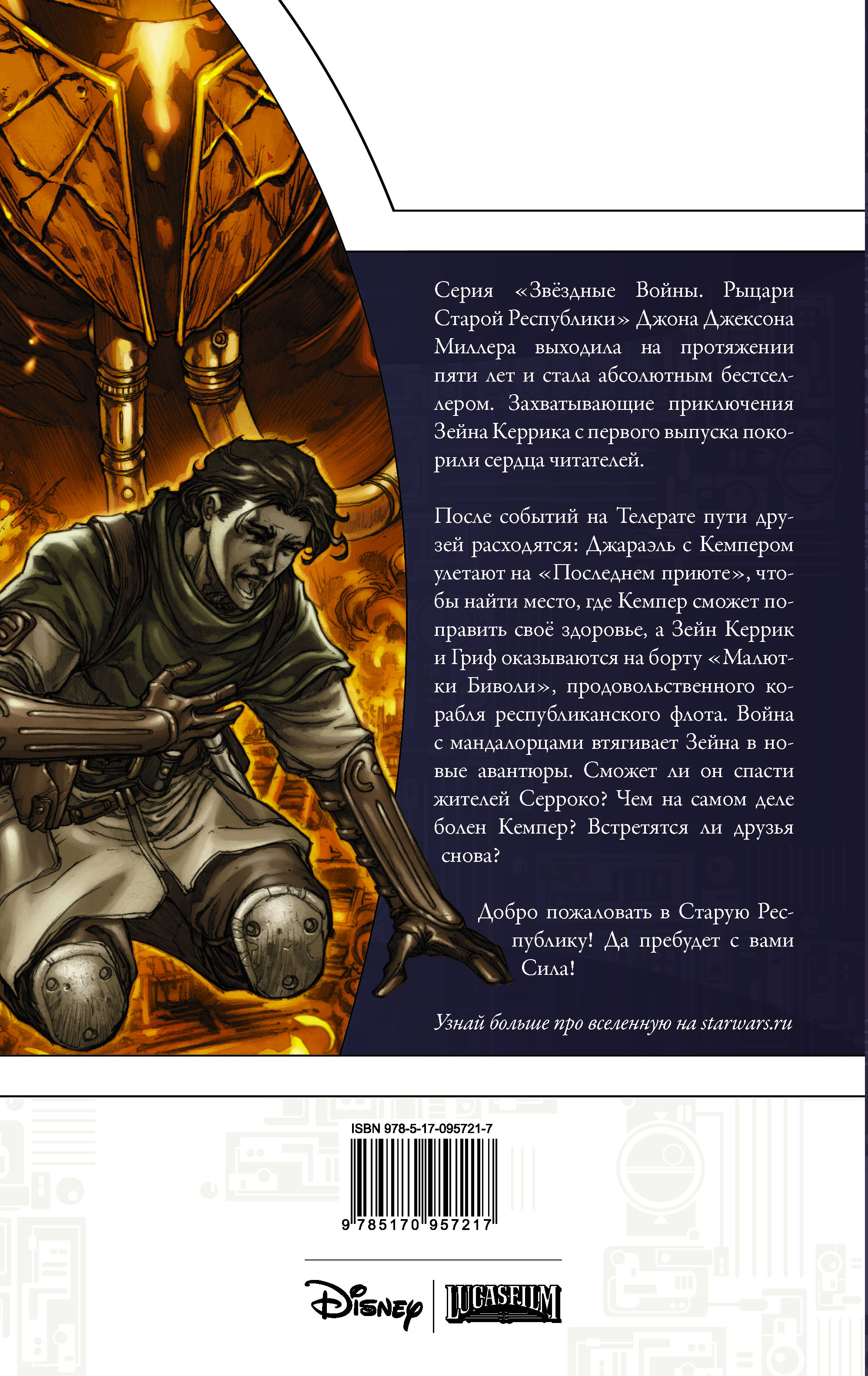 Серия "Звёздные Войны. Рыцари Старой Республики" Джона Джексона Миллера выходила на протяжении пяти лет и стала абсолютным бестселлером. Захватывающие приключения Зейна Керрика с первого выпуска покорили сердца читателей. После событий на Телерате пути друзей расходятся: Джараэль с Кемпером улетают на "Последнем приюте", чтобы найти место, где Кемпер сможет поправить своё здоровье, а Зейн Керрик и Гриф оказываются на борту "Малютки Биволи", продовольственного корабля республиканского флота. Война с мандалорцами втягивает Зейна в новые авантюры. Сможет ли он спасти жителей Серроко? Чем на самом деле болен Кемпер? Встретятся ли друзья снова? Добро пожаловать в Старую Республику! Да пребудет с вами Сила!| Издательство | Издательство "АСТ" |