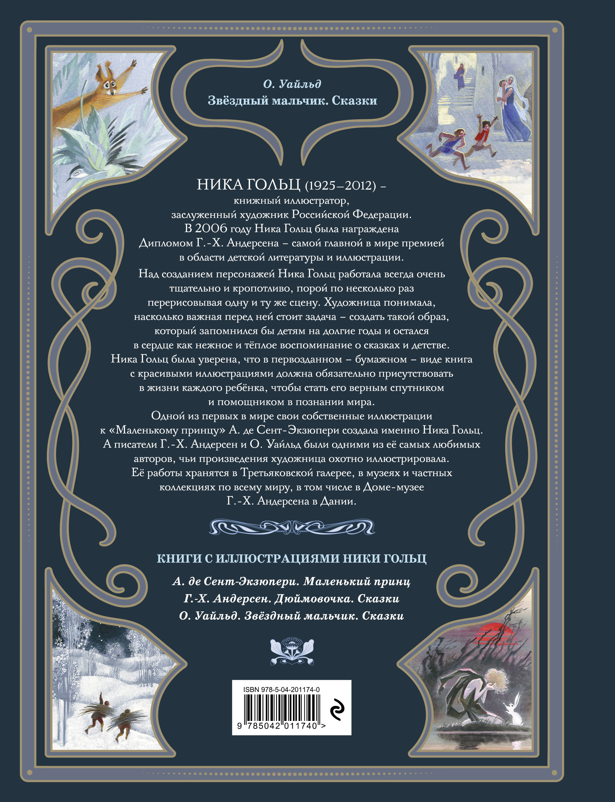Издание подарочного формата в великолепном полиграфическом исполнении. Твёрдый переплёт с выпуклыми элементами и частичным лаком. Цветные форзацы. Плотная тонированная бумага. Чёткий, крупный, хорошо читаемый шрифт. Заслуженный художник России Ника Гольц была твёрдо убеждена: бумажная книга с цветными иллюстрациями должна быть у каждого ребёнка, и потому художница особенно тщательно подходила к созданию иллюстраций. Её работы навевают на размышления о бесконечности, они окутаны покровом загадочности и таинственности, и в то же время её картины пробиваются ярким лучом радости и надежды. Впечатления, полученные от иллюстраций Ники Гольц, останутся с вами на всю жизнь. За иллюстрации к сказкам Г.-Х. Андерсена Ника Гольц была награждена Дипломом Г.-Х. Андерсена - самой главной в мире премии в области детской литературы и иллюстрации. Сказочный мир Оскара Уайльда населён самыми необычными героями: золотой мальчик, упавший с неба, живущий в прекрасном саду эгоистичный великан, возвышающаяся над городом статуя принца и многие другие диковинные персонажи. Главная ценность сказок английского писателя кроется в их искренности, богатом философском подтексте и многообразии тем, которые поднимает автор. С помощью метафор он беседует с читателем о сострадании, любви и важности испытаний для внутреннего развития. В коллекцию с иллюстрациями Ники Гольц вошли книги: А. де Сент-Экзюпери «Маленький принц», Г.-Х. Андерсен «Дюймовочка. Сказки» и О. Уайльд «Звёздный мальчик. Сказки».| Издательство | ООО "Издательство "Эксмо" |
